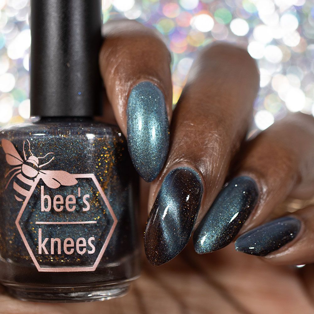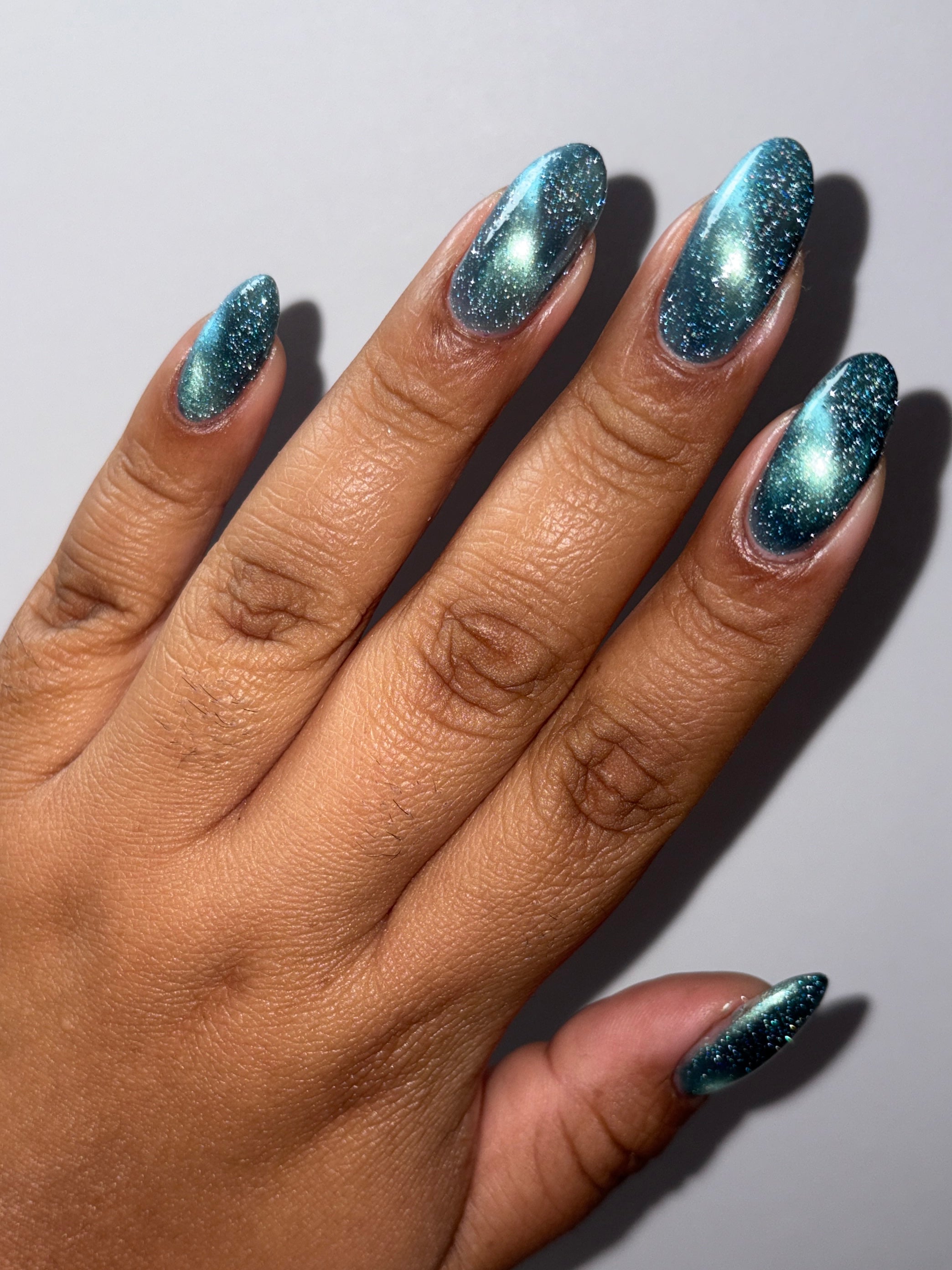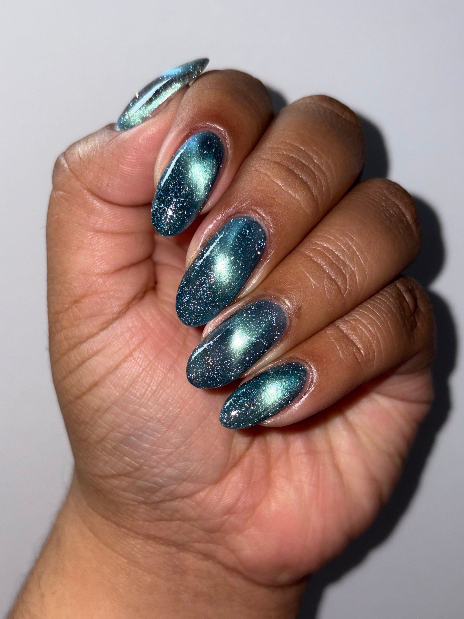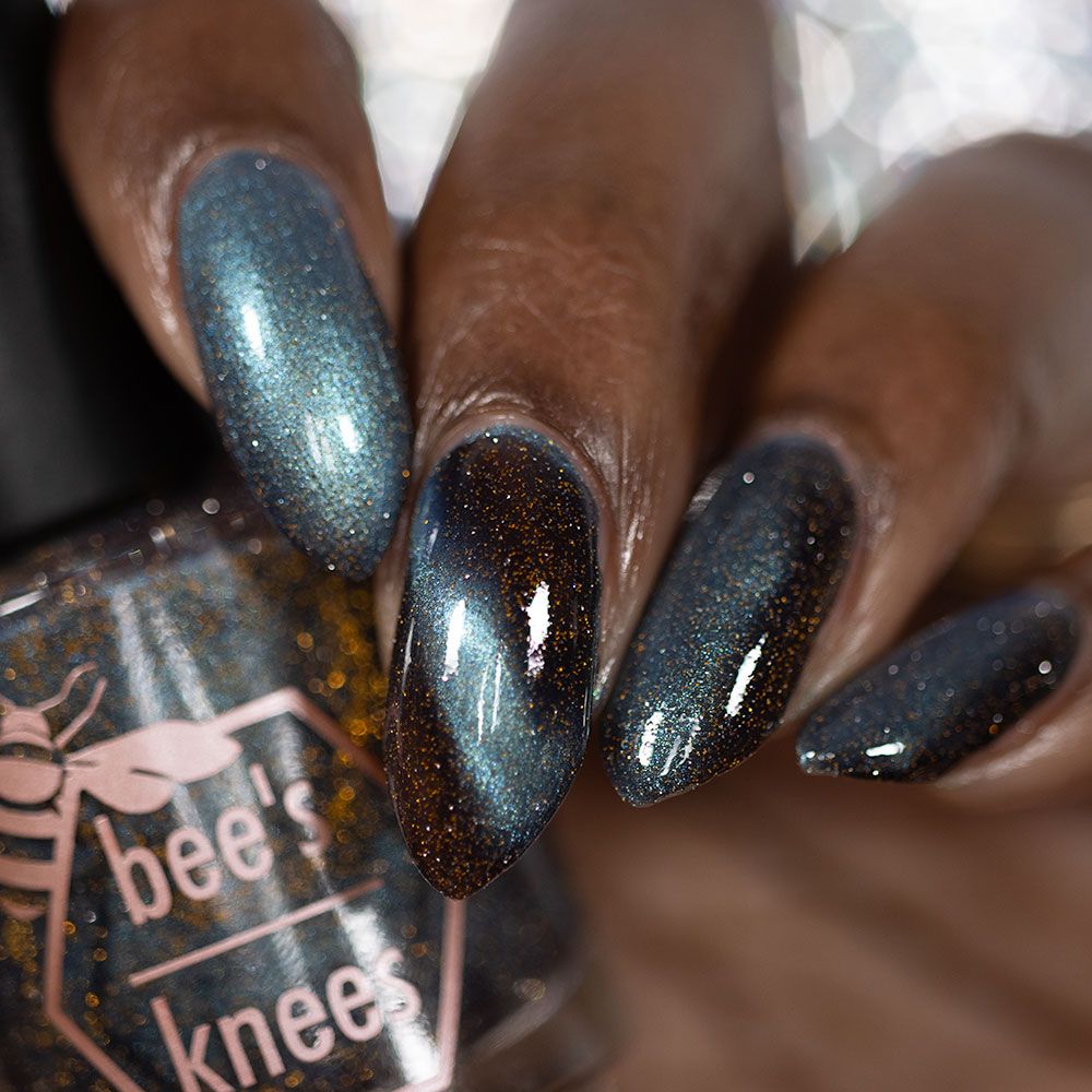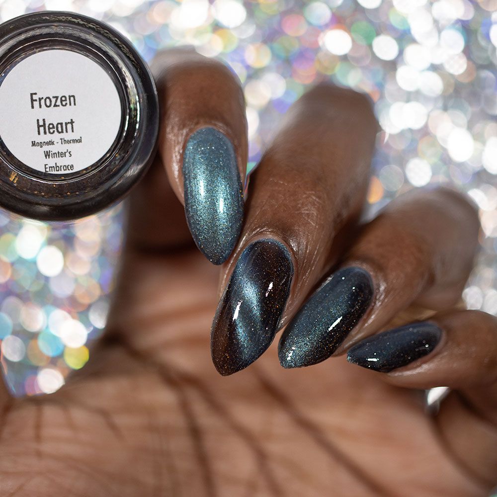 Frozen Heart - a burgundy polish with blue magnetic shimmer and gold light reflective glitter.