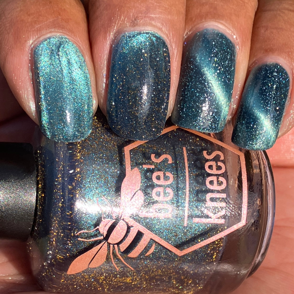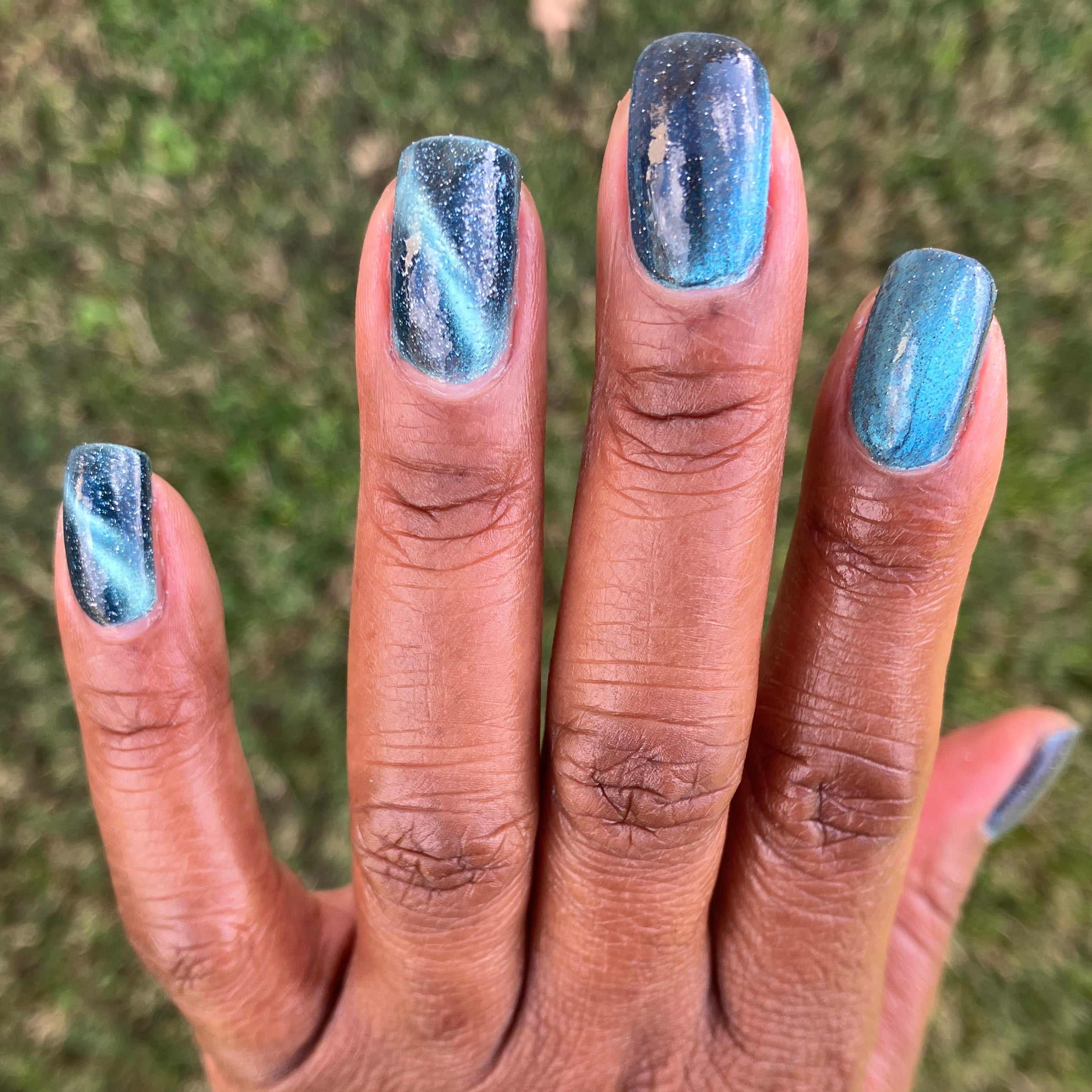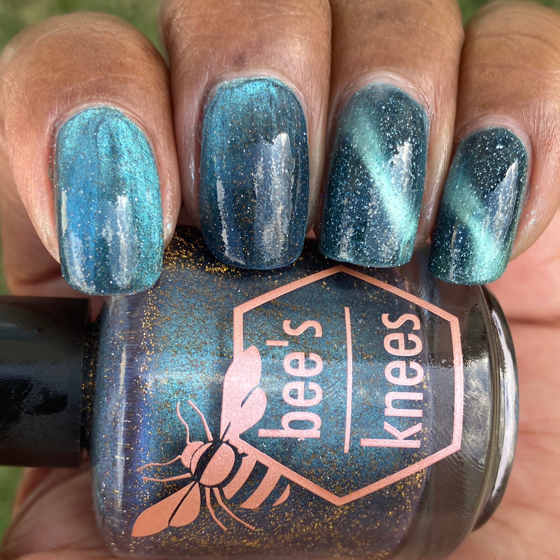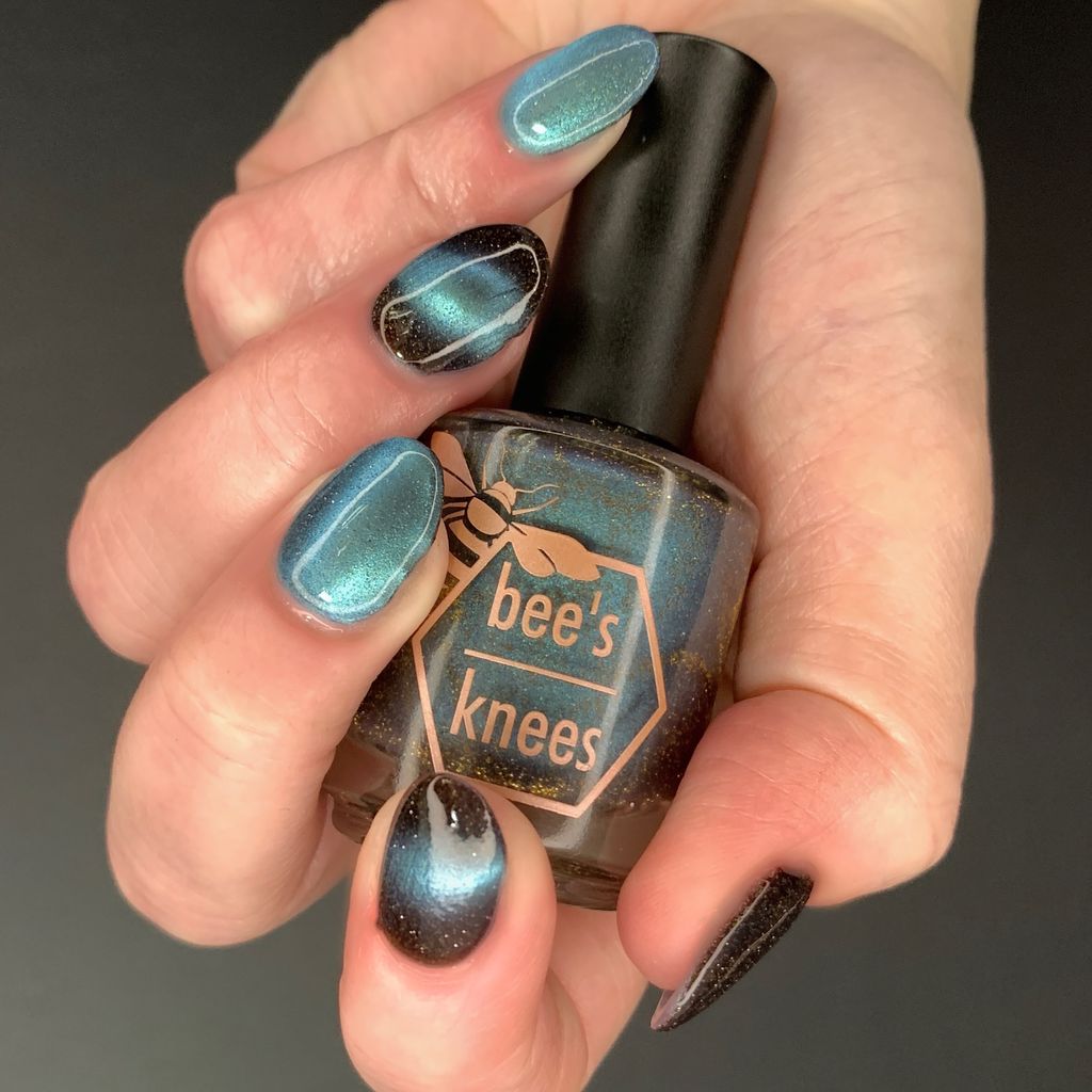 Frozen Heart - a burgundy polish with blue magnetic shimmer and gold light reflective glitter.