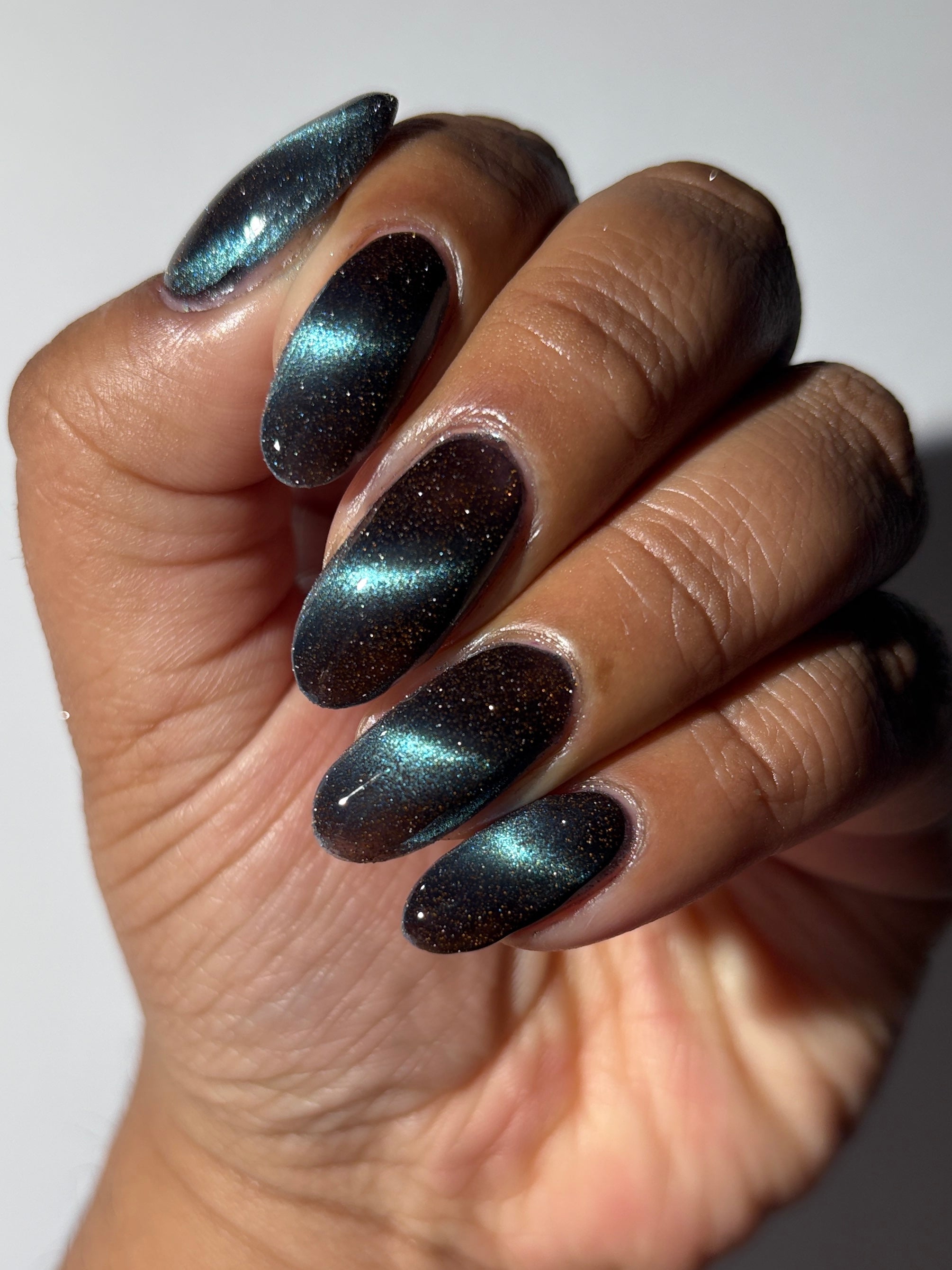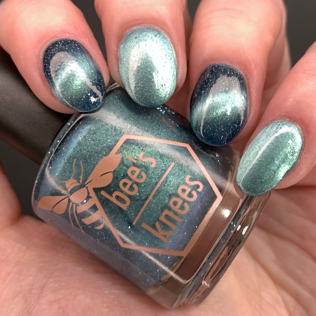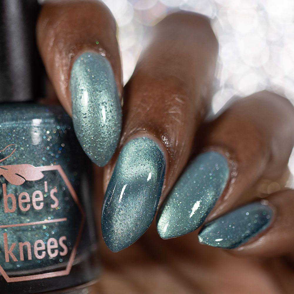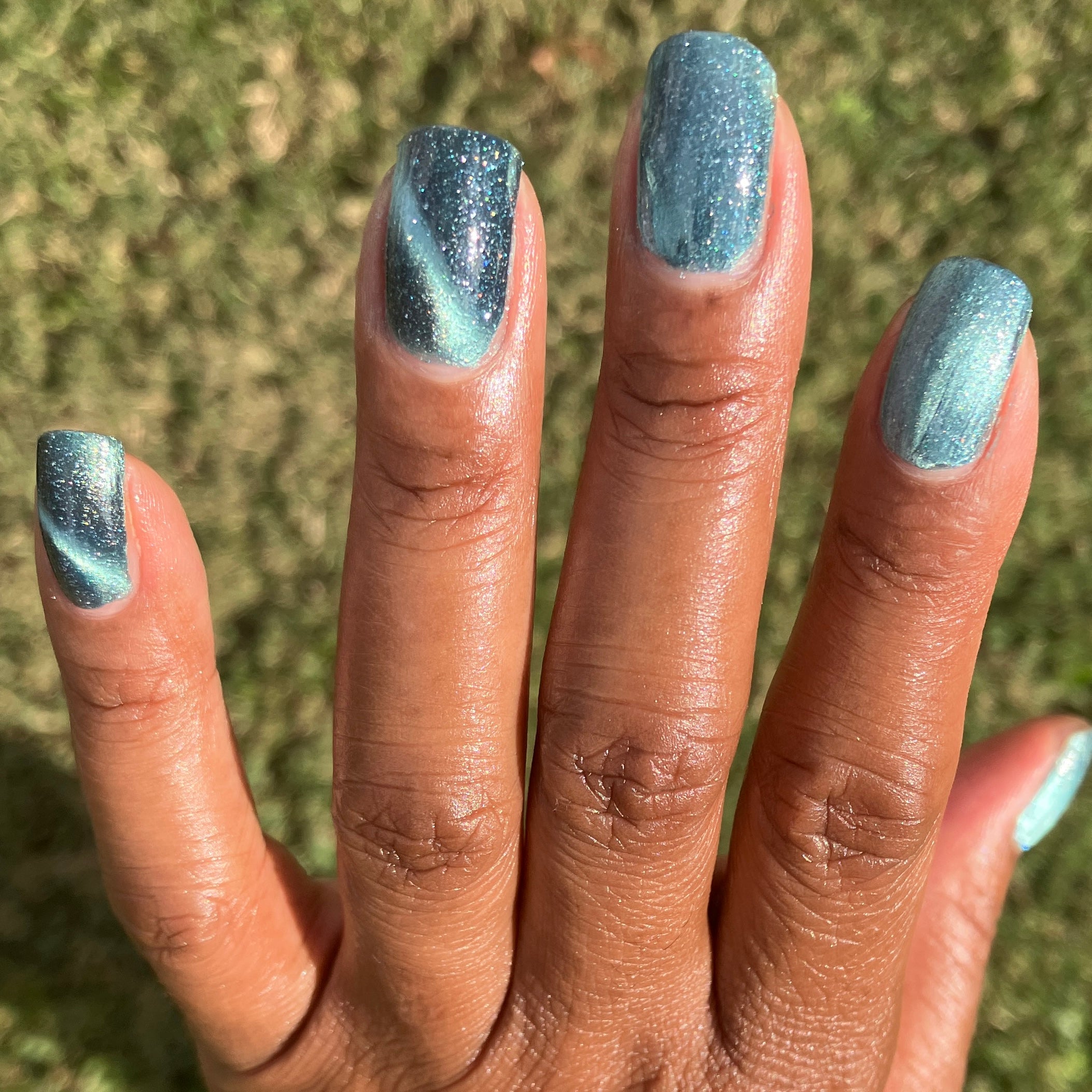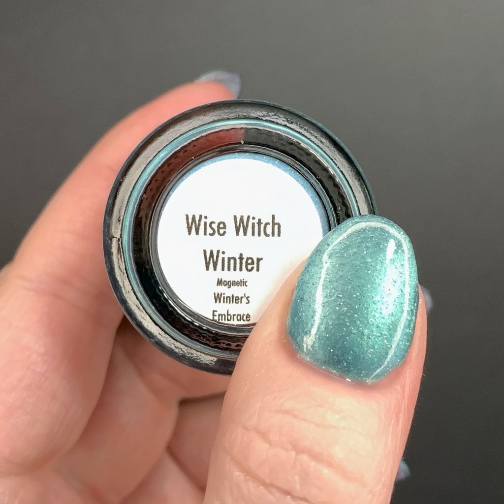 Wise Witch Winter - a cool blue base with icy blue magnetic shimmer as well as holo flakes and silver and sapphire light reflective glitter. *note - will have a thicker formula because of the glitter*