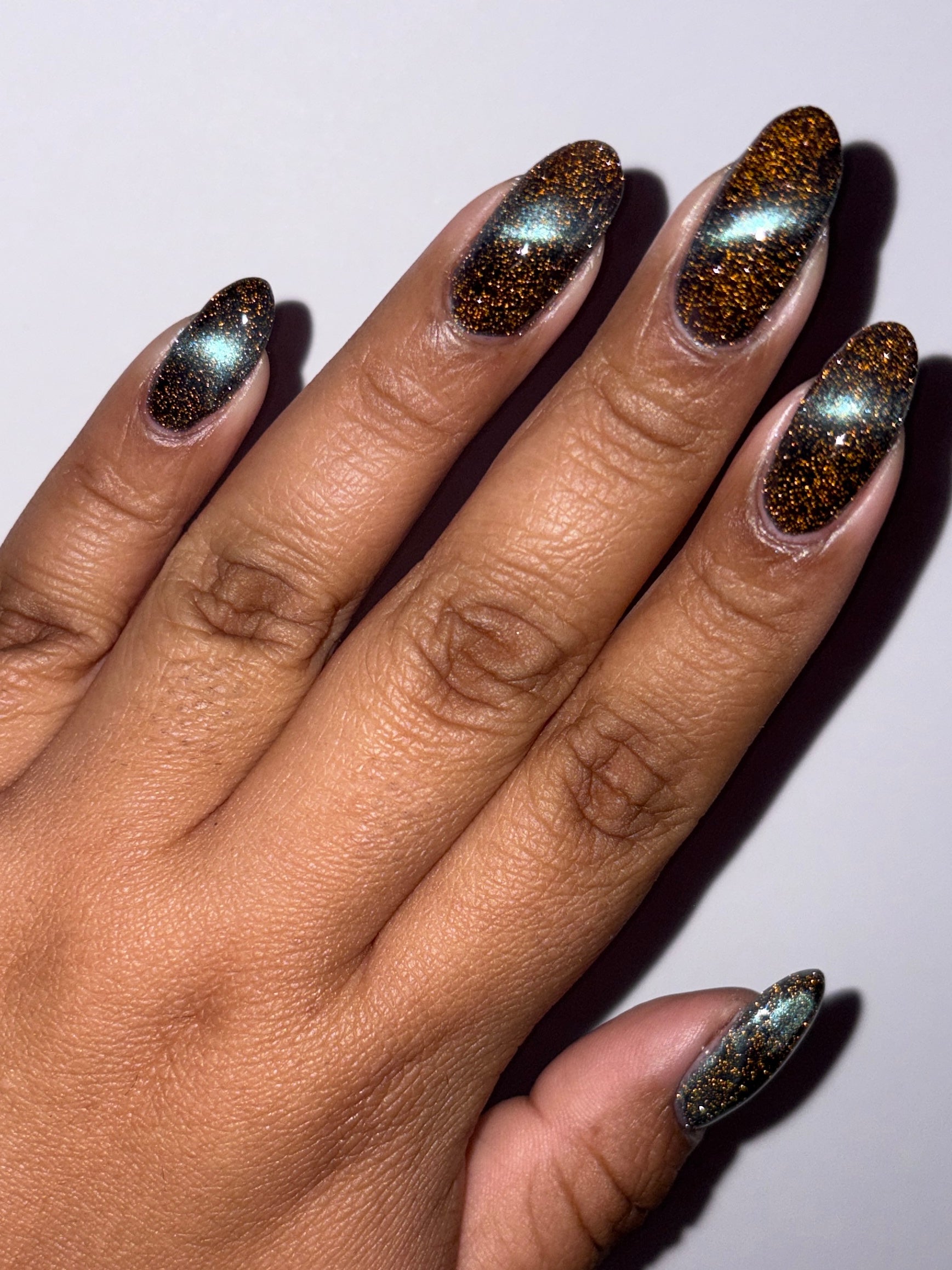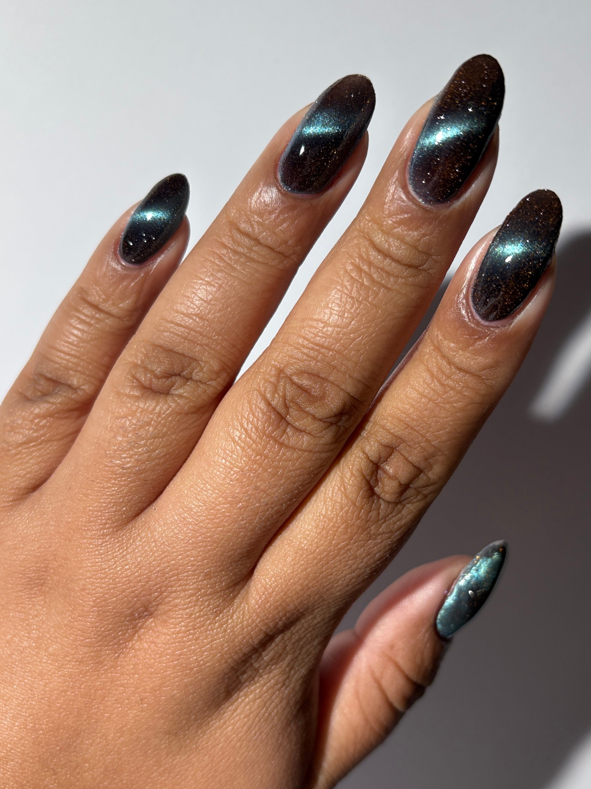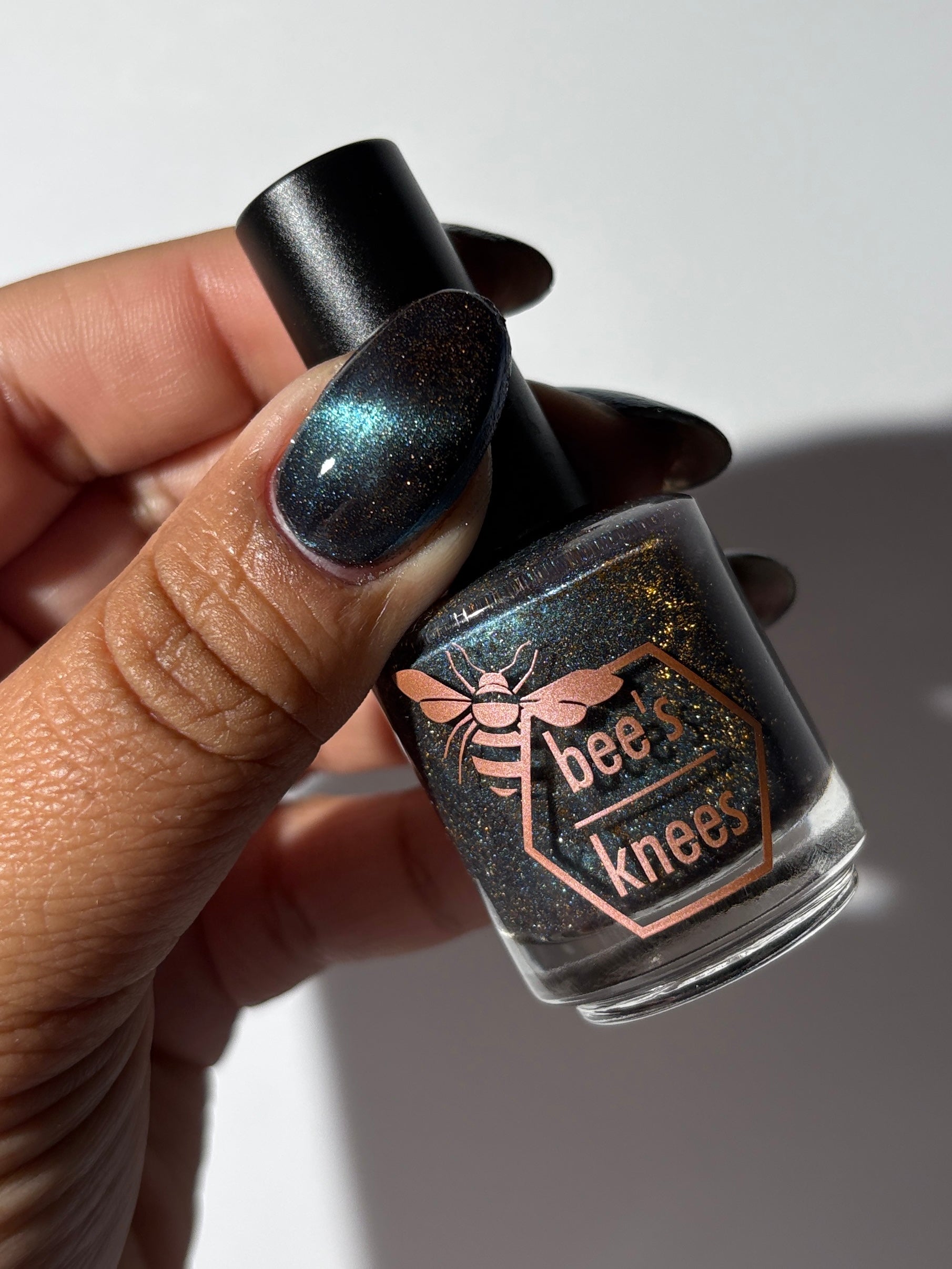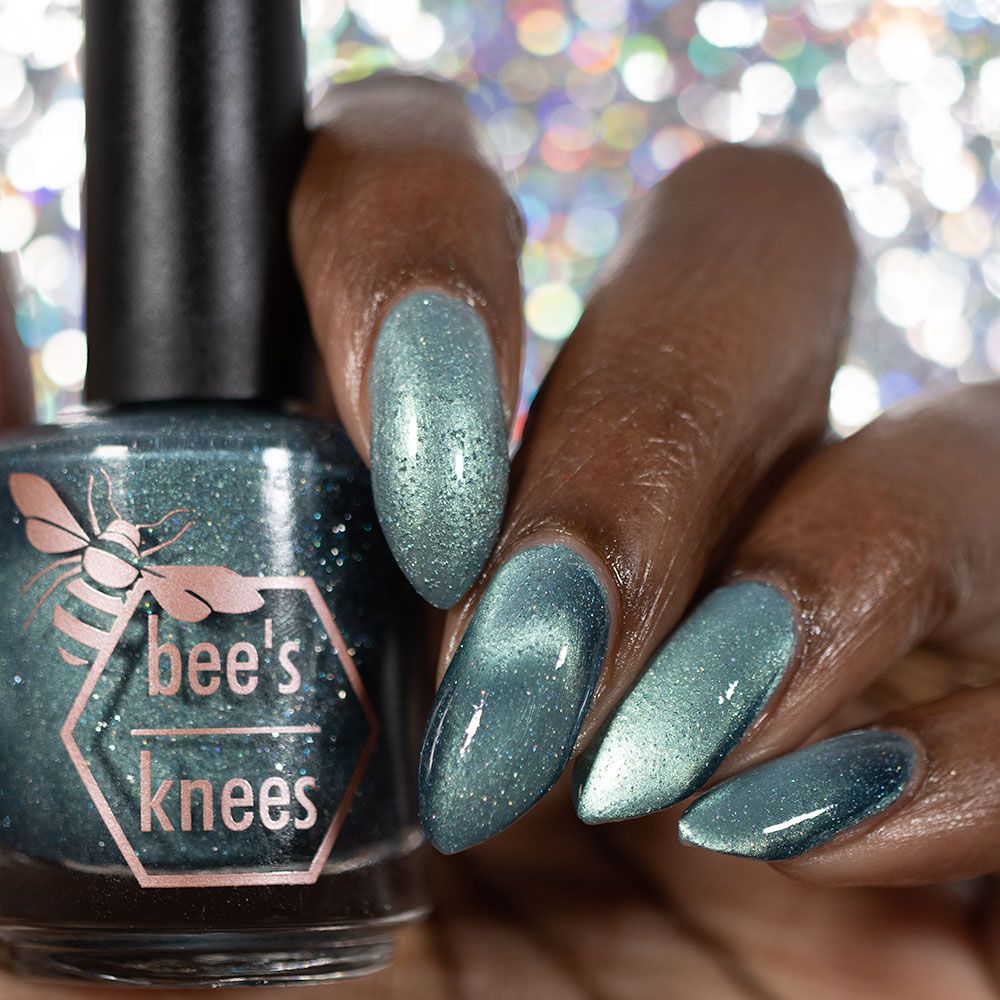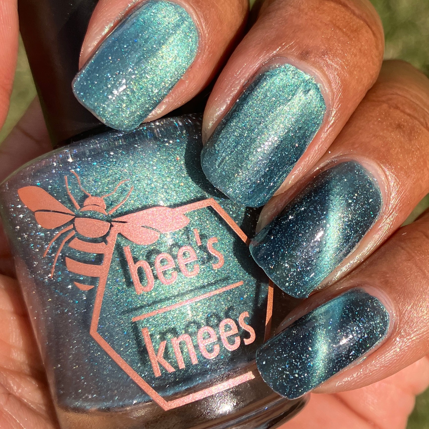 Wise Witch Winter - a cool blue base with icy blue magnetic shimmer as well as holo flakes and silver and sapphire light reflective glitter. *note - will have a thicker formula because of the glitter*