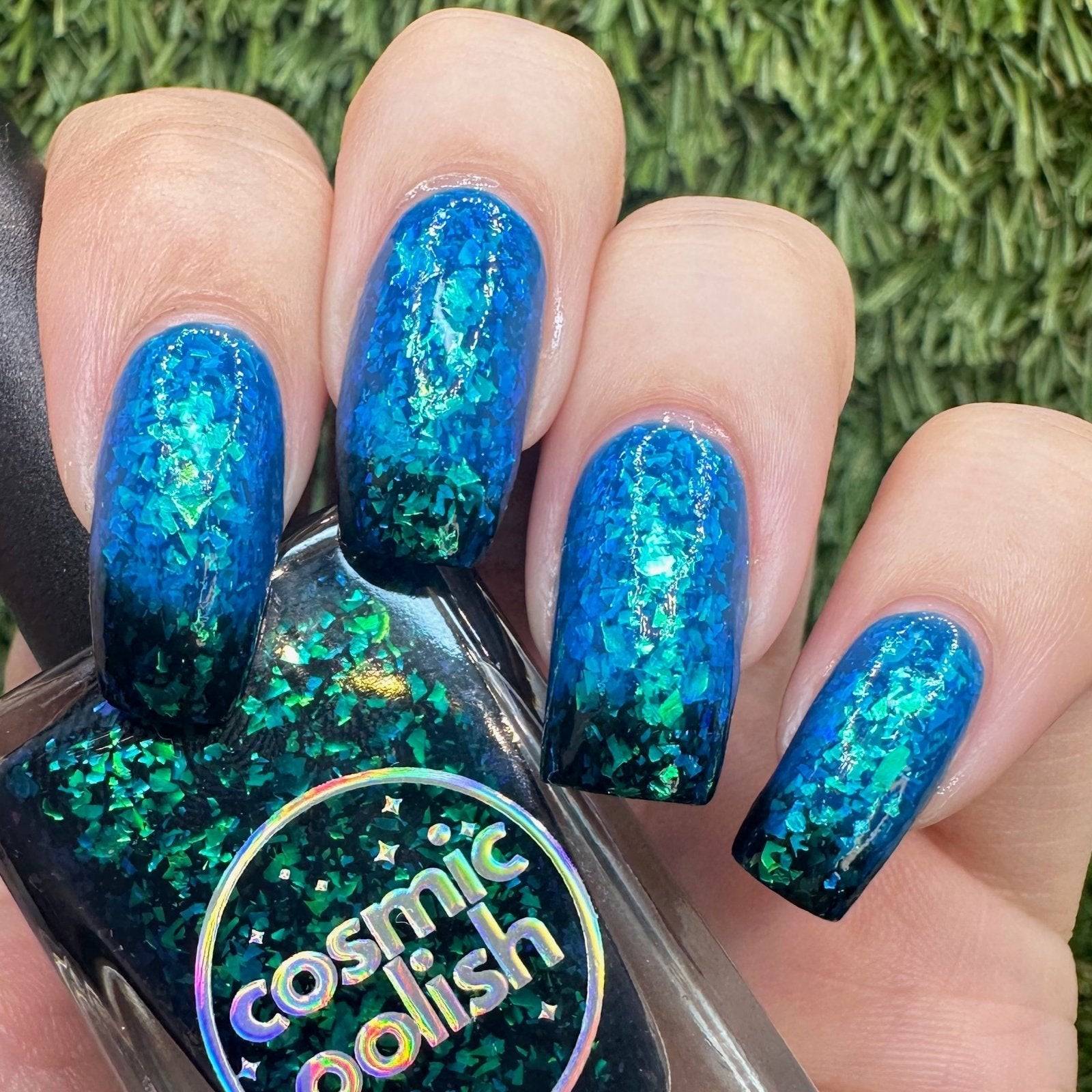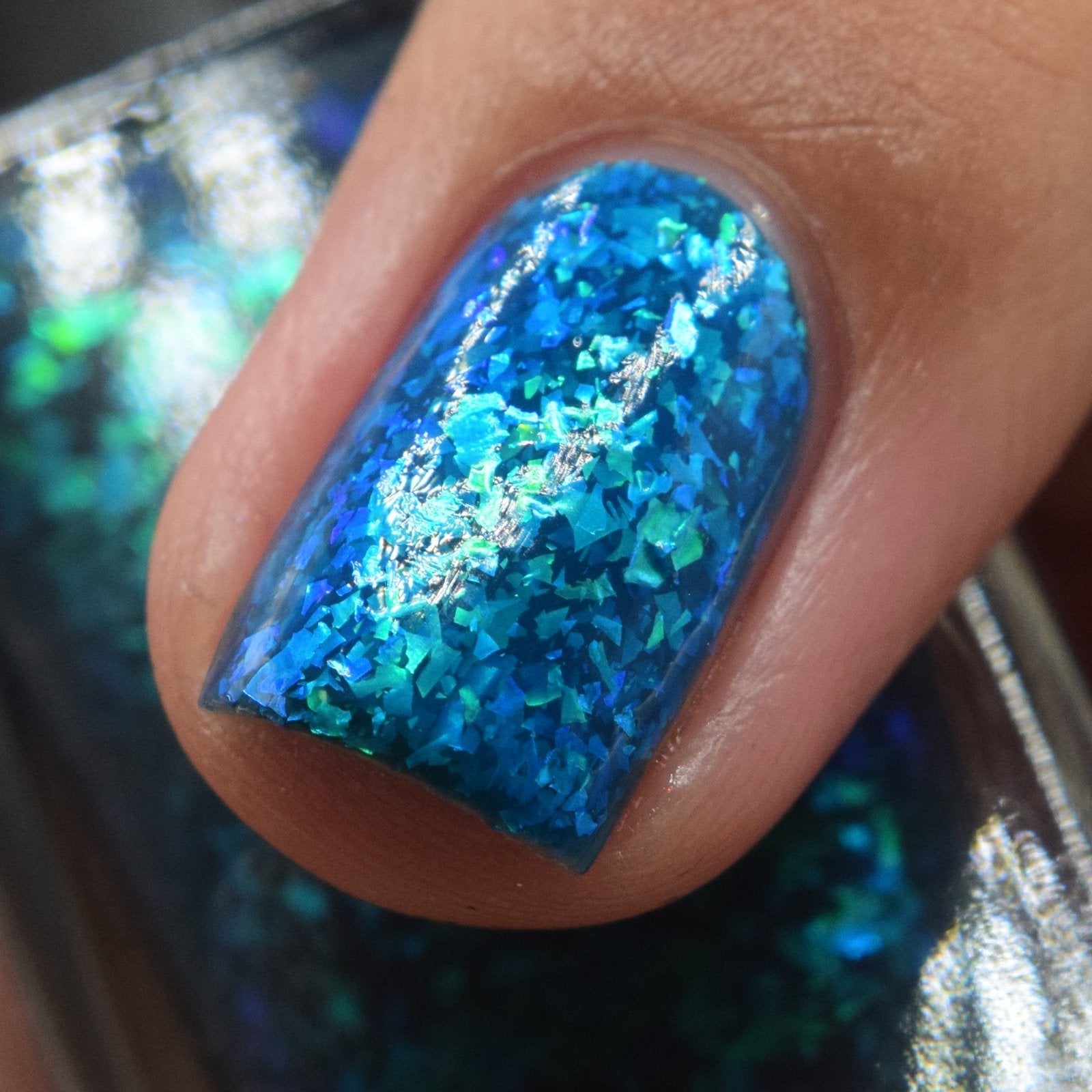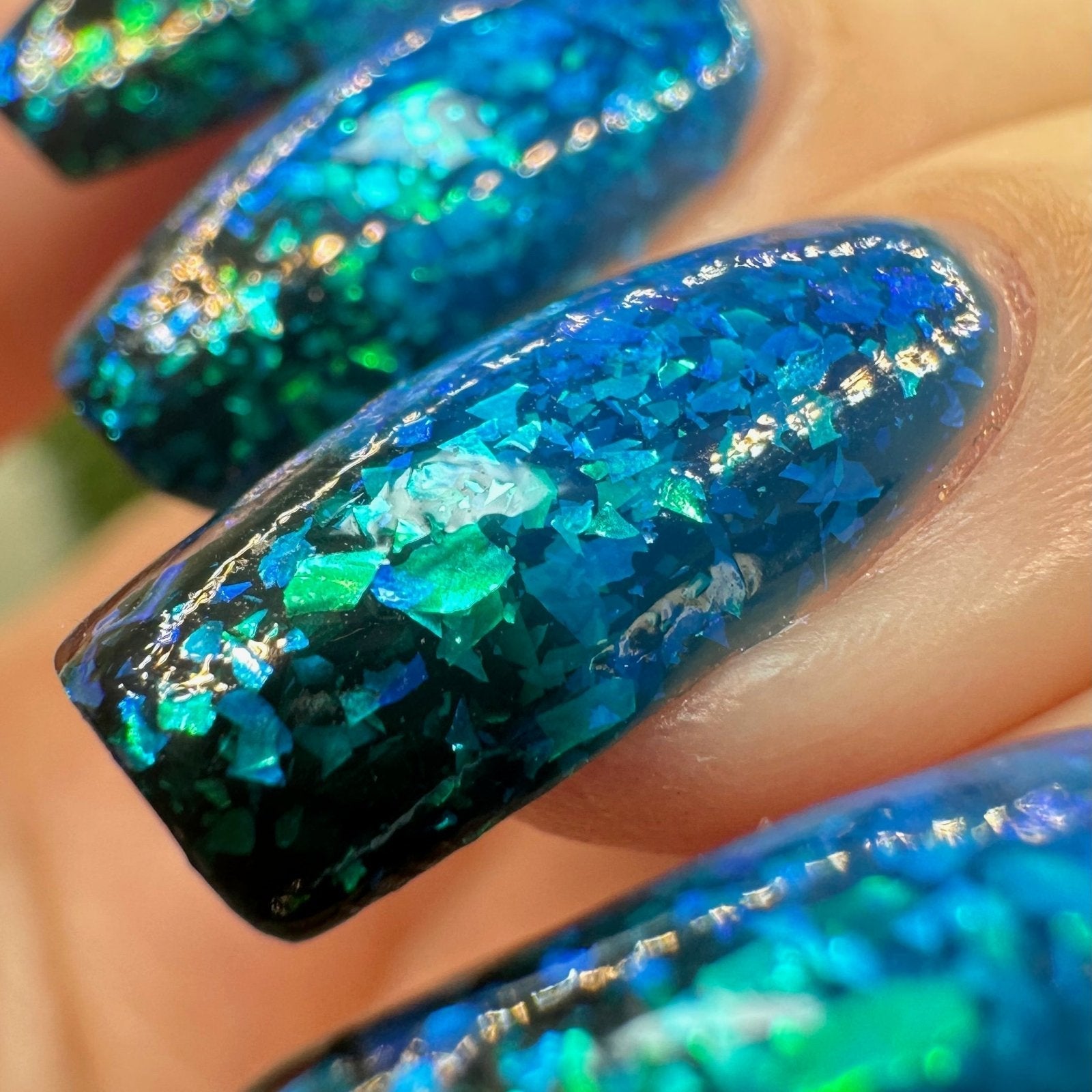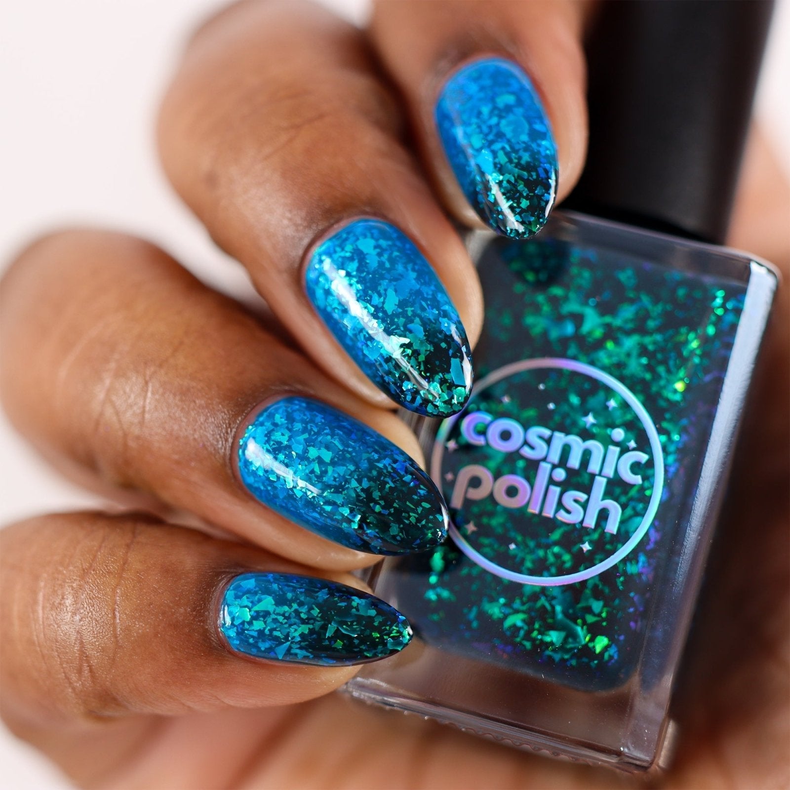 Hidden Depths is a thermal polish with a blue base and bright iridescent green to blue flakes that shifts from a dark teal in the cold state to a glowy light blue-leaning teal in the warm state.