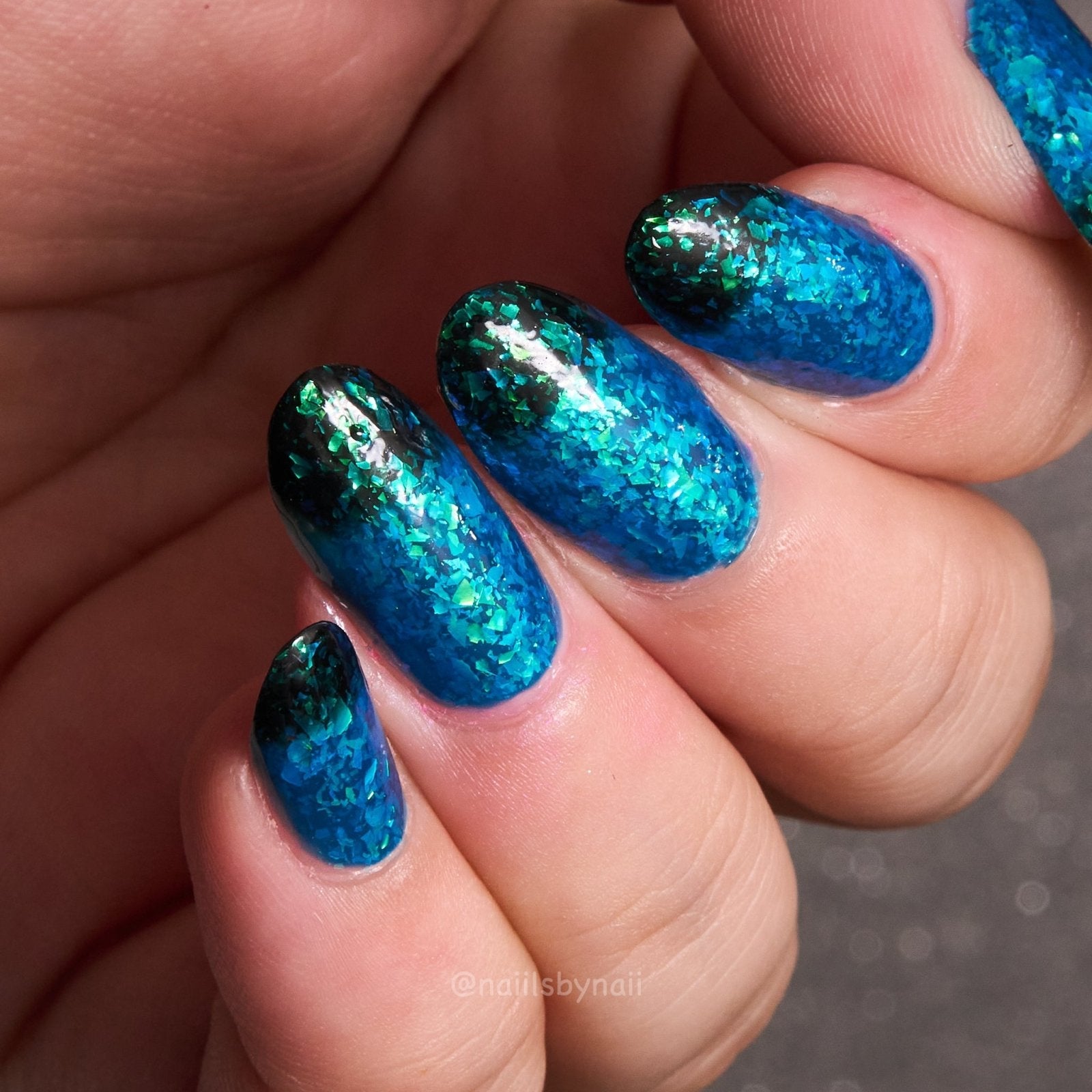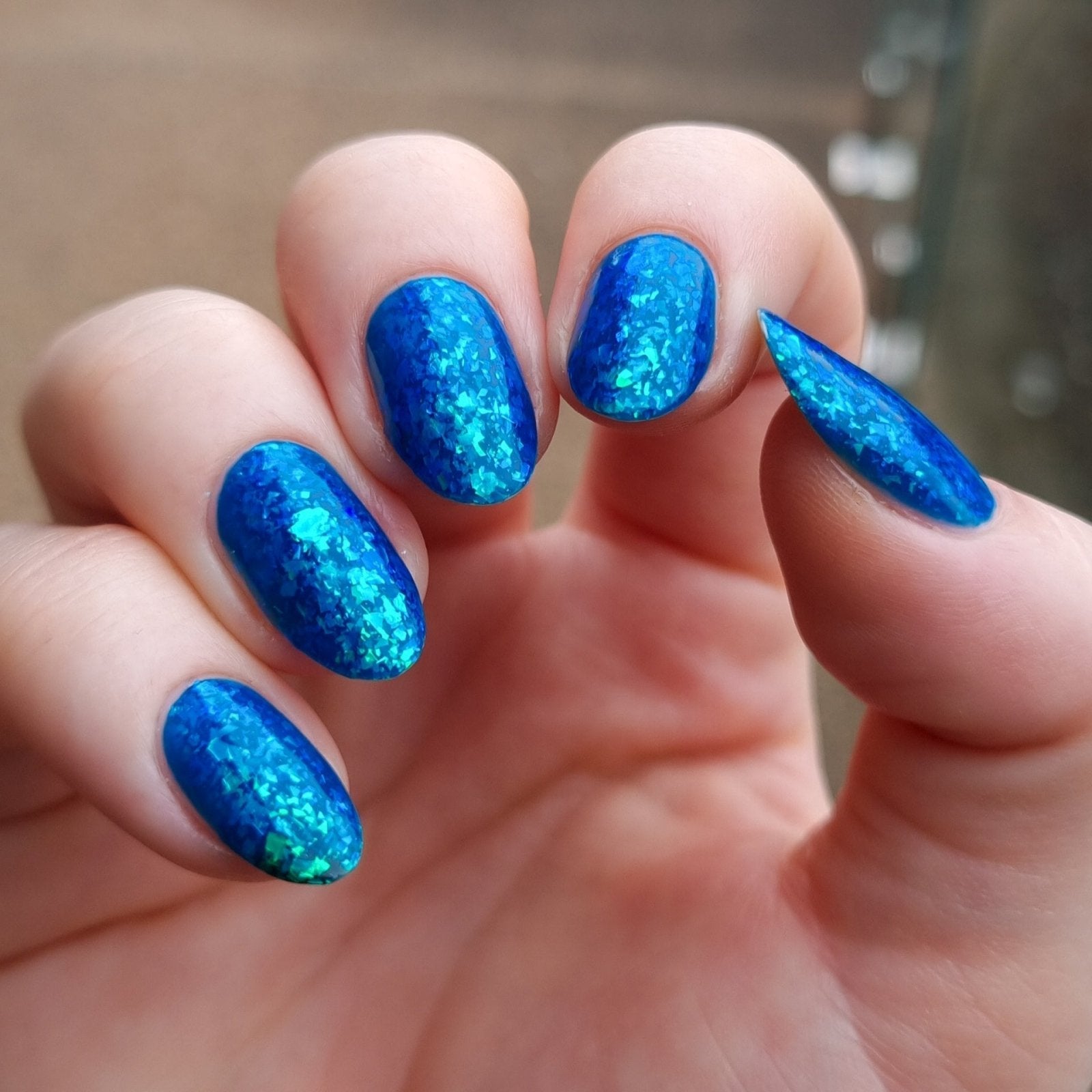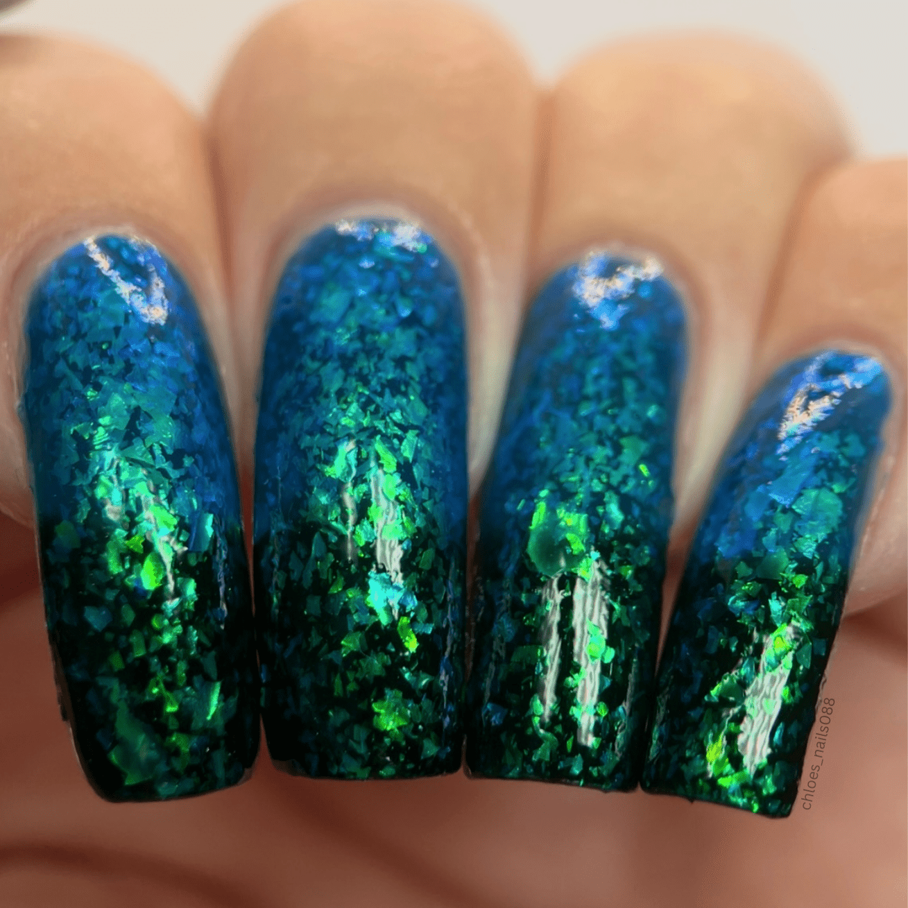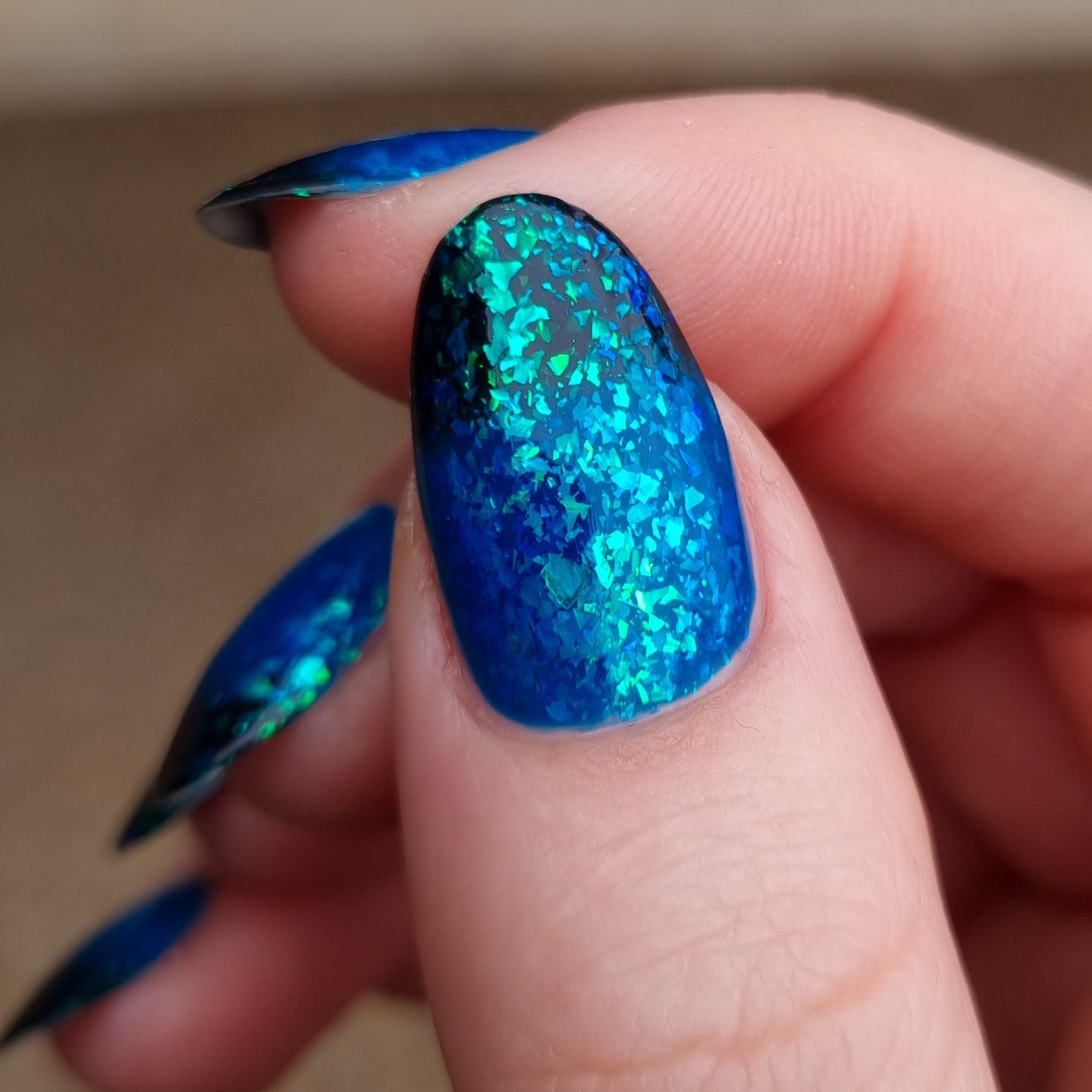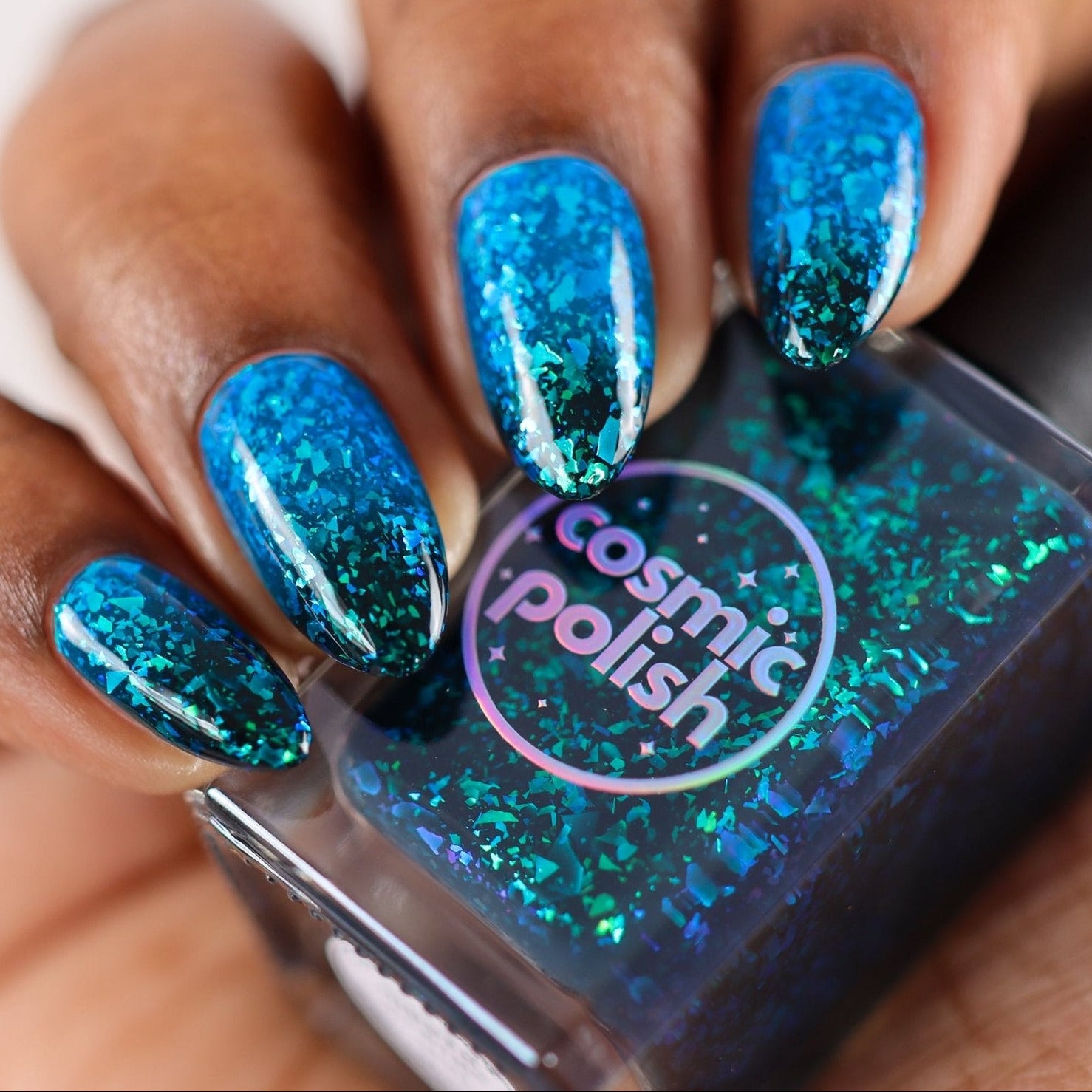 Hidden Depths is a thermal polish with a blue base and bright iridescent green to blue flakes that shifts from a dark teal in the cold state to a glowy light blue-leaning teal in the warm state.
