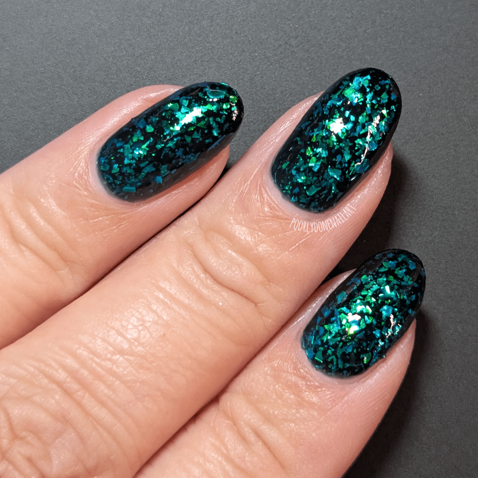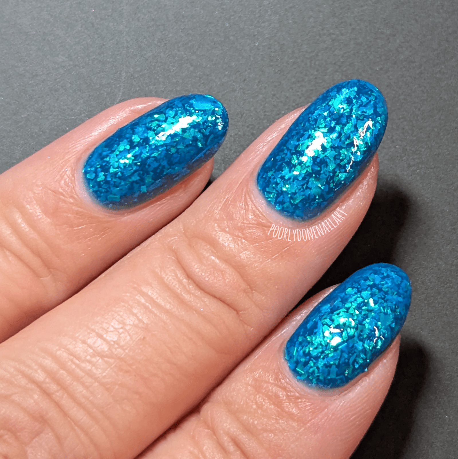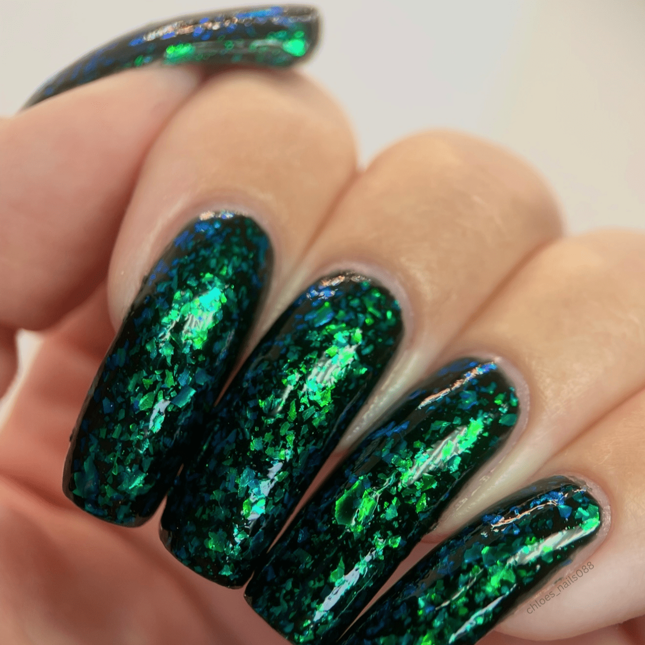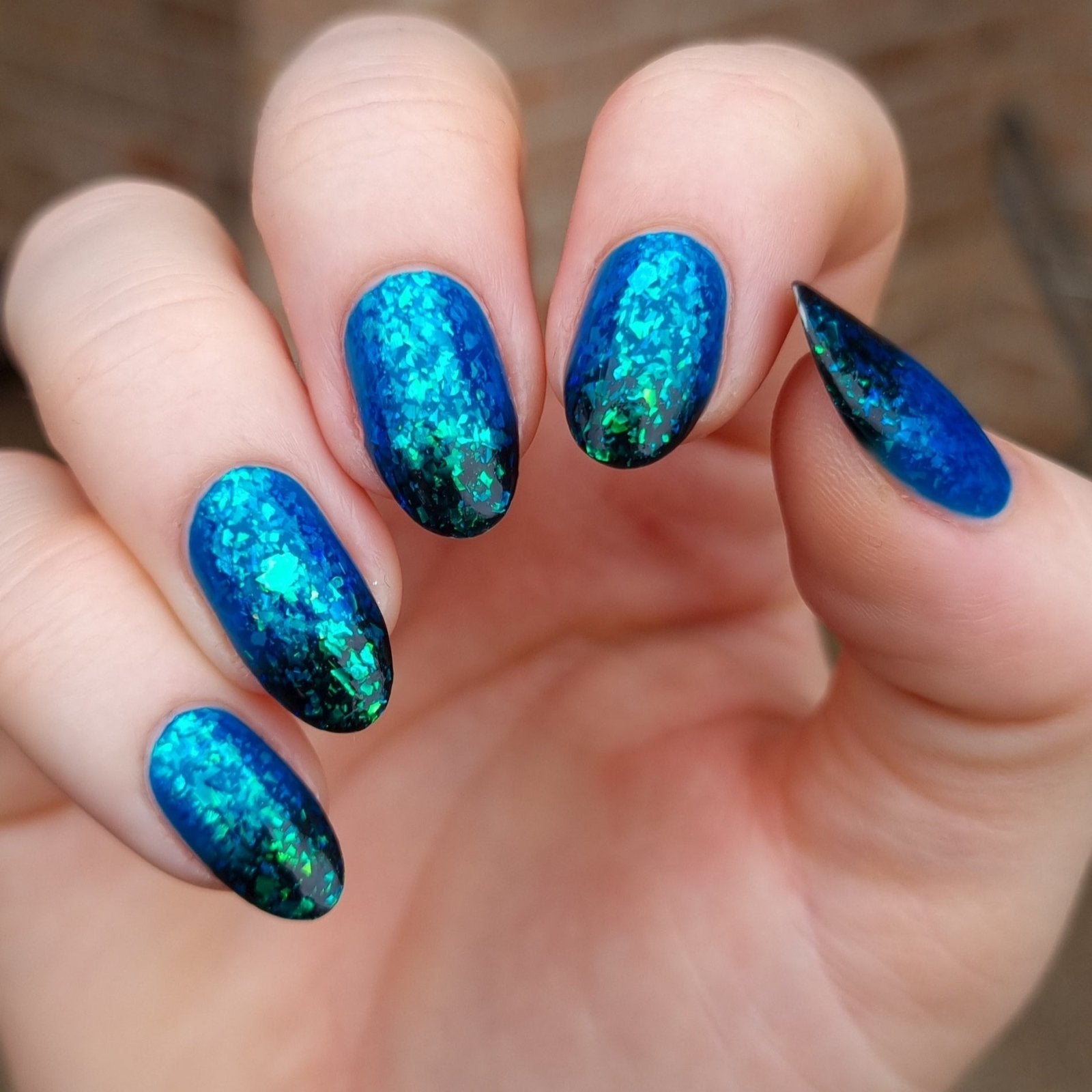 Hidden Depths is a thermal polish with a blue base and bright iridescent green to blue flakes that shifts from a dark teal in the cold state to a glowy light blue-leaning teal in the warm state.