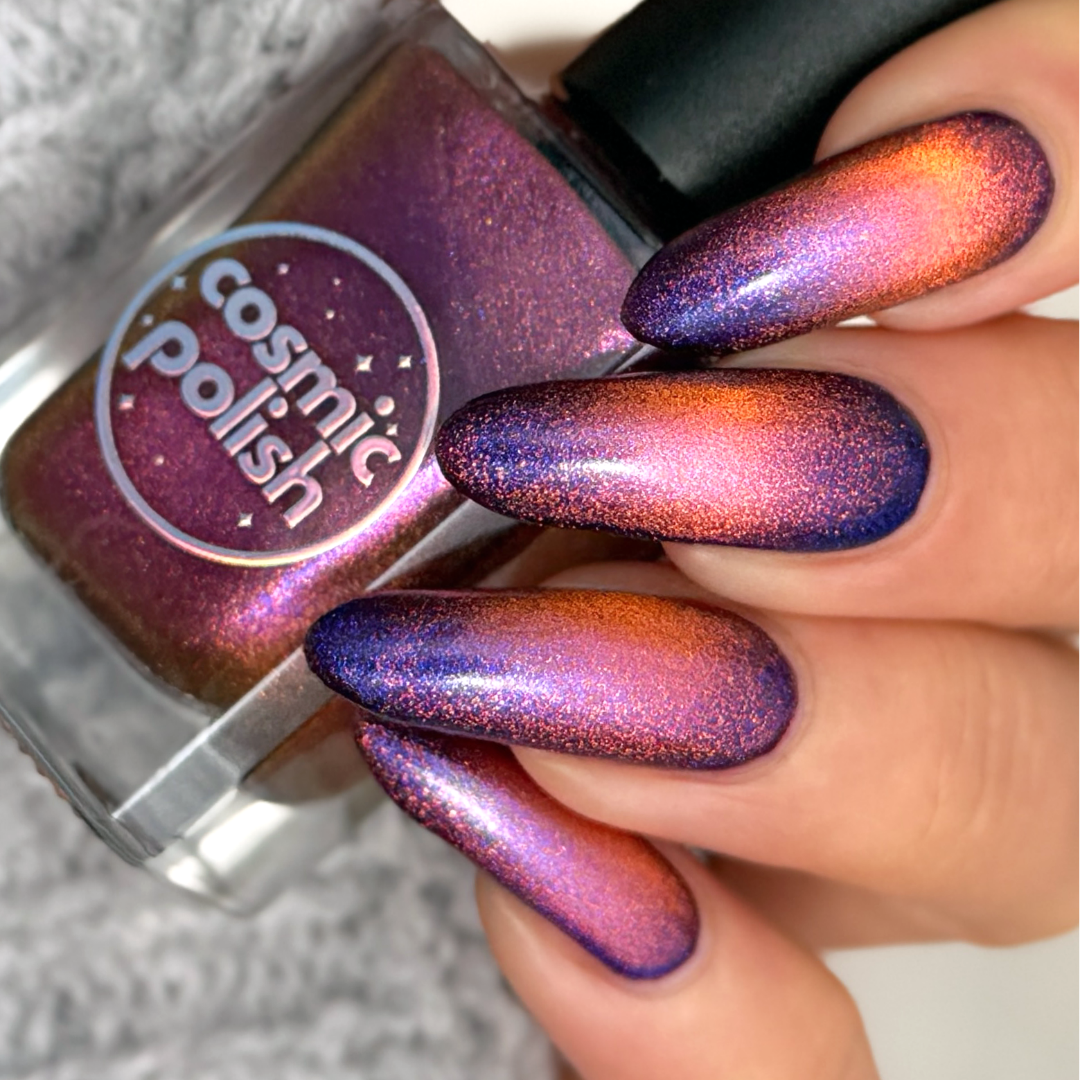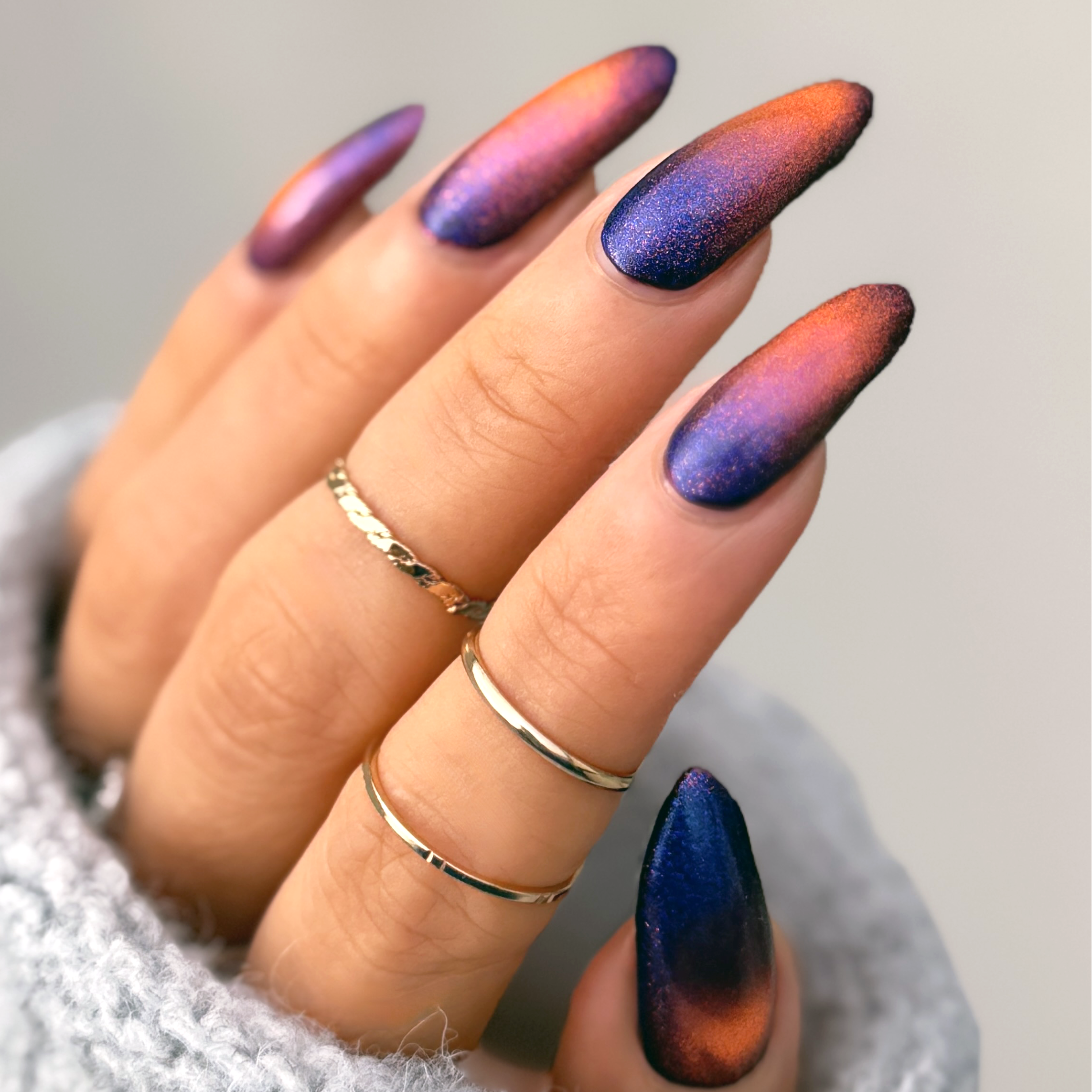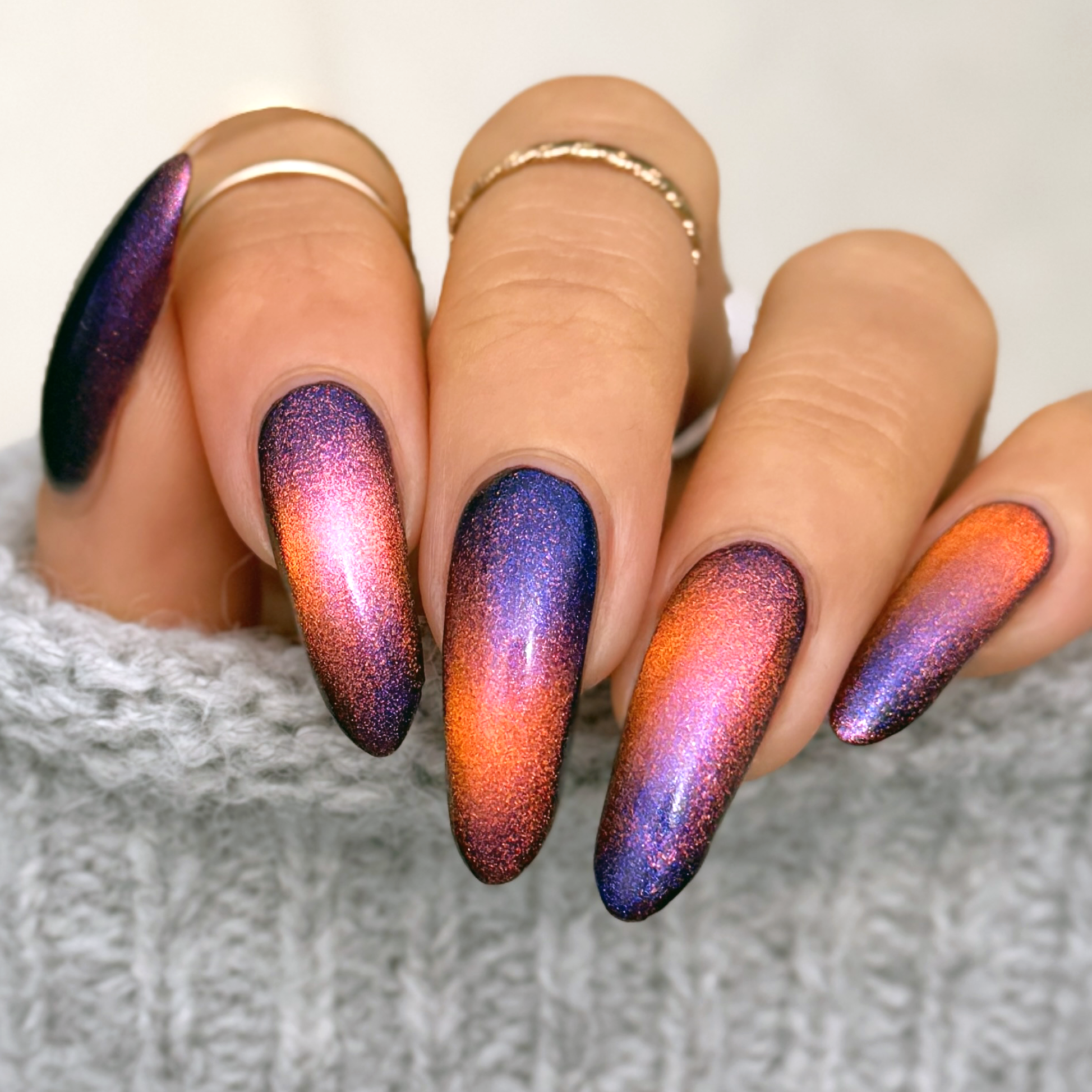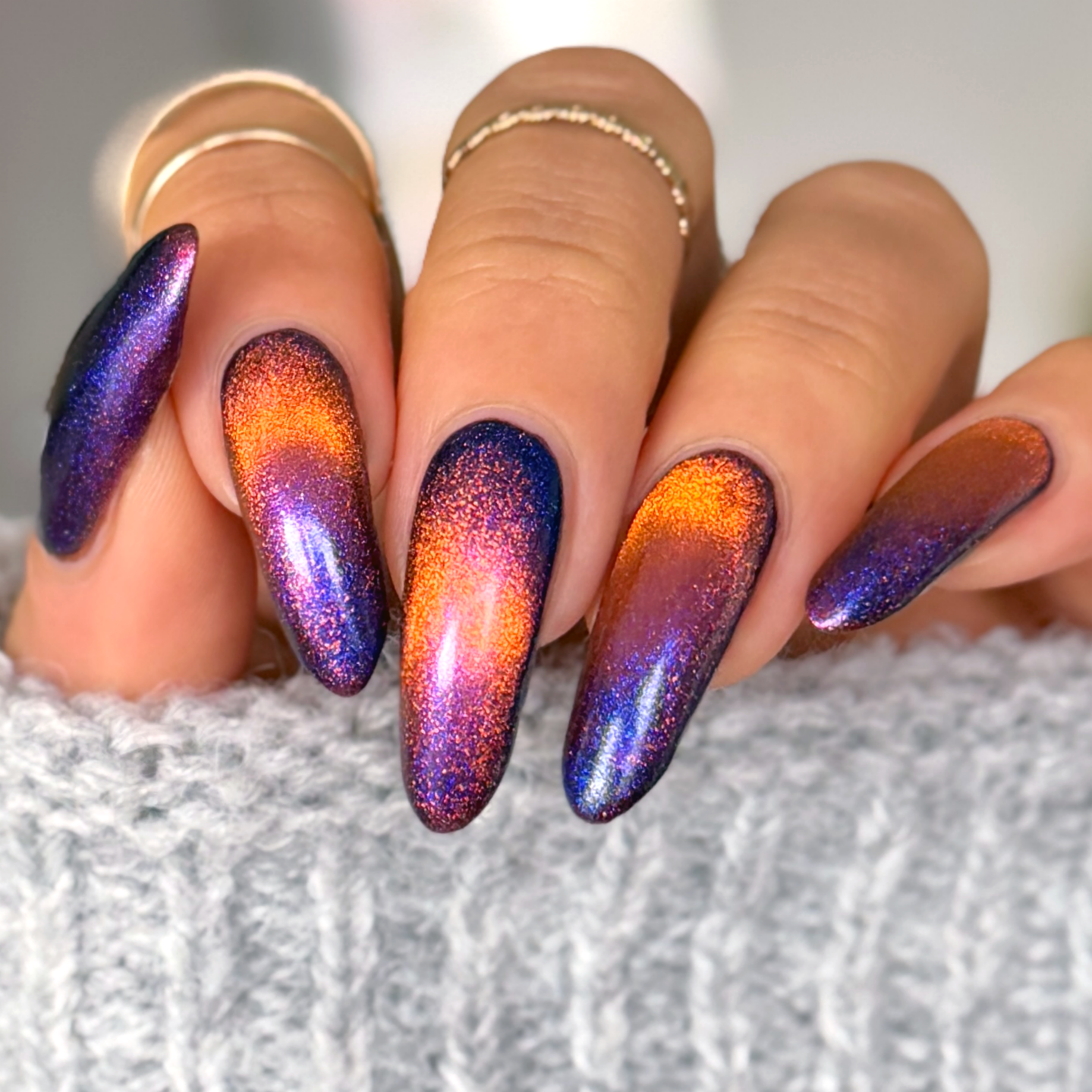 Shimmering like a galaxy just out of reach, Light Years Away pulls you into its orbit with a single look. You'll find yourself mesmerised by the deep purple base with glowing blue shimmer, with a warm golden magnetic line that cuts across like a star shooting through space.