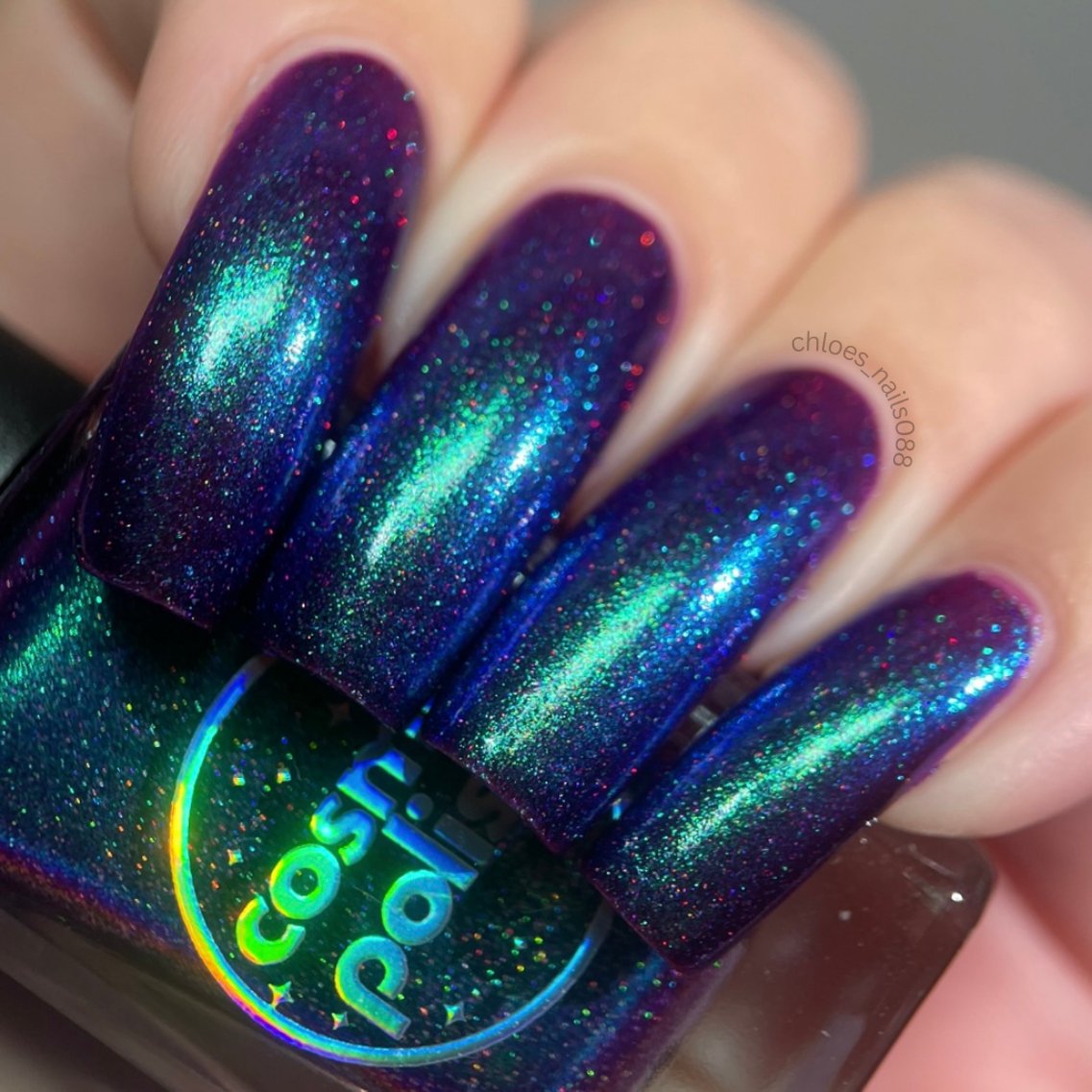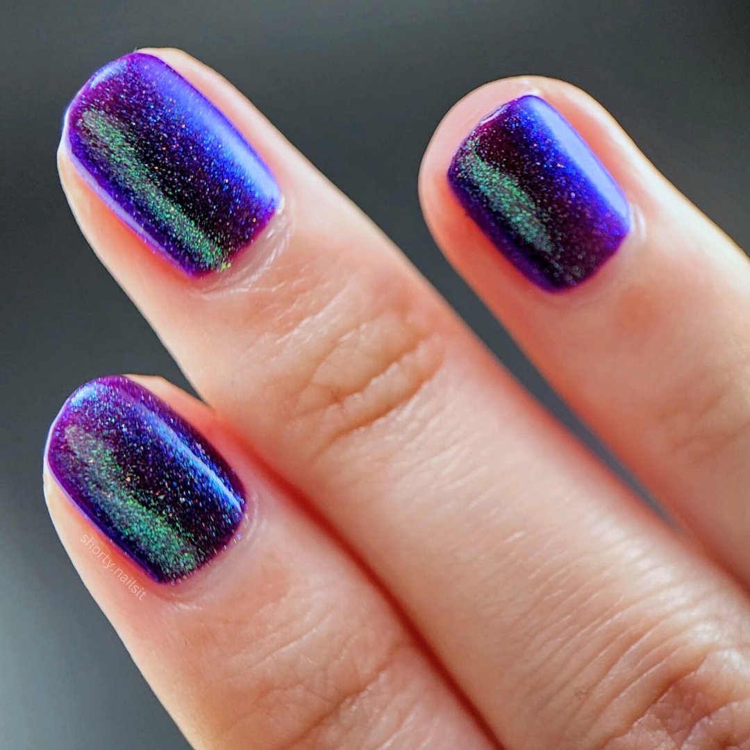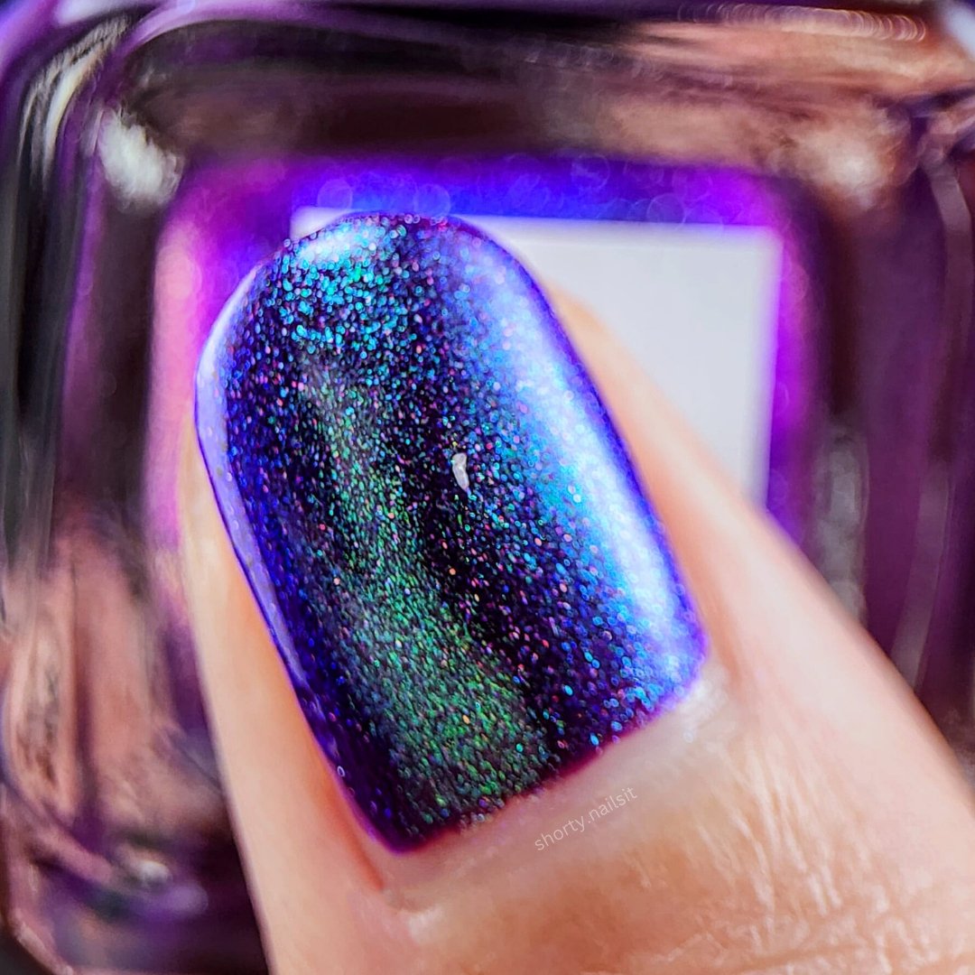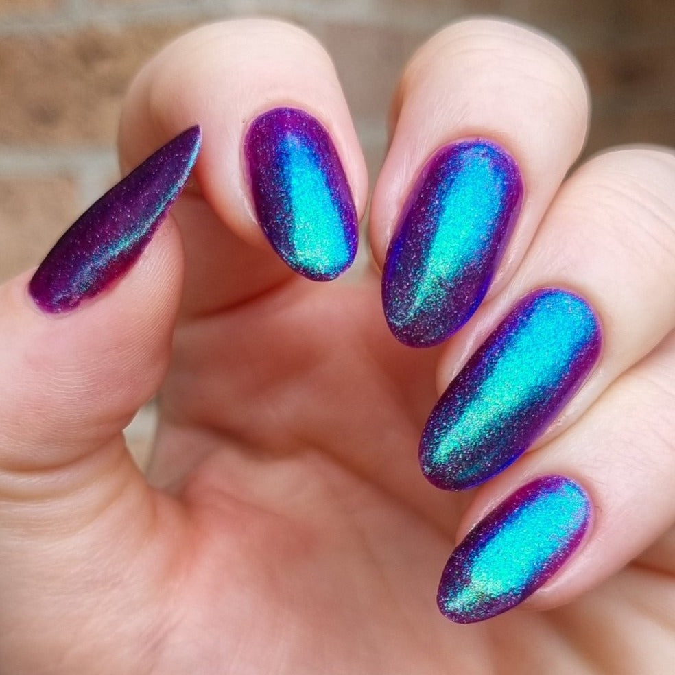 This polish is so terrifyingly beautiful it will instantly stop you in your tracks. Medusa is a purple based polish with a green to teal to blue shifting shimmer and scattered holo. Leave a trail of petrified admirers behind you!