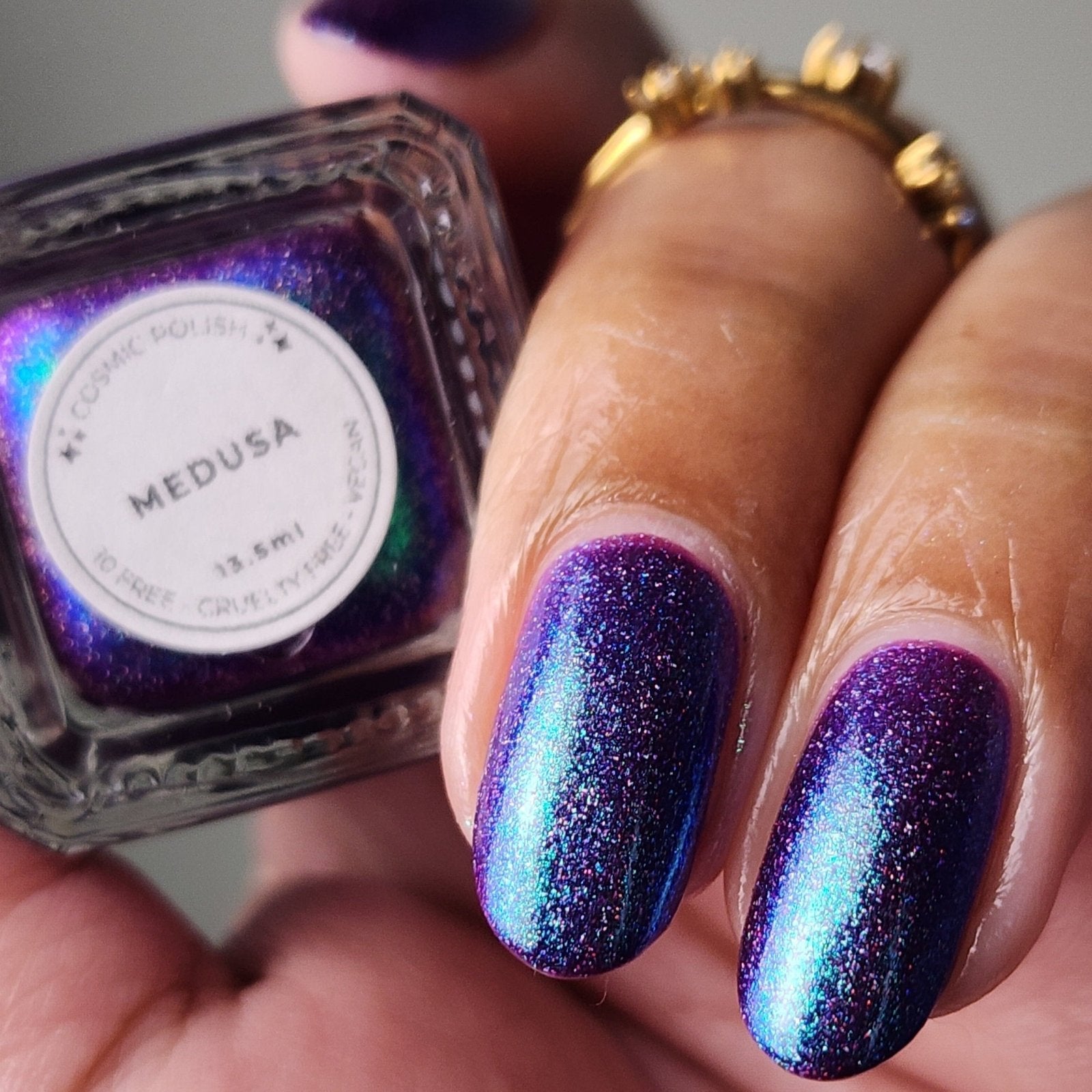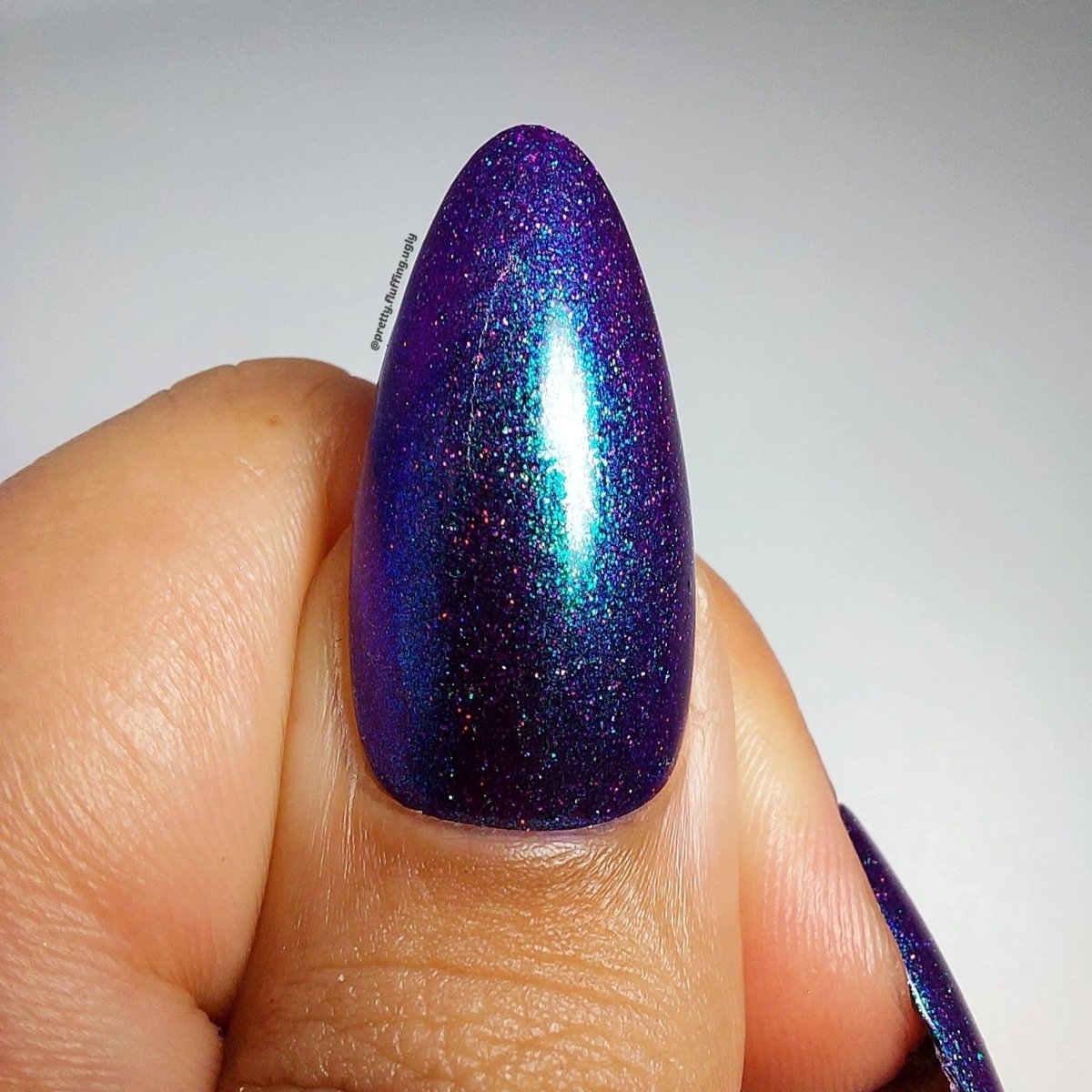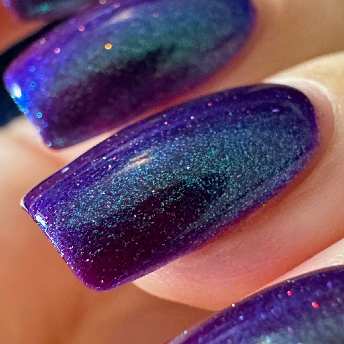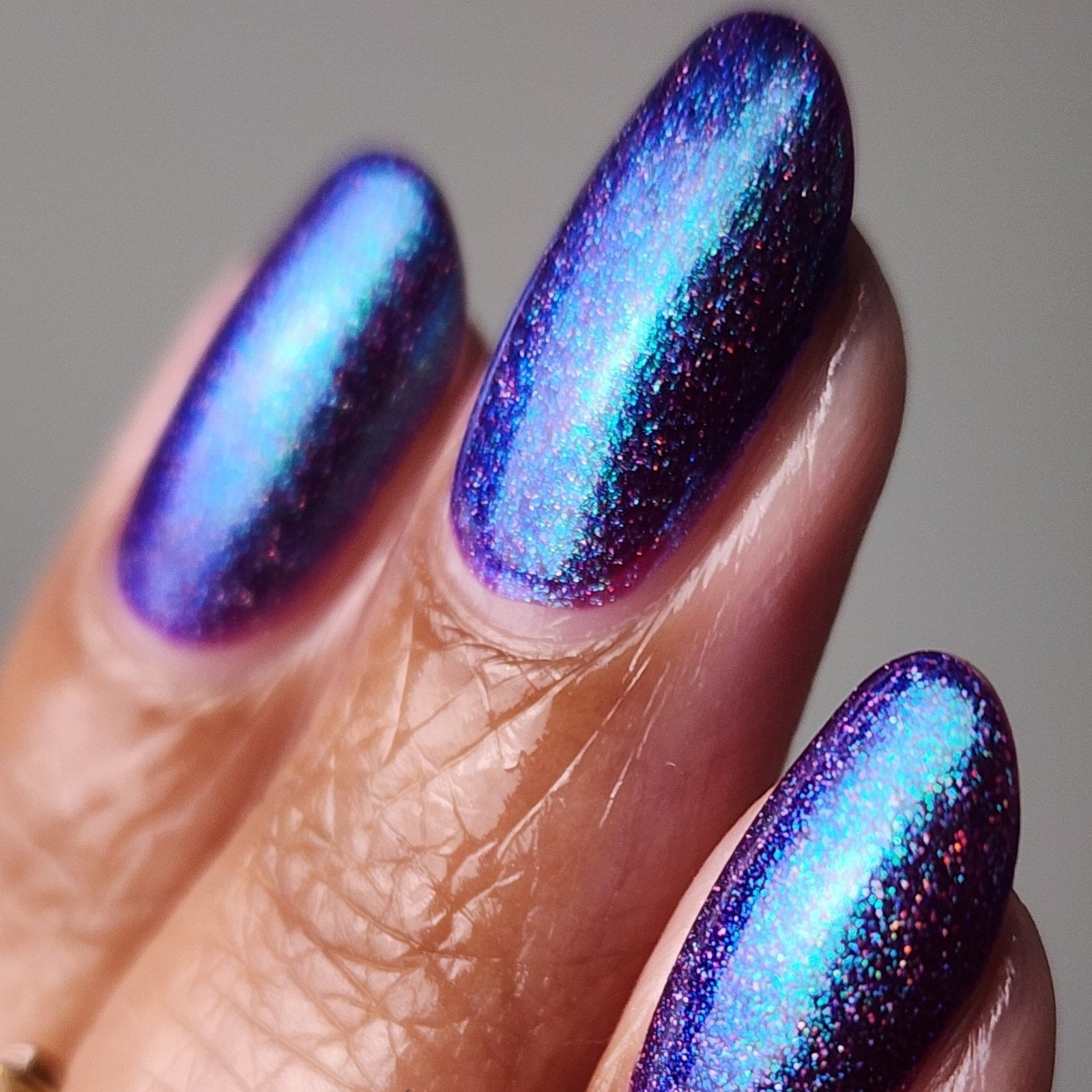 This polish is so terrifyingly beautiful it will instantly stop you in your tracks. Medusa is a purple based polish with a green to teal to blue shifting shimmer and scattered holo. Leave a trail of petrified admirers behind you!