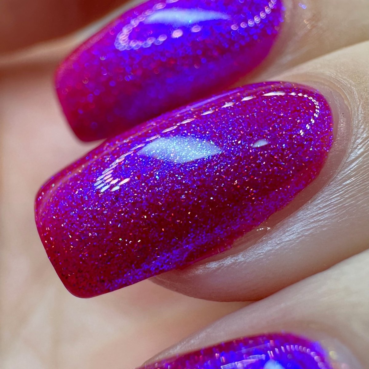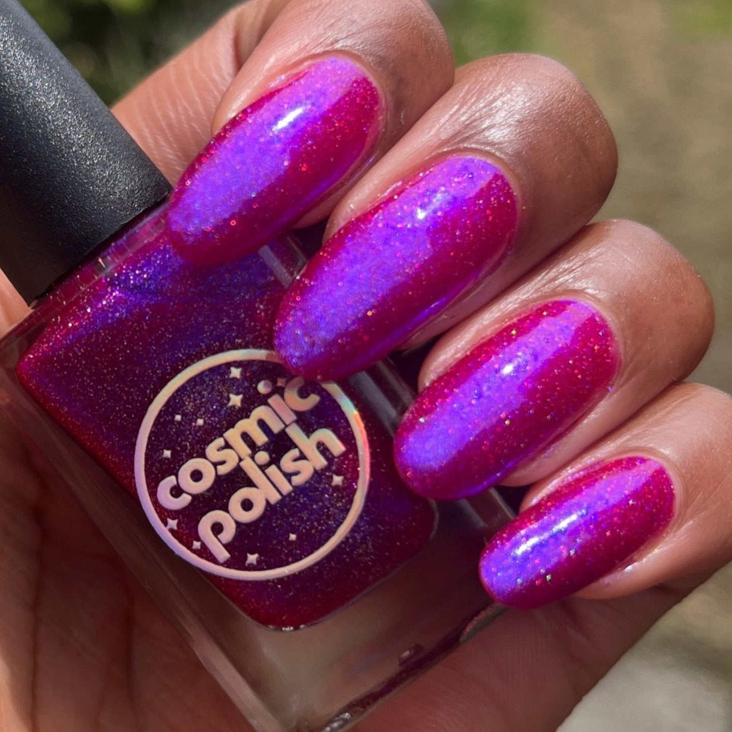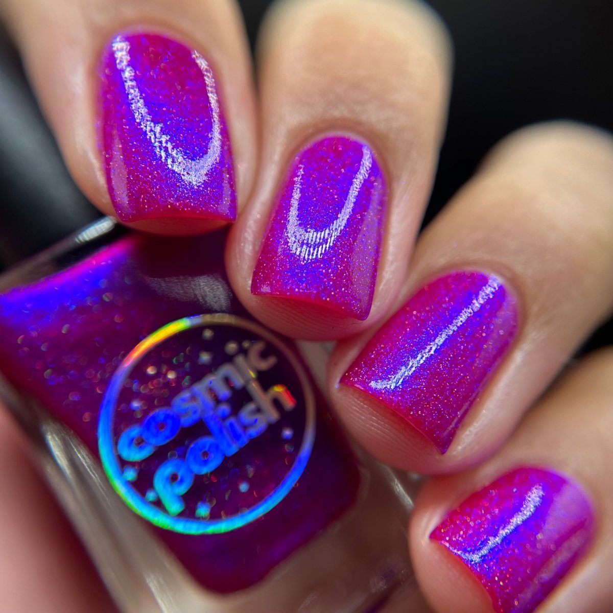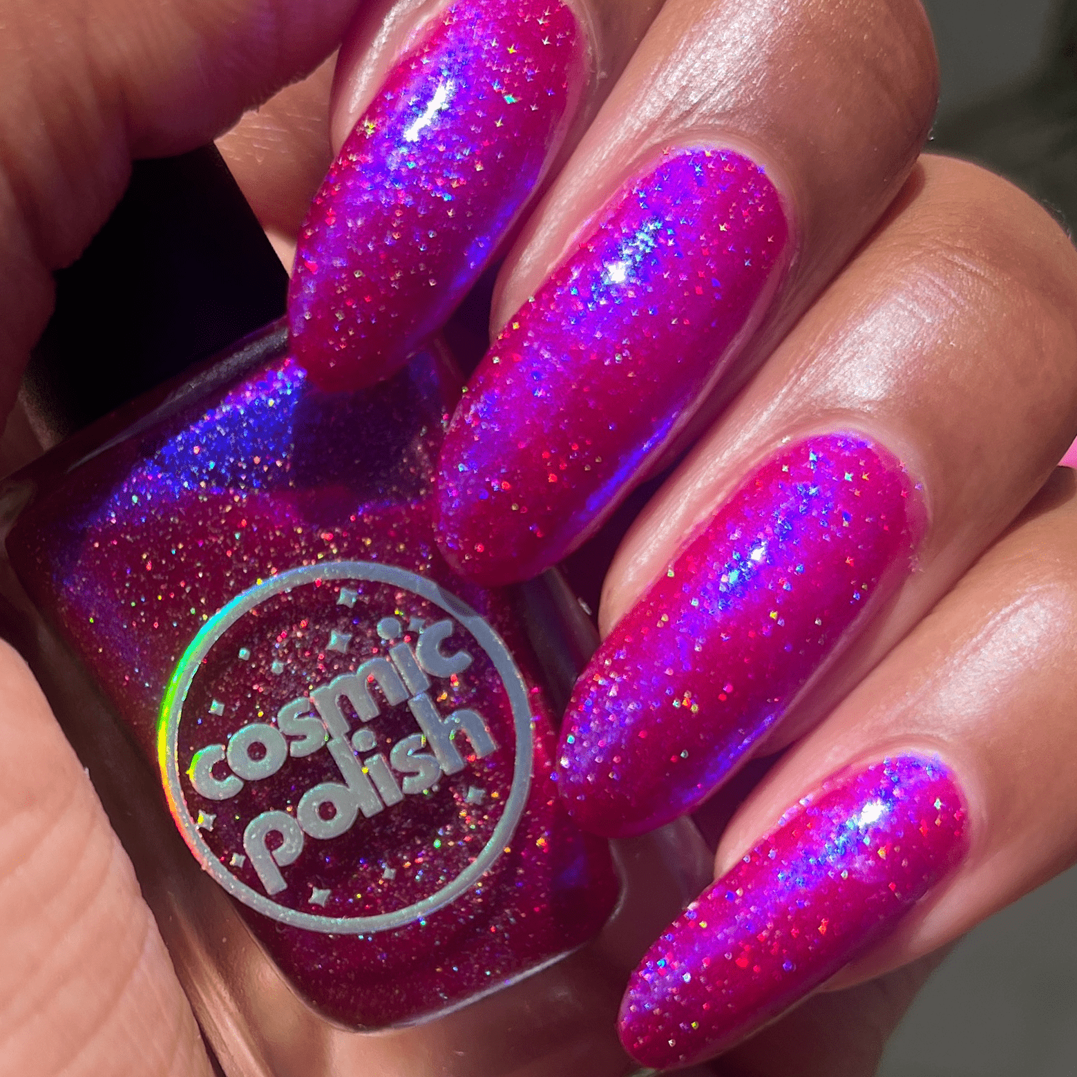 Witness the beginning of phenomenal nails with this polish! Orion's Call is a hot pink based polish with a strong blue shimmer and scattered holo. A small taste of the cosmic fires of creation on your nails.