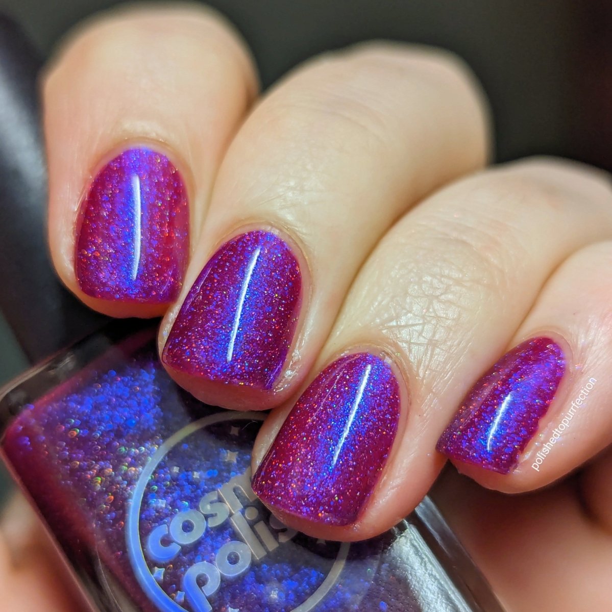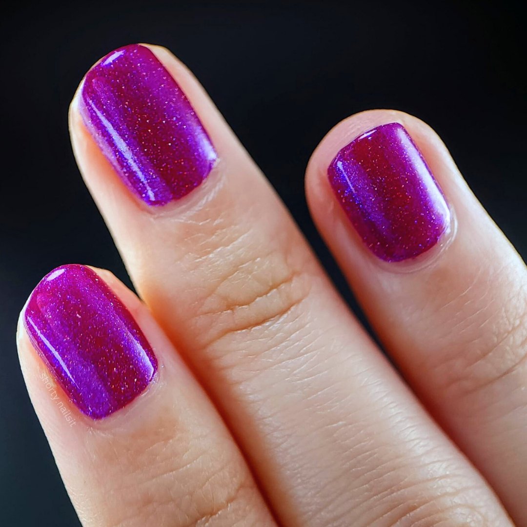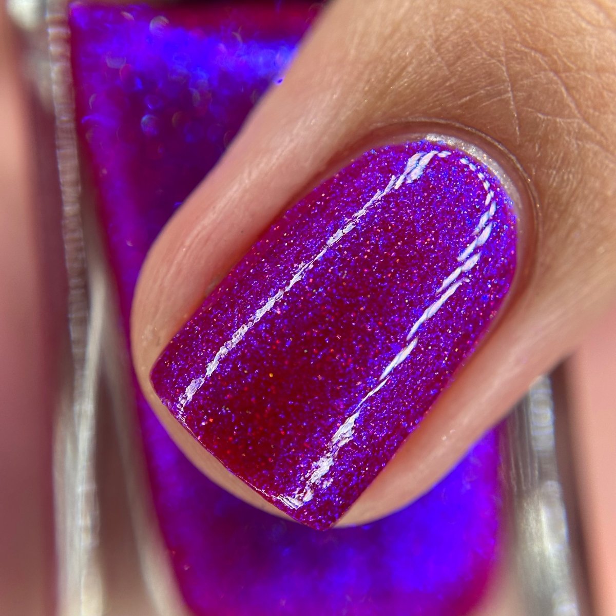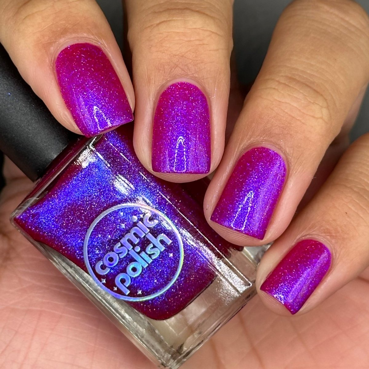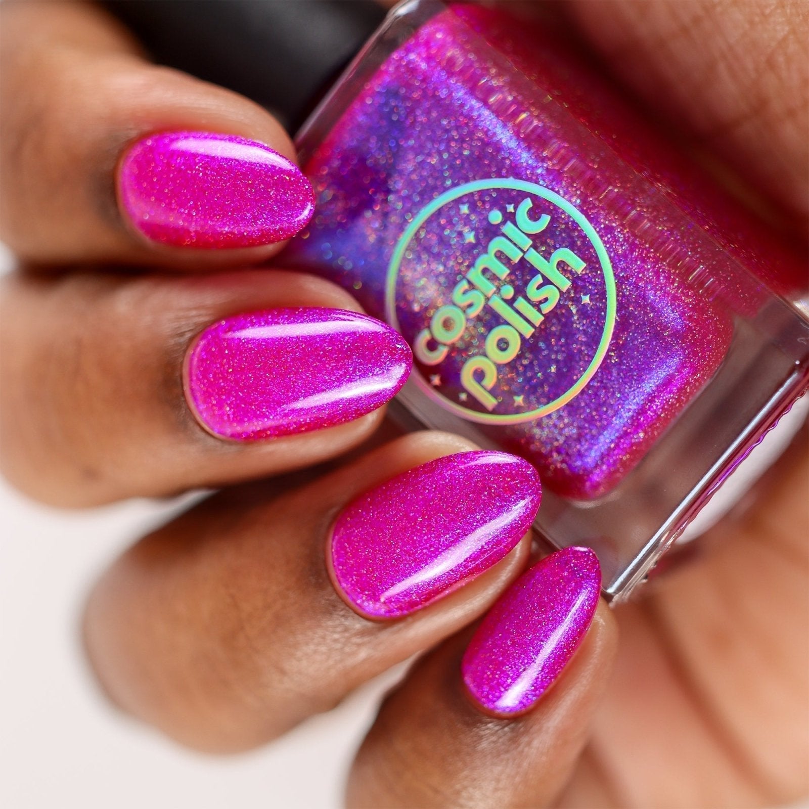 Witness the beginning of phenomenal nails with this polish! Orion's Call is a hot pink based polish with a strong blue shimmer and scattered holo. A small taste of the cosmic fires of creation on your nails.