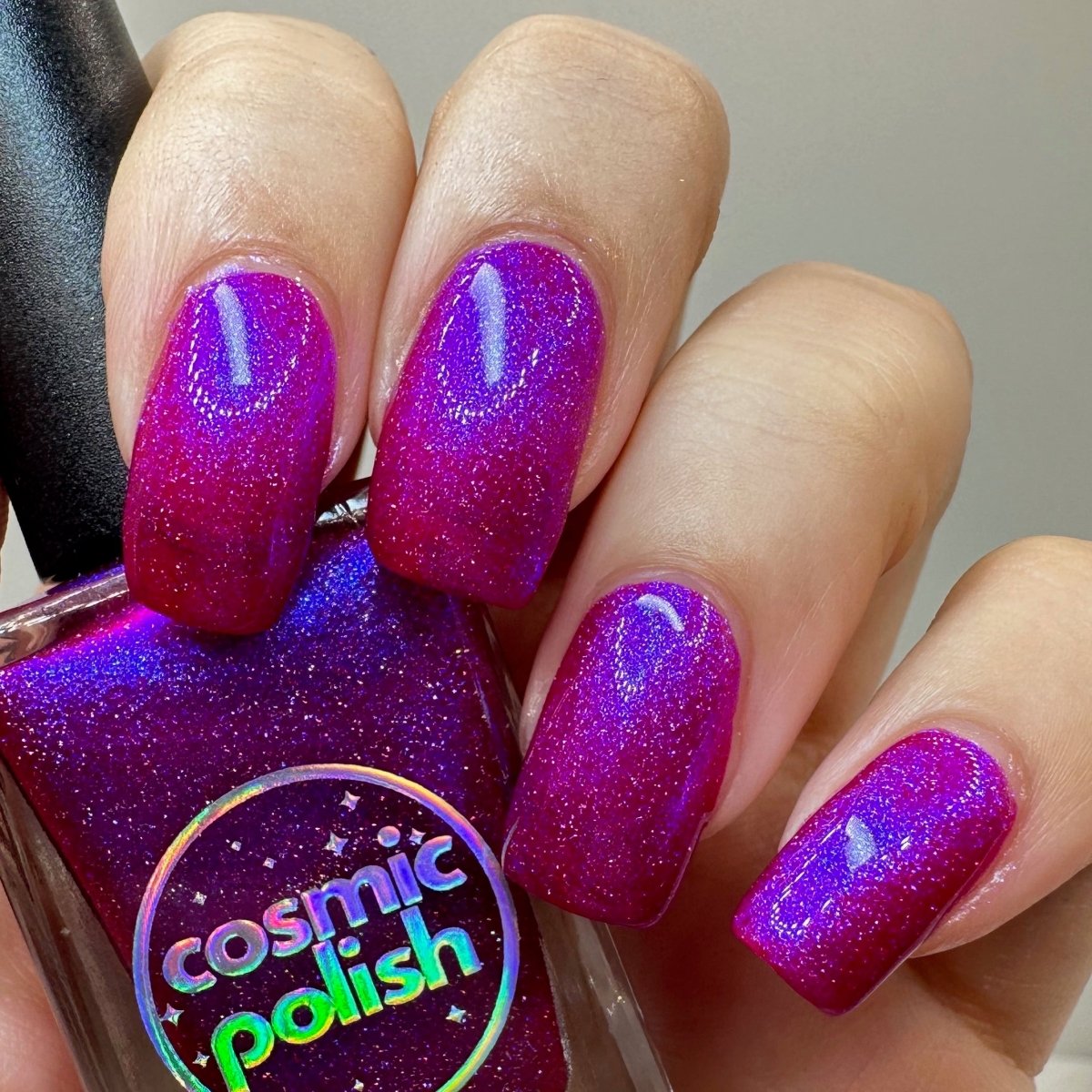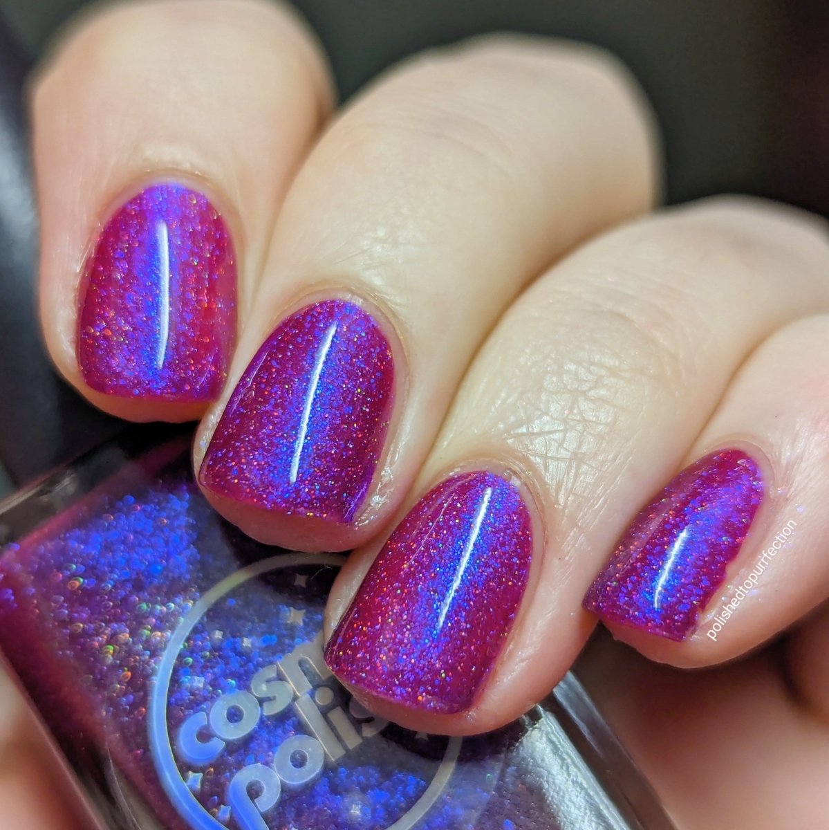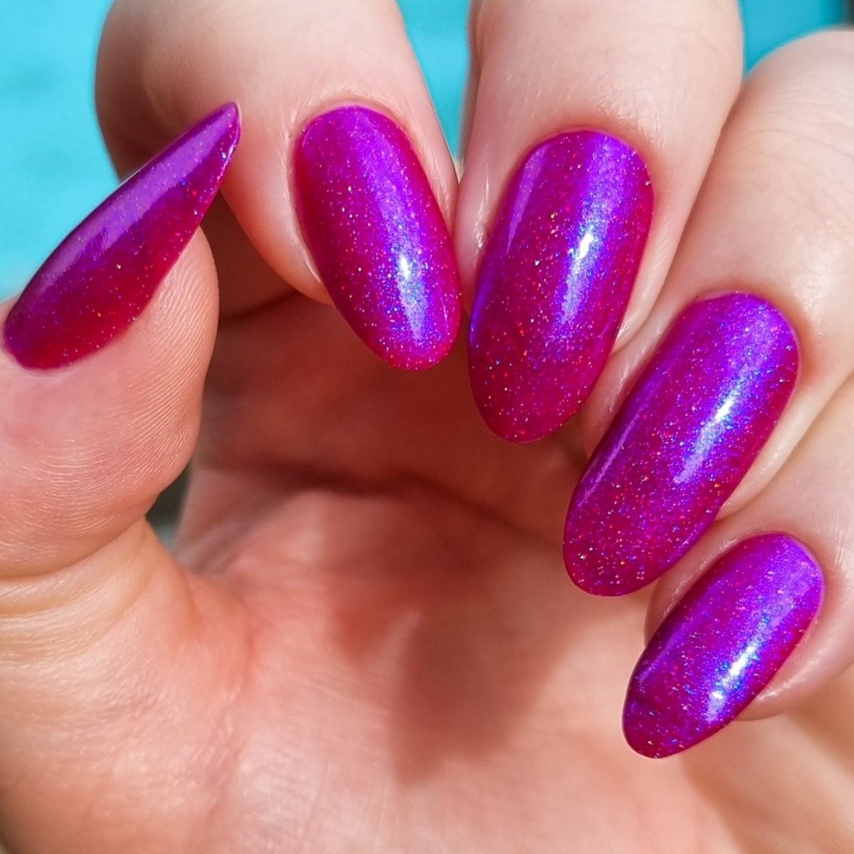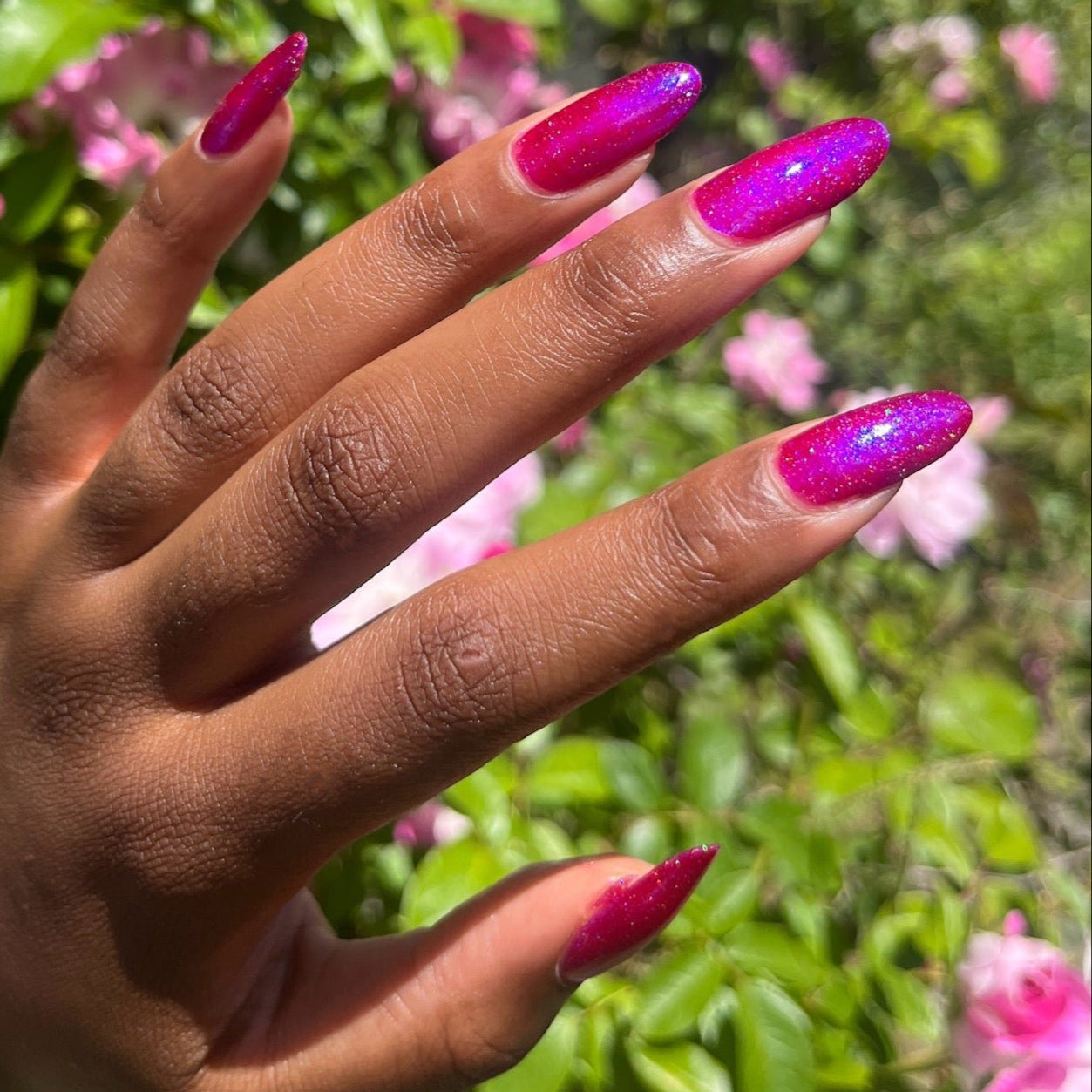 Witness the beginning of phenomenal nails with this polish! Orion's Call is a hot pink based polish with a strong blue shimmer and scattered holo. A small taste of the cosmic fires of creation on your nails.