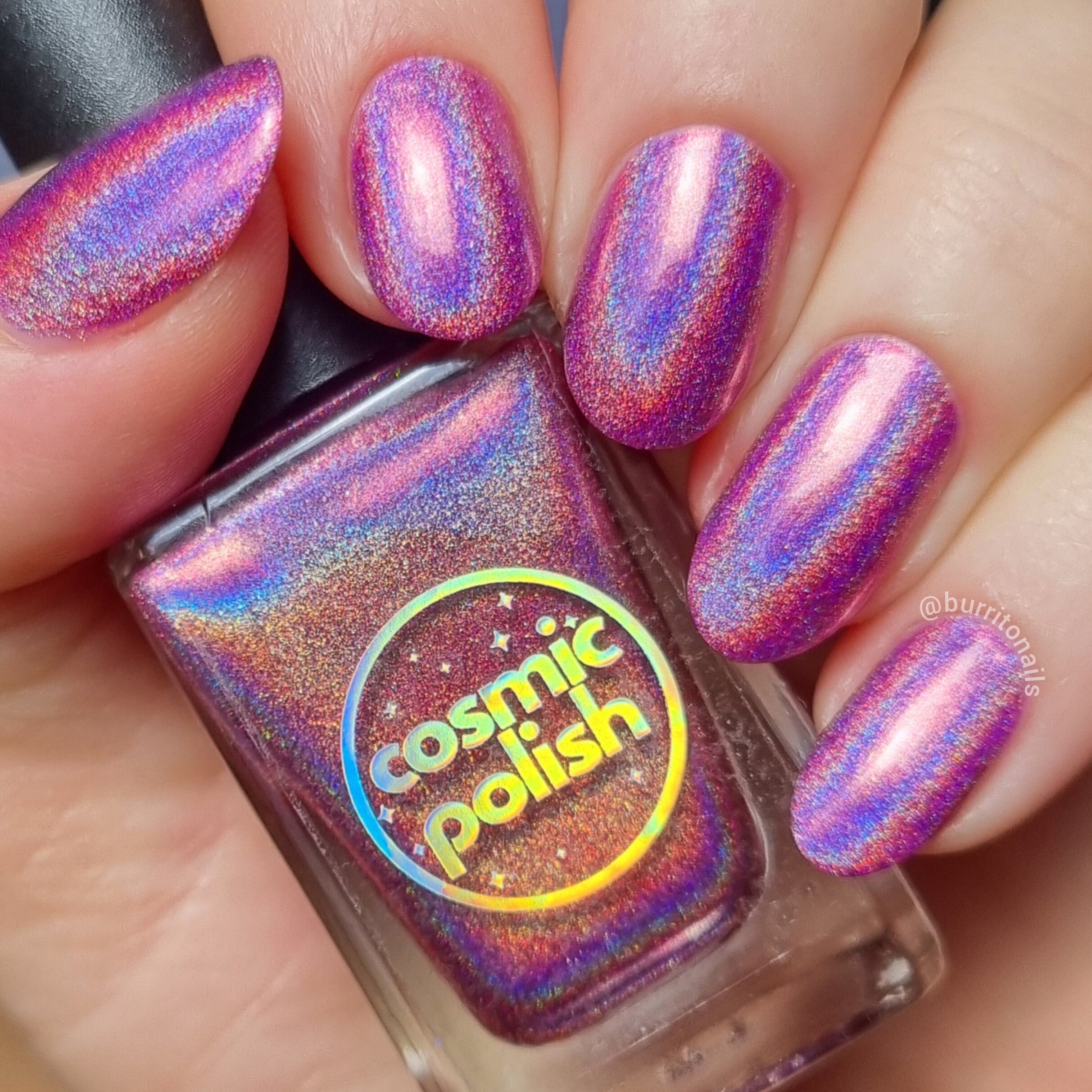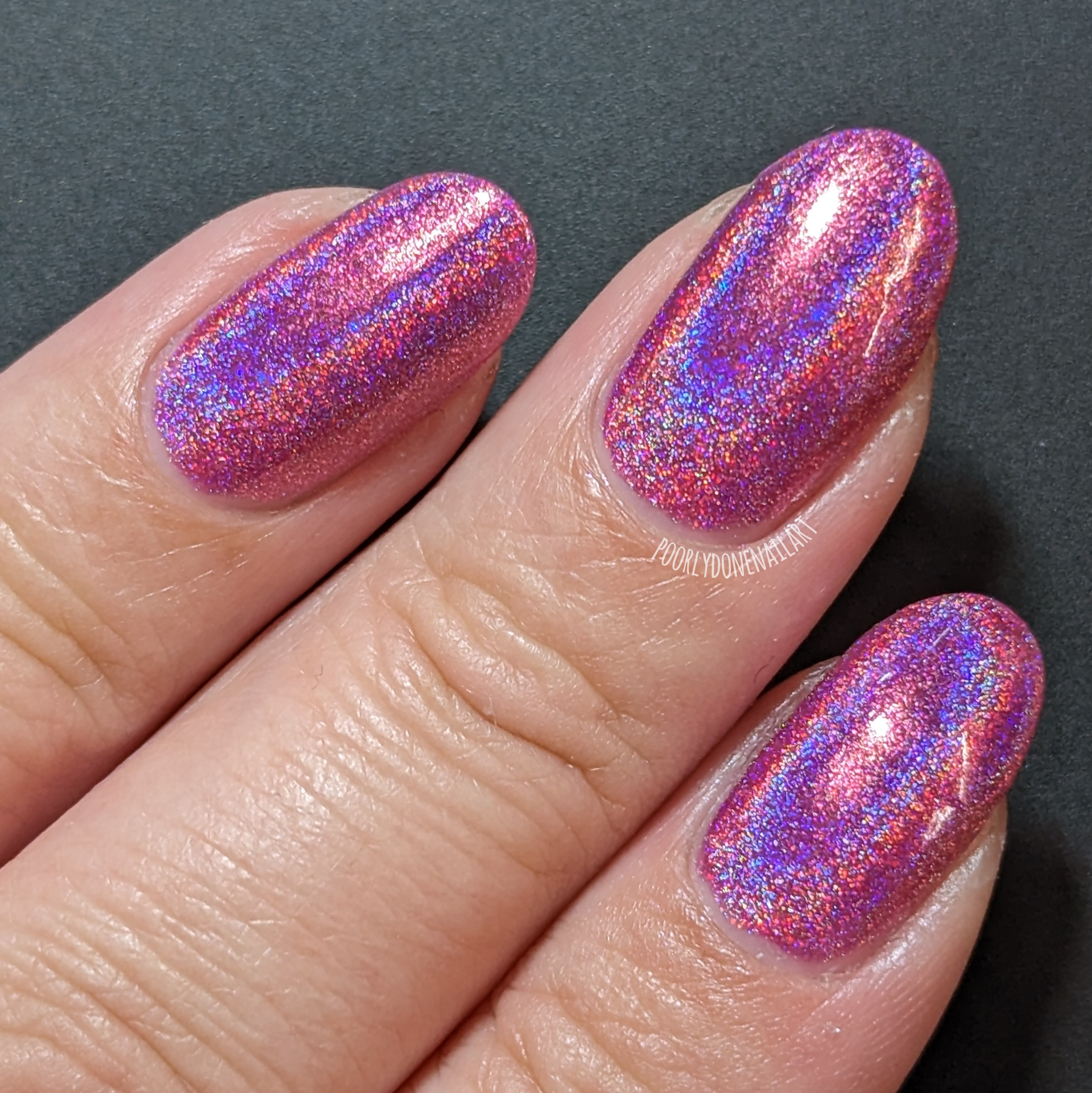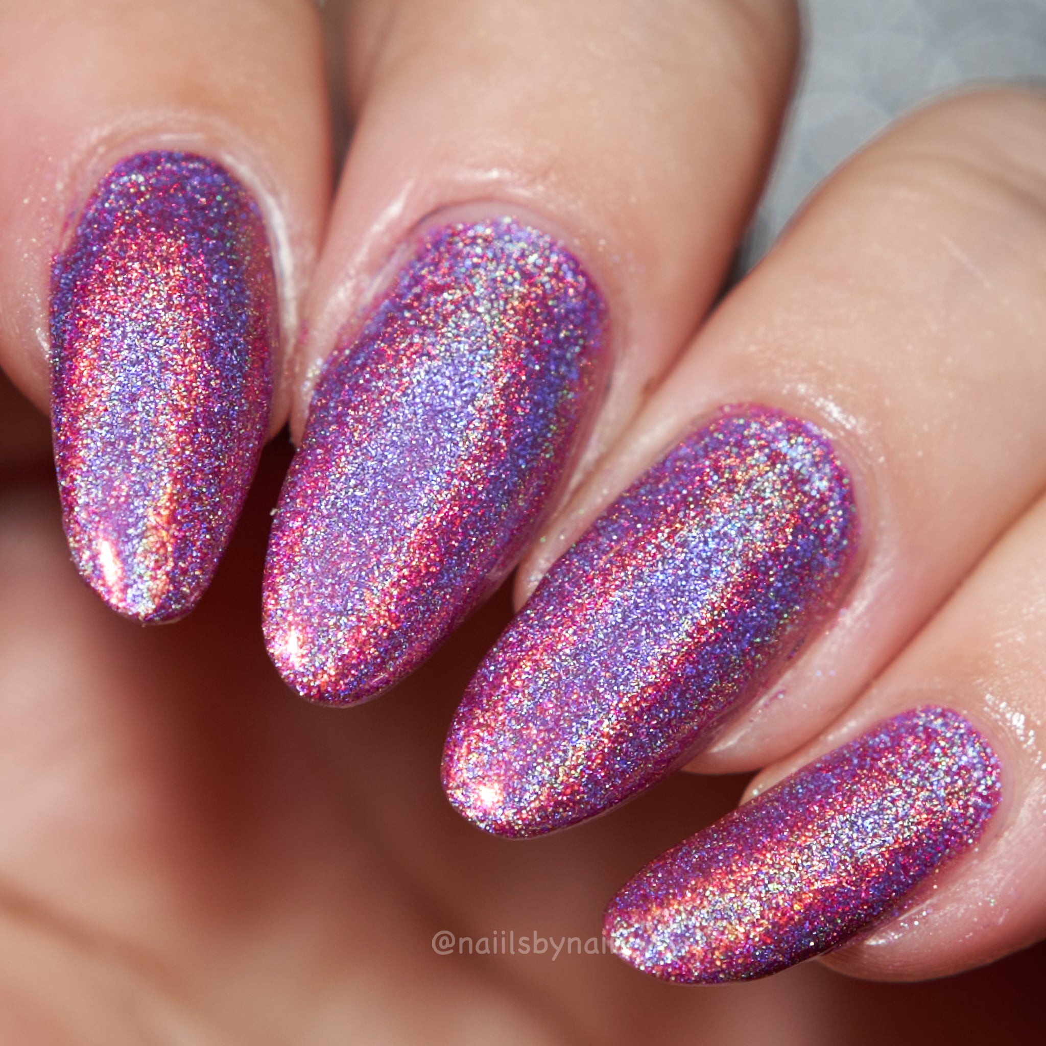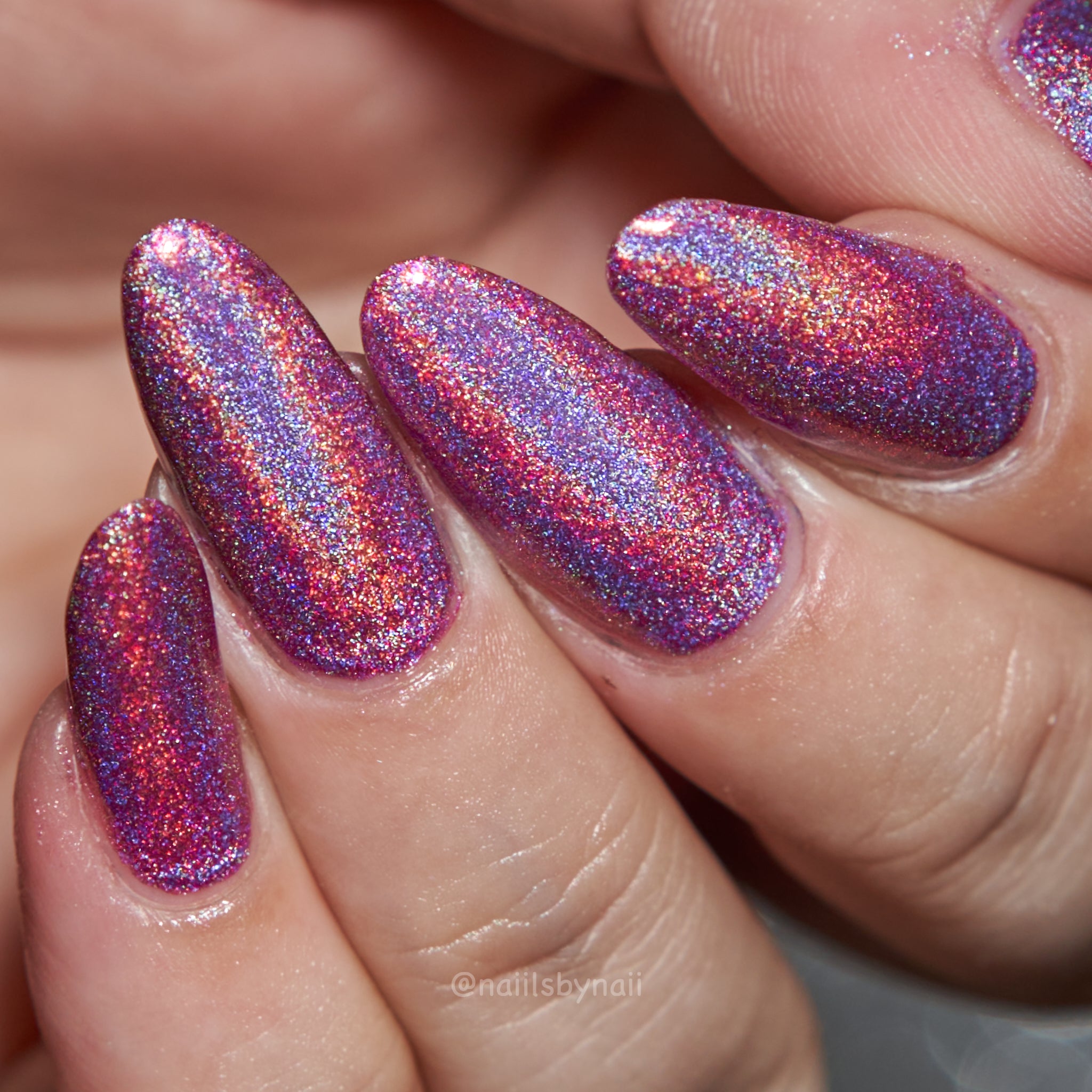 See the world through rose-coloured glasses with Pink Dawn, a light pink linear holographic polish. The whole world is brighter with holo! 2-3 coats for full opacity.