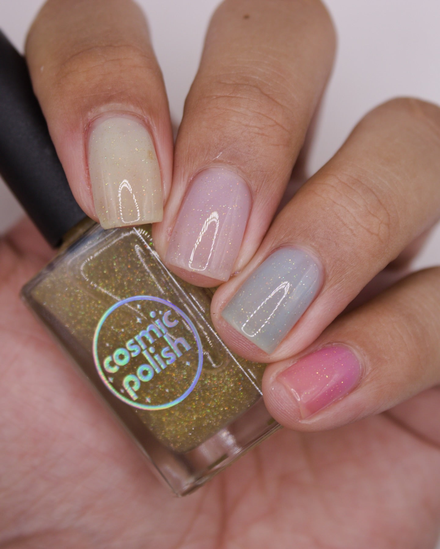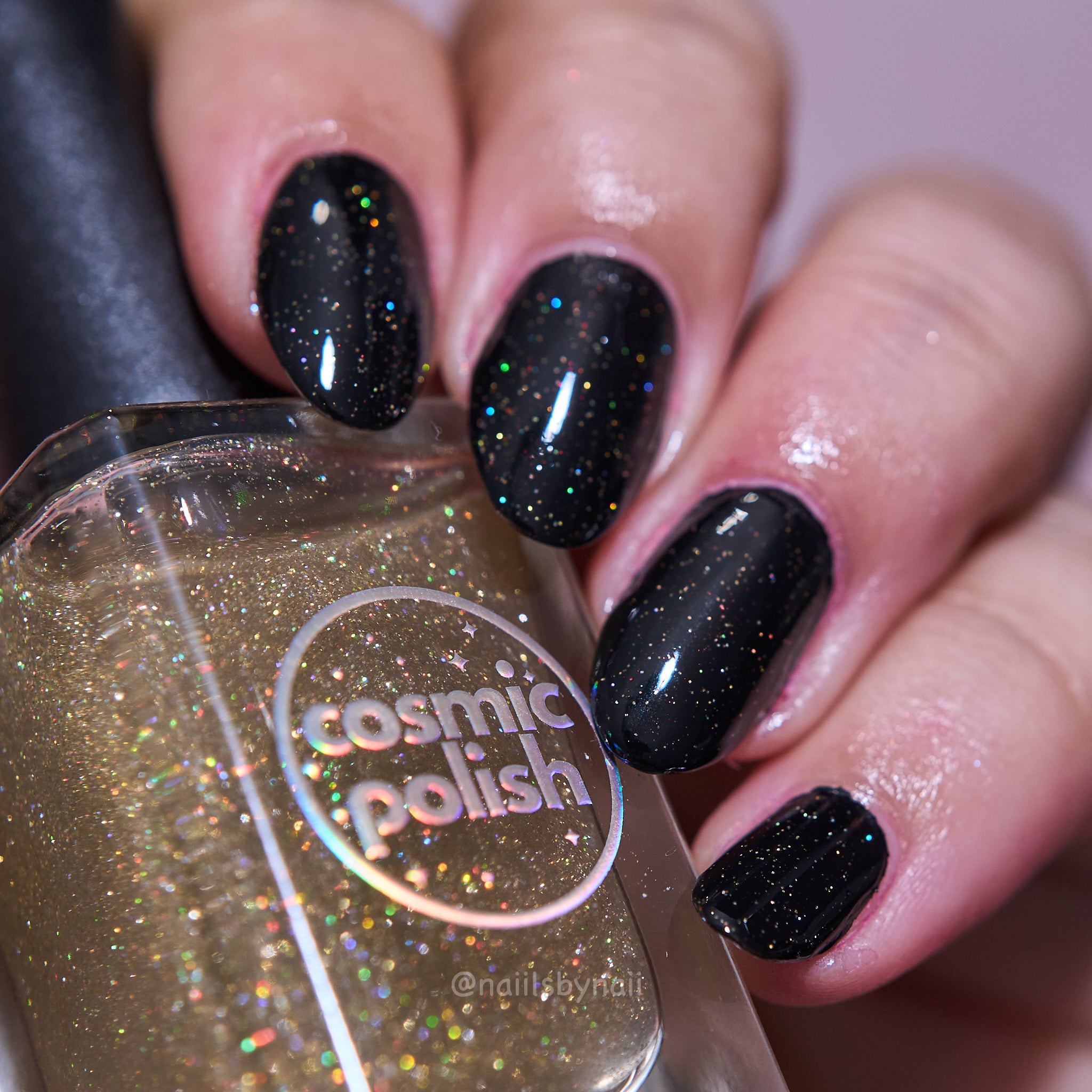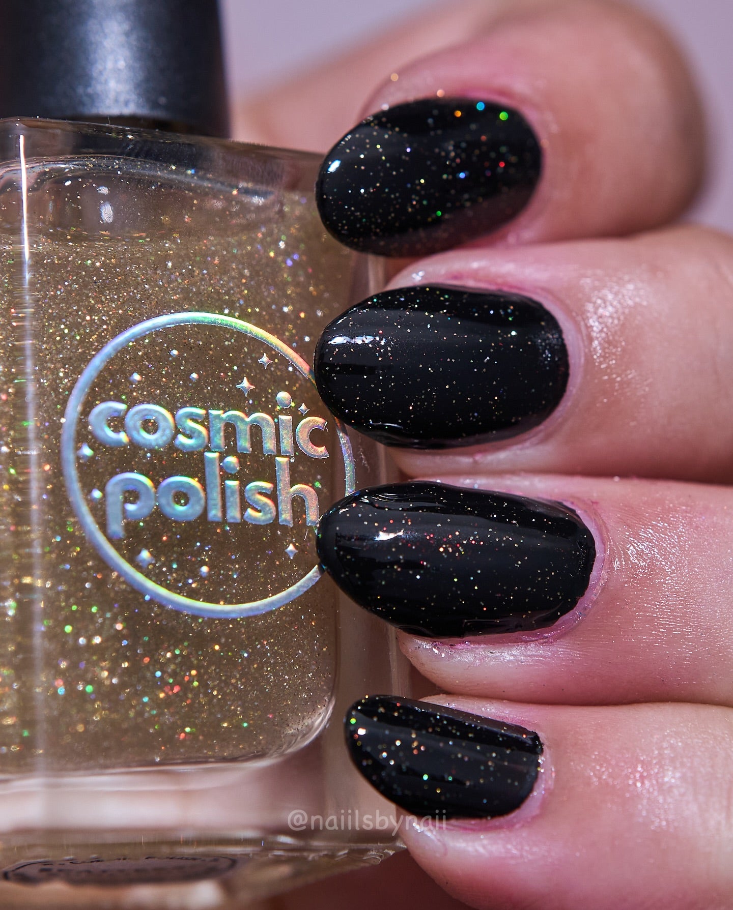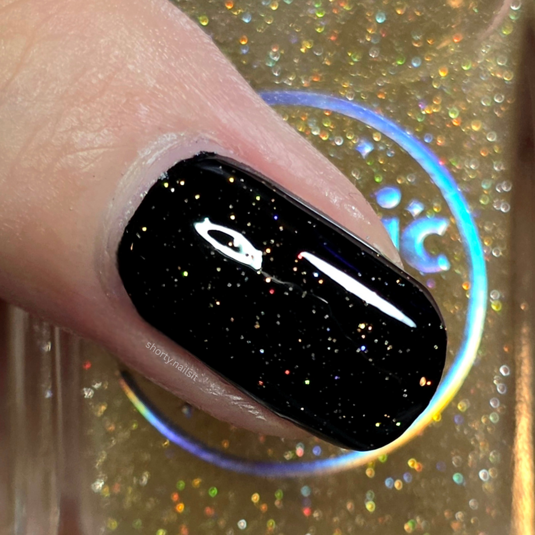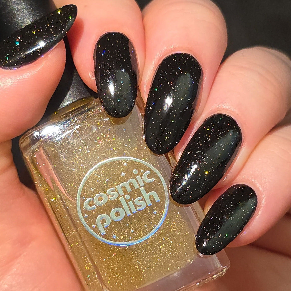 Get a touch of bling in your mani with this gold holo and reflective topper! Scattered Sunlight is a gold scattered holo topper, with a sprinkling of gold reflective glitter, in a clear base.