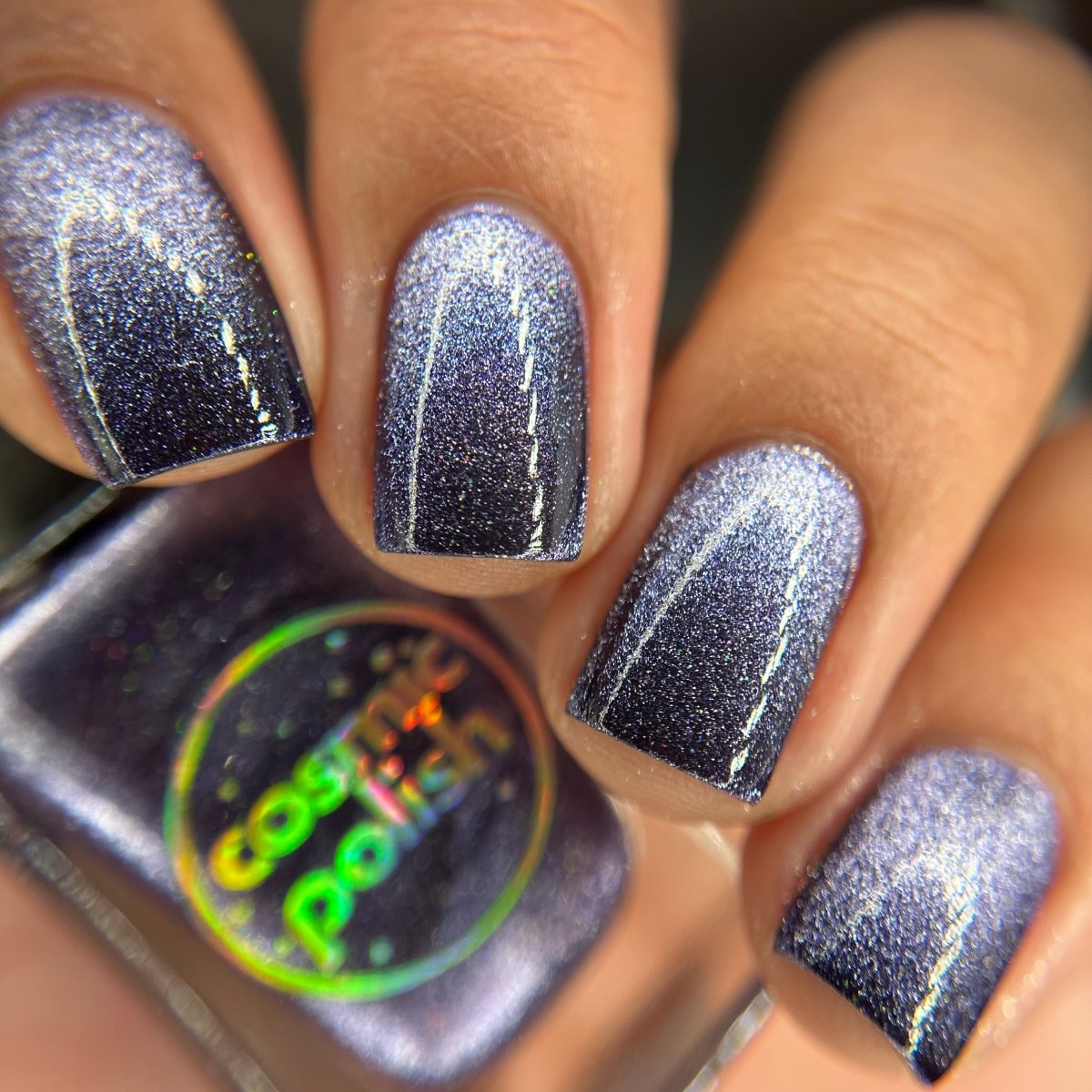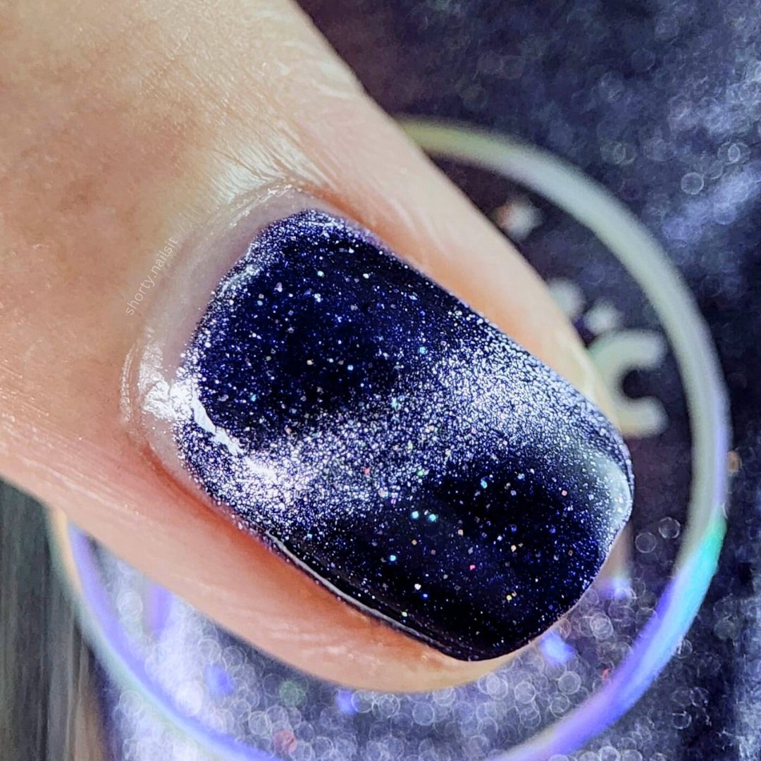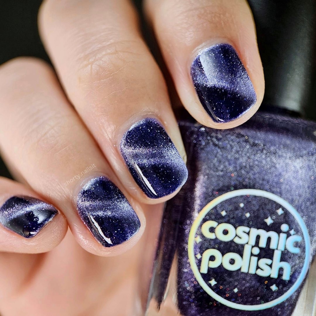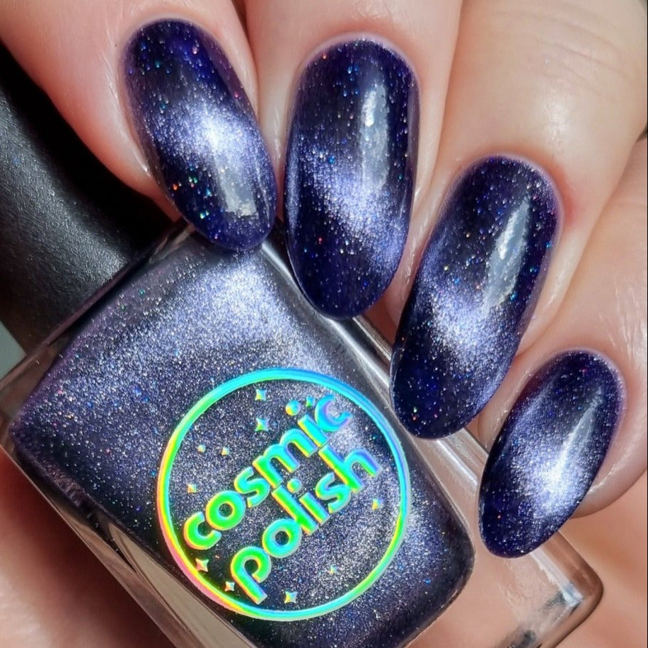 Don’t break your nails - break down spacetime itself instead. Singularity is a dark purple based magnetic polish with a pale purple stripe and scattered holo. Capture the light of a dying star on your nails with this gorgeous