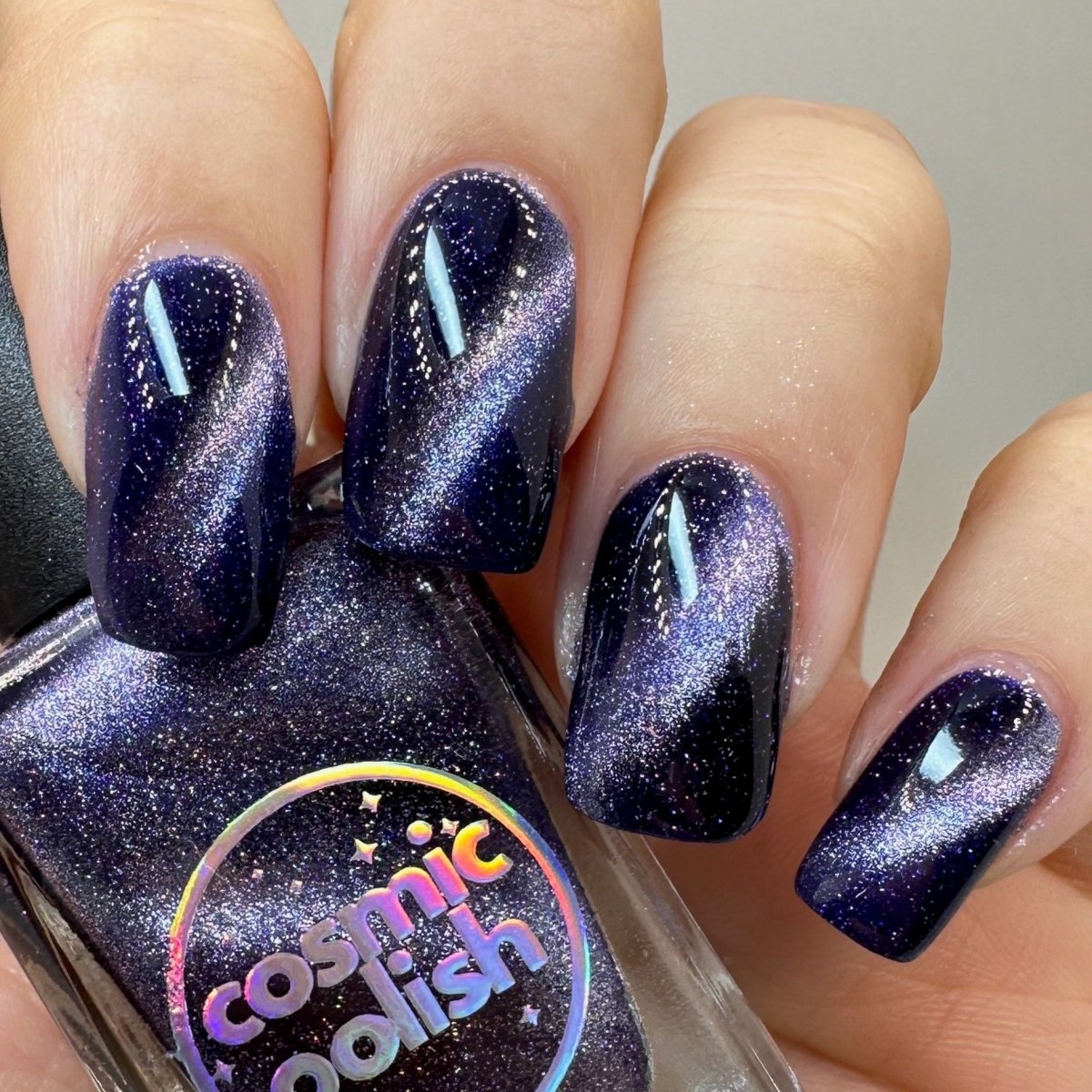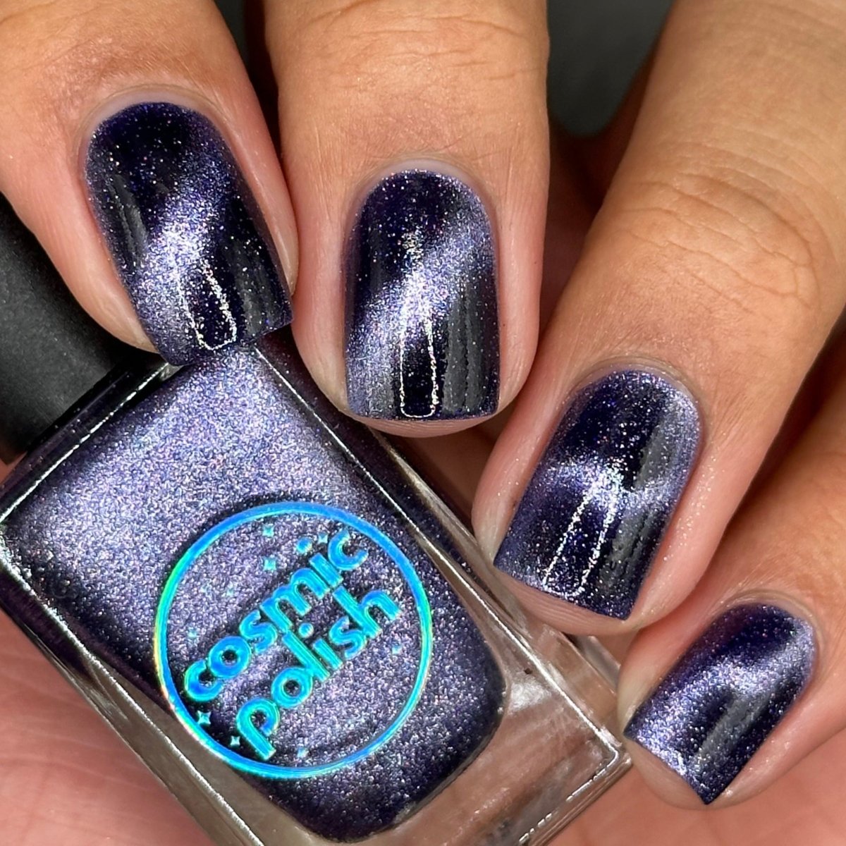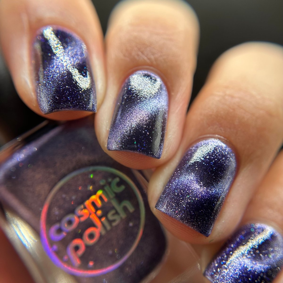 Don’t break your nails - break down spacetime itself instead. Singularity is a dark purple based magnetic polish with a pale purple stripe and scattered holo. Capture the light of a dying star on your nails with this gorgeous