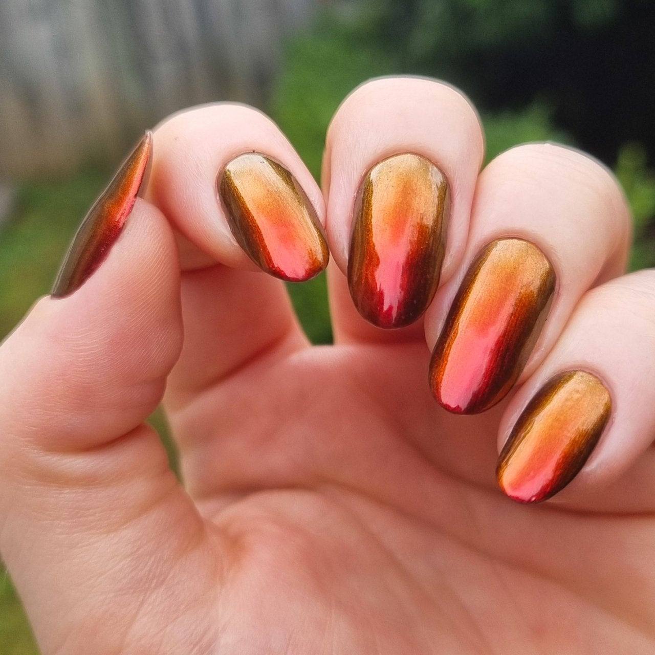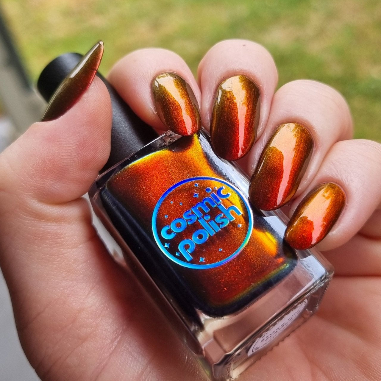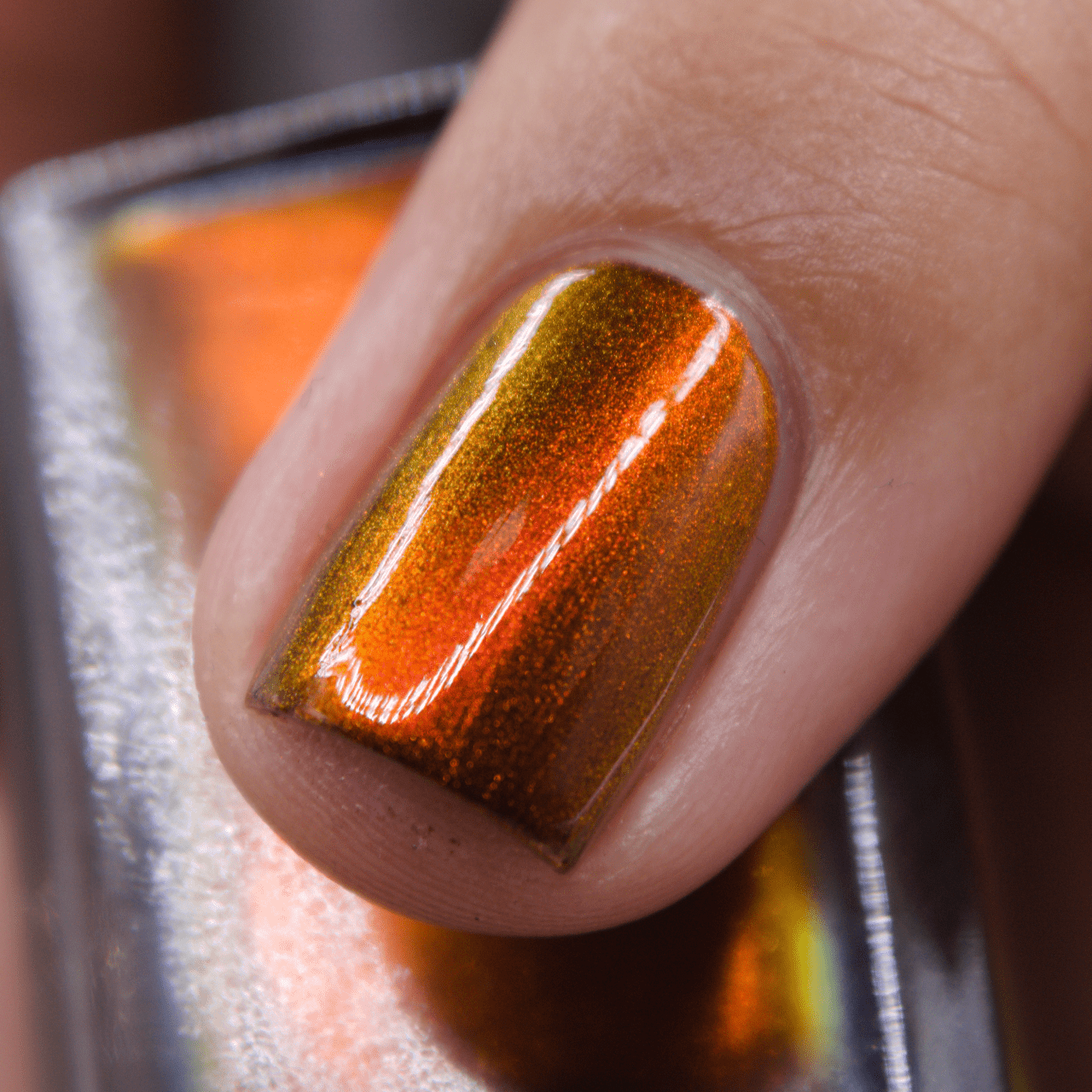Inspired by the magic of our southern skies, Australis shimmers with quiet wonder. This luminous pink-to-gold scattered holo shimmer with a purple base glows with shifting colour and delicate sparkle.