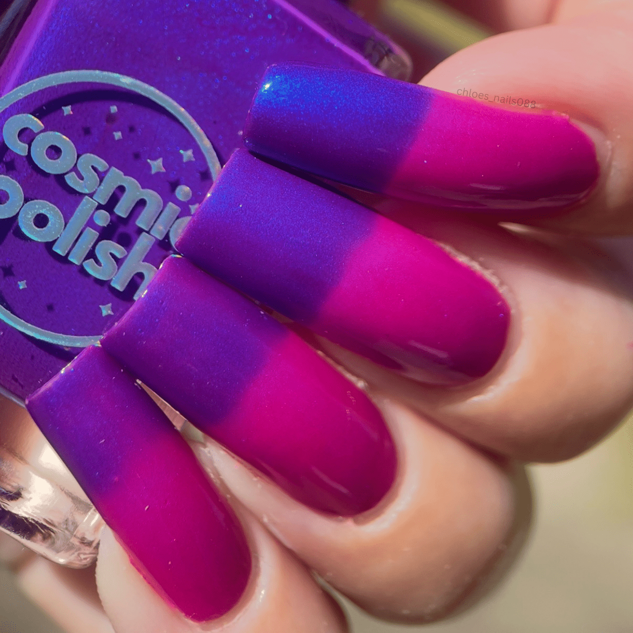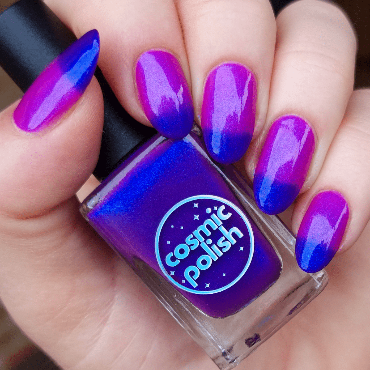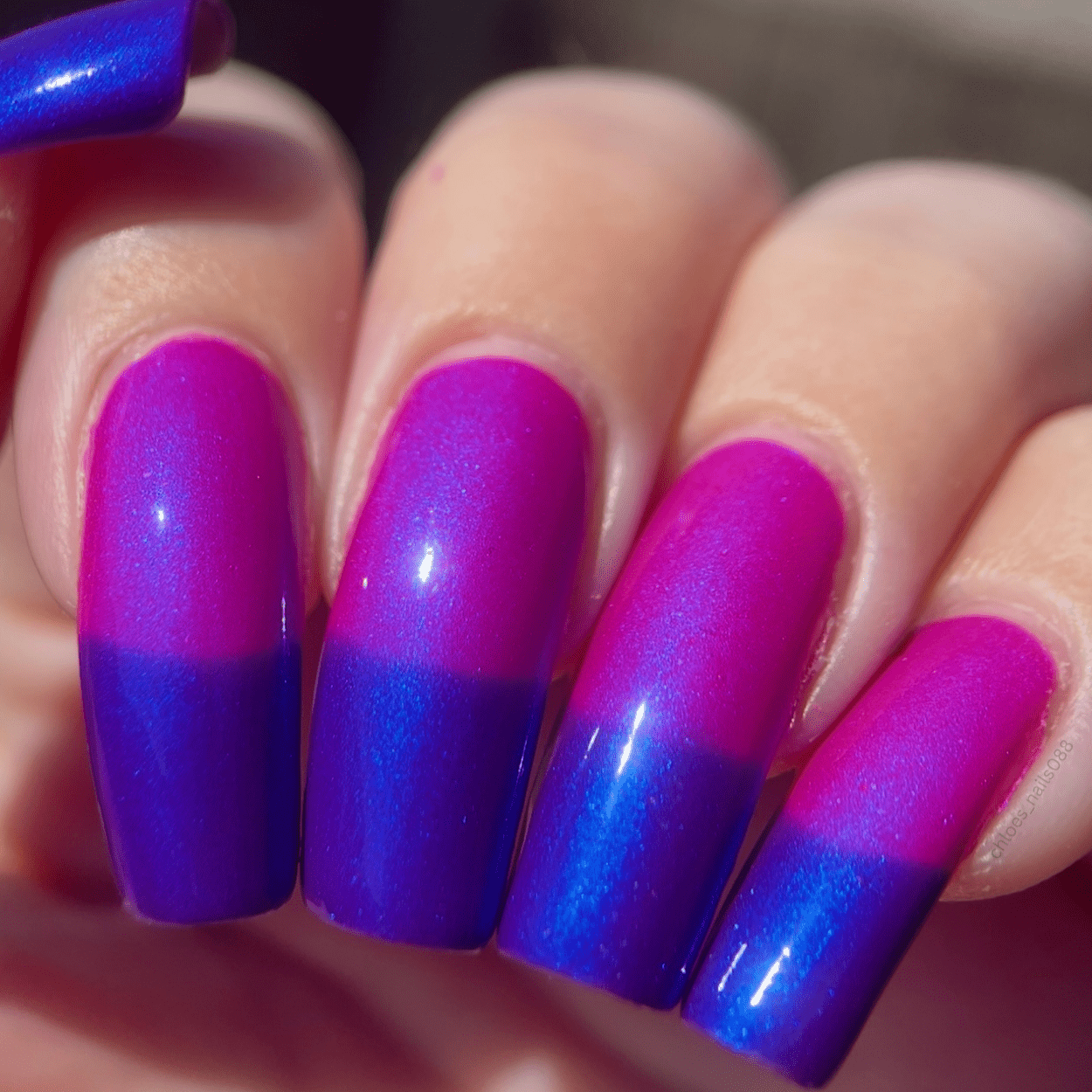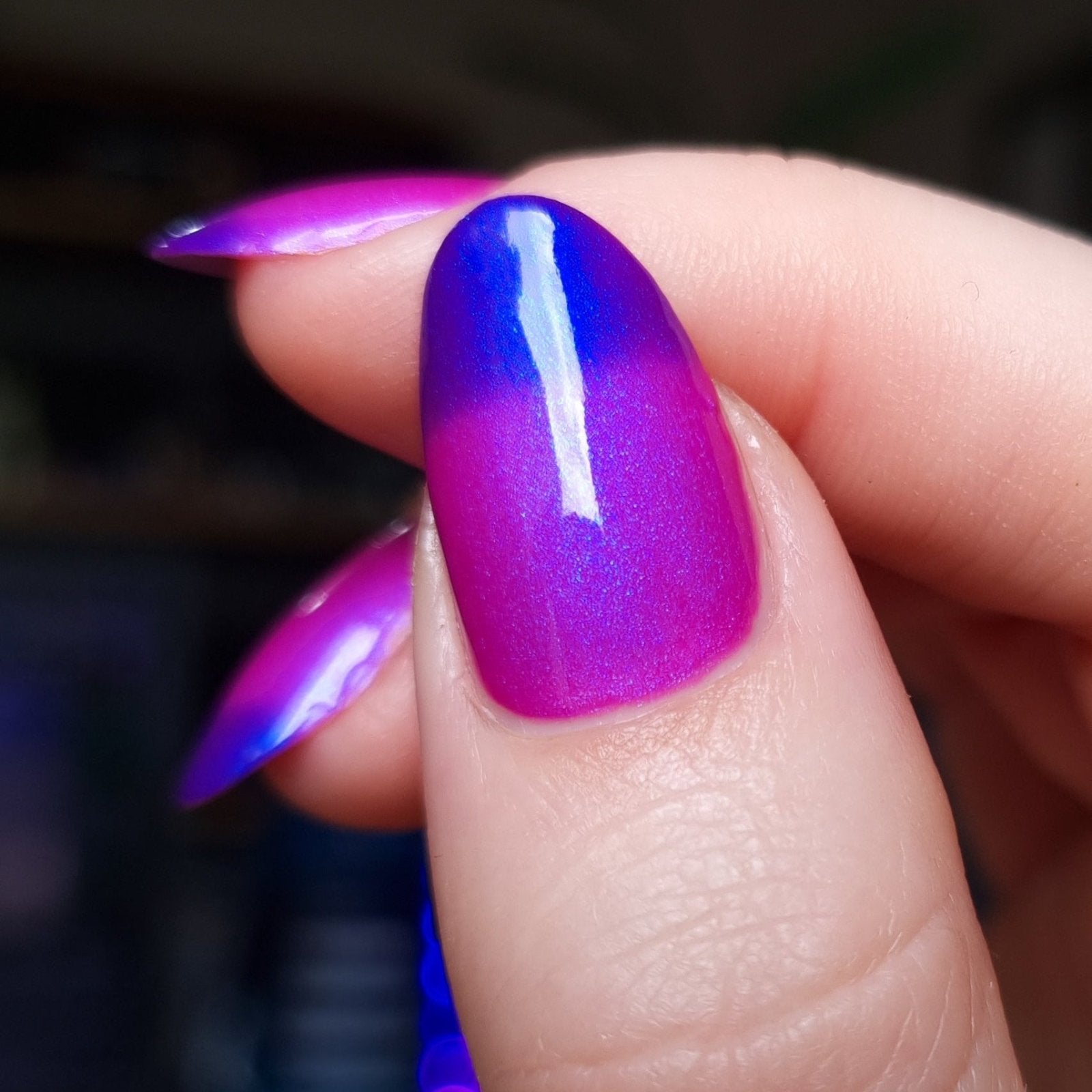 Wildflower Nights is a thermal polish with a strong blue glow that transforms from a bright purple in the cold state to a saturated pink in the warm state.