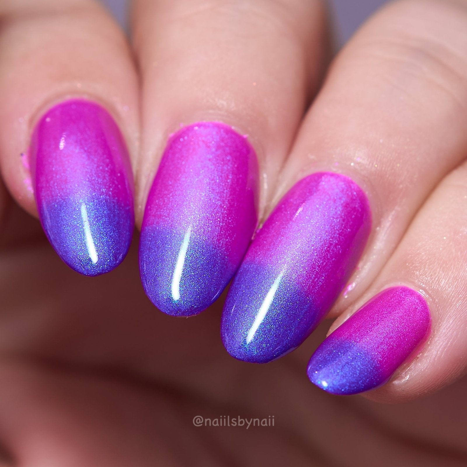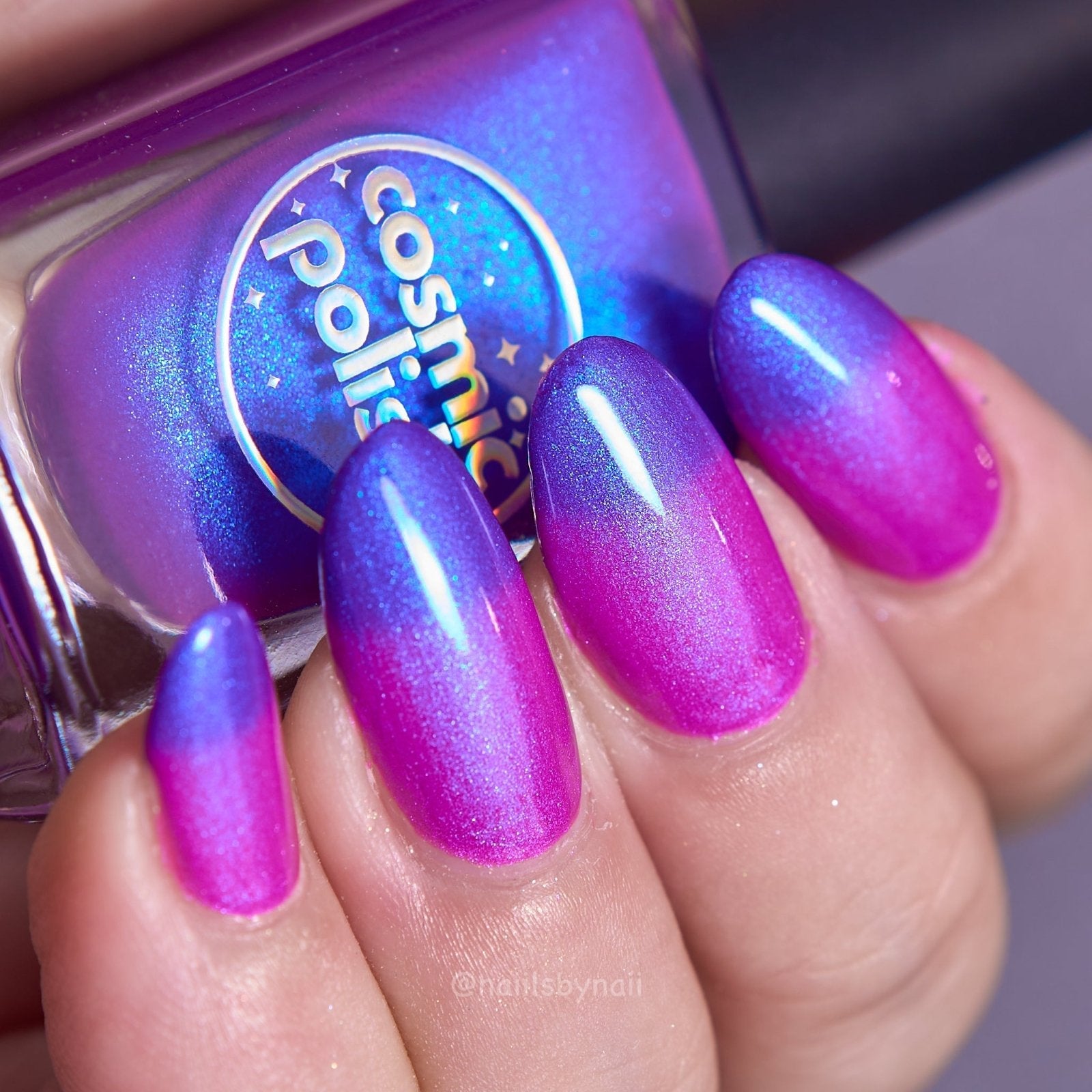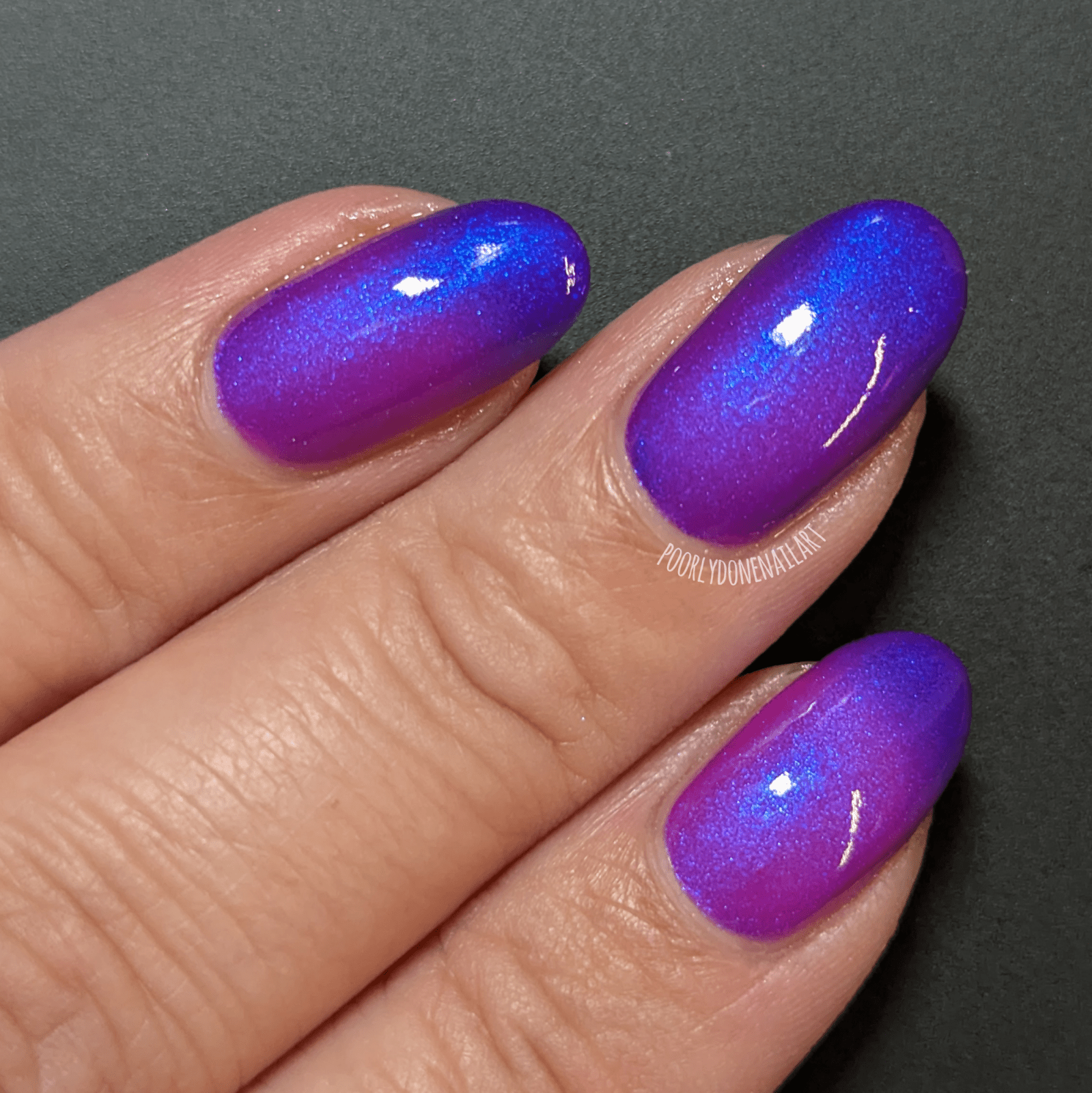 Wildflower Nights is a thermal polish with a strong blue glow that transforms from a bright purple in the cold state to a saturated pink in the warm state.