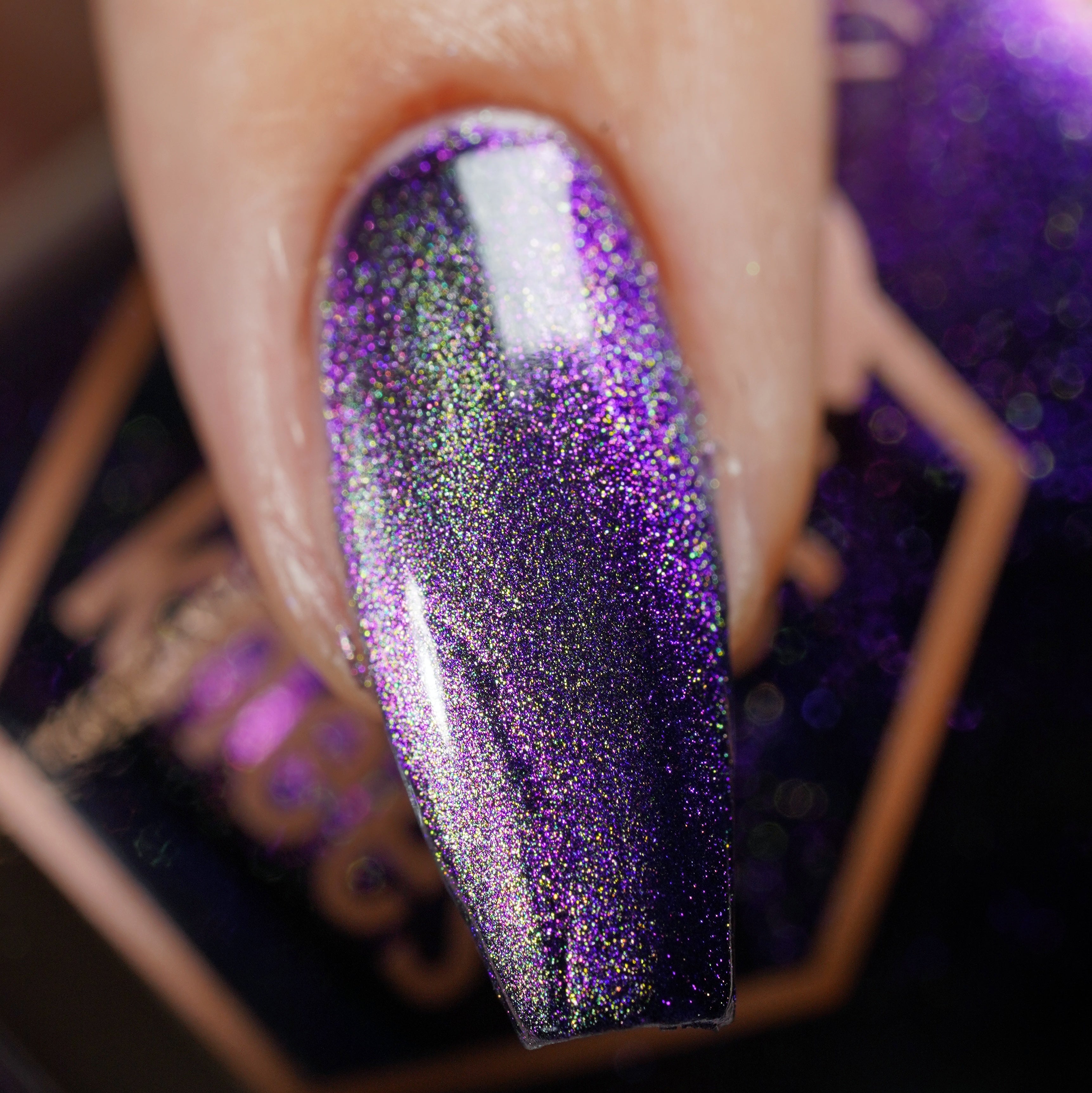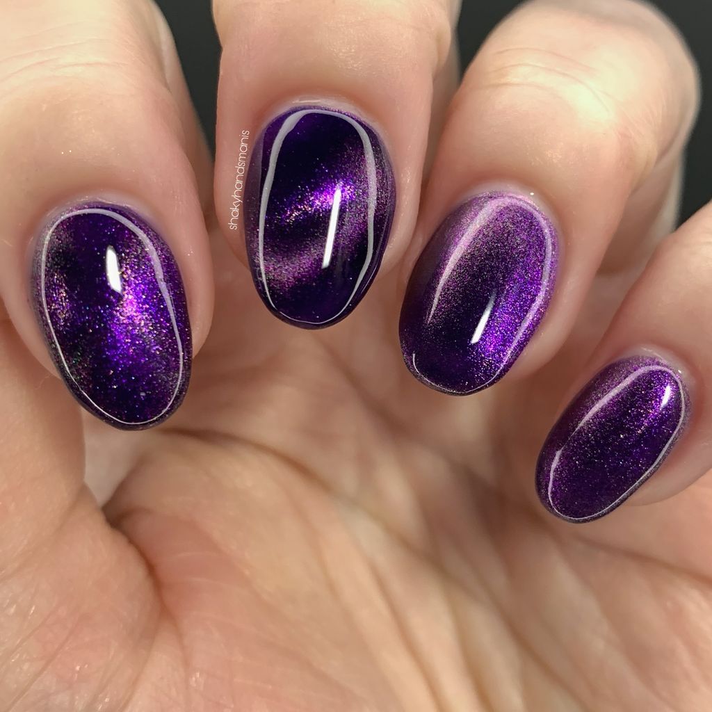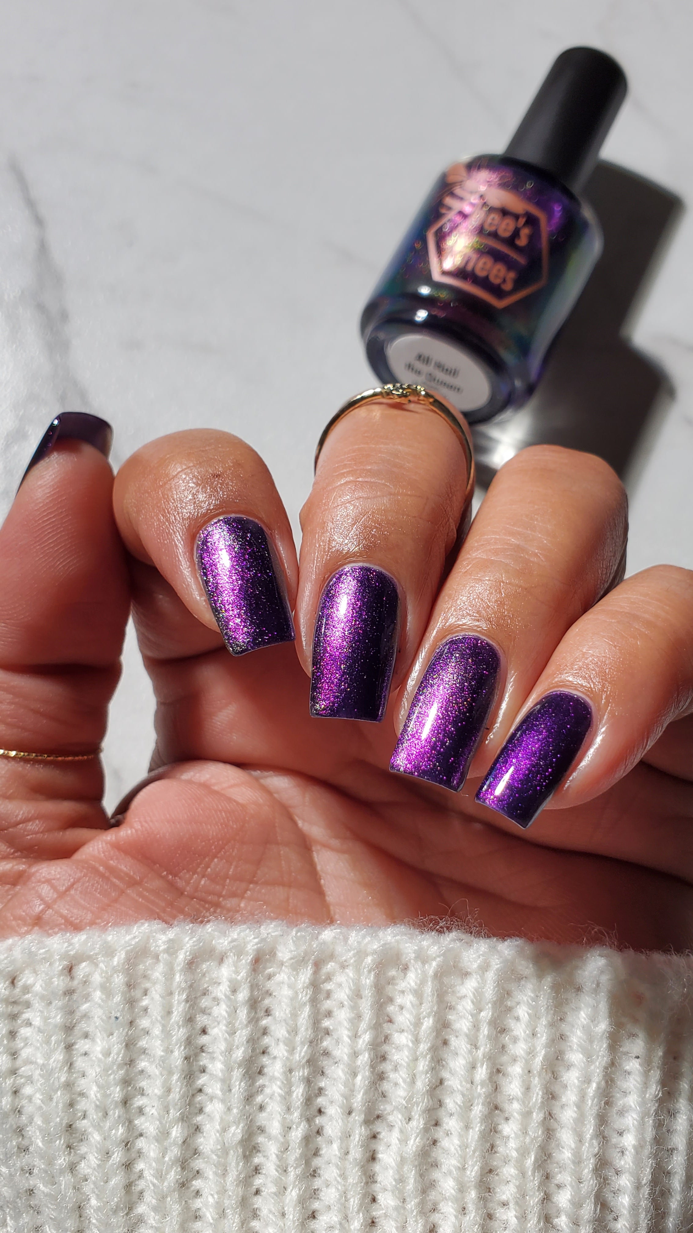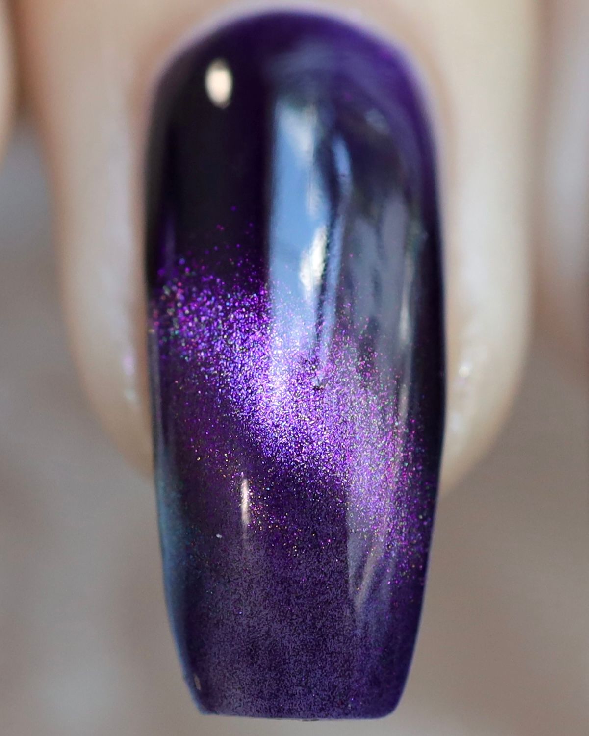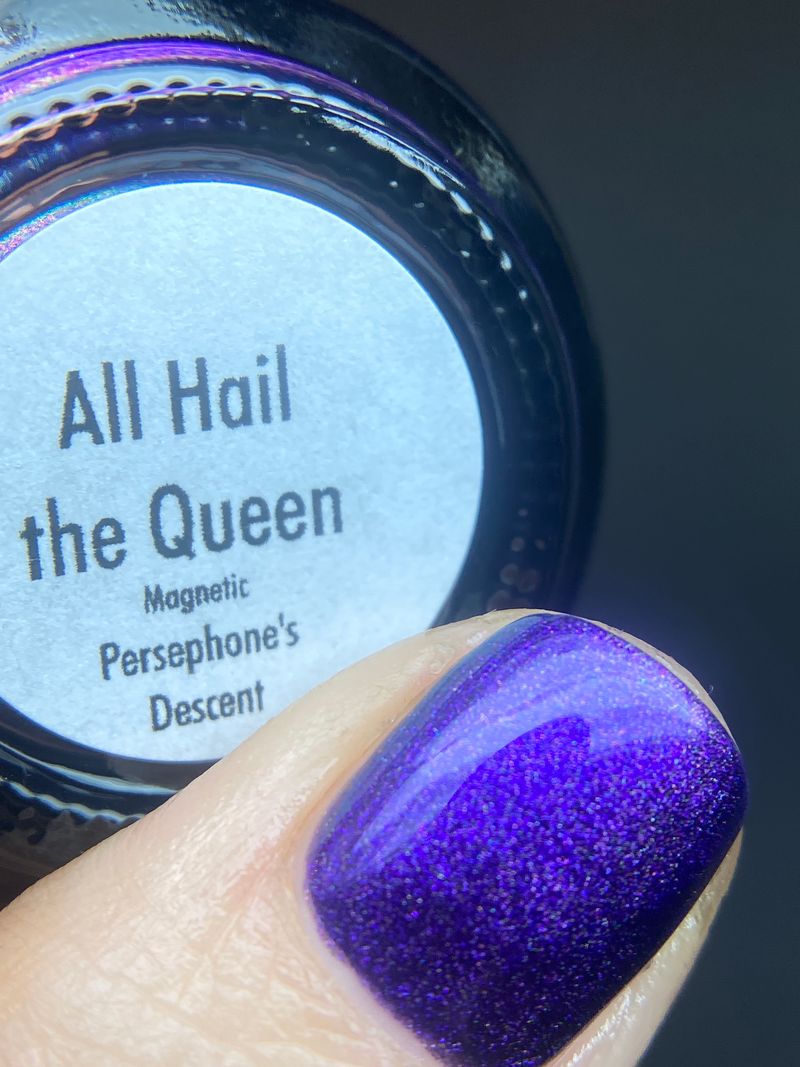 All Hail the Queen - violet with a mosaic magnetic that upon first glance looks like a washed out purple. When magnetized you will see both a purple as well as a rich gold magnetic pigment.