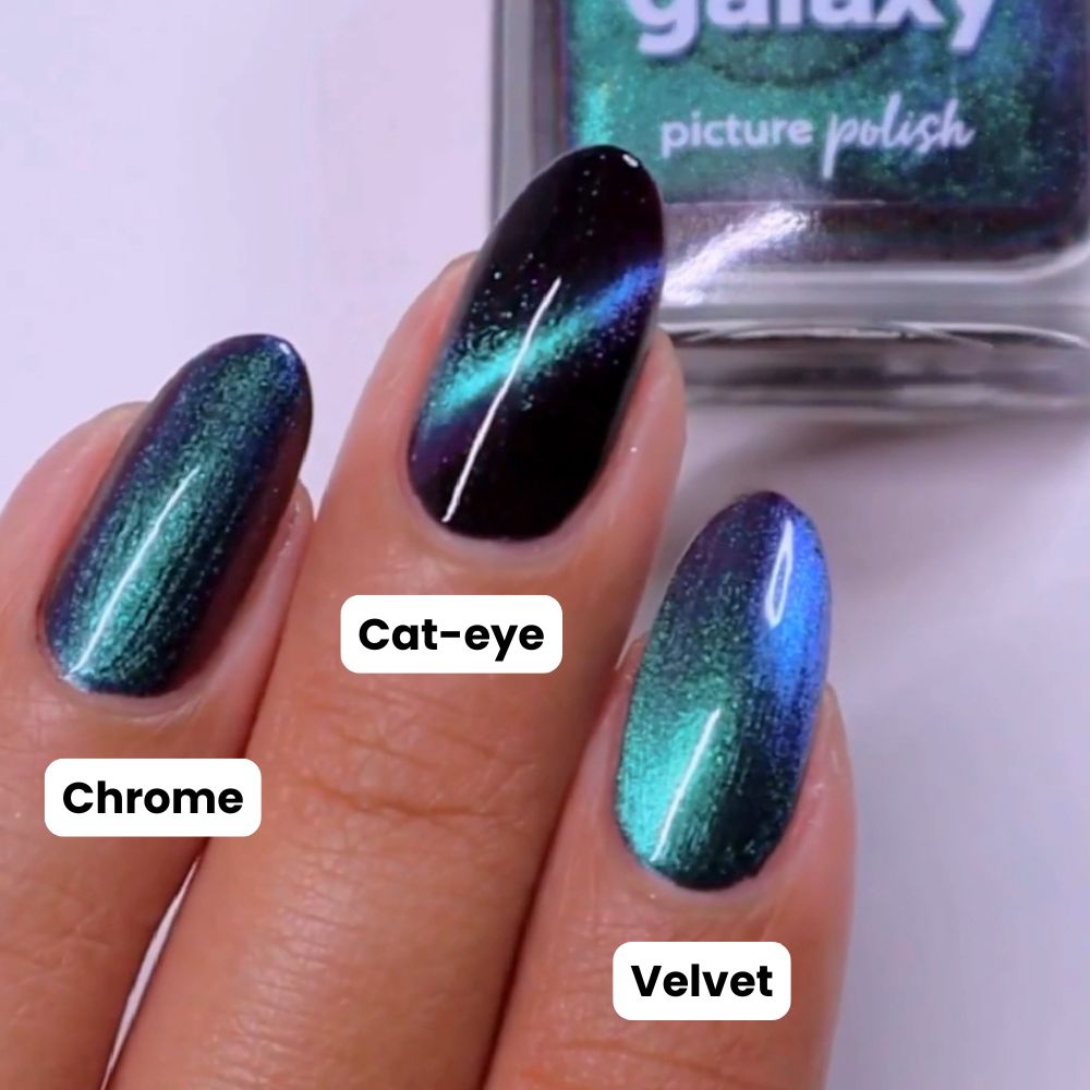 Create easy galaxy nails with this magnetic multi chrome polish and holo on top!