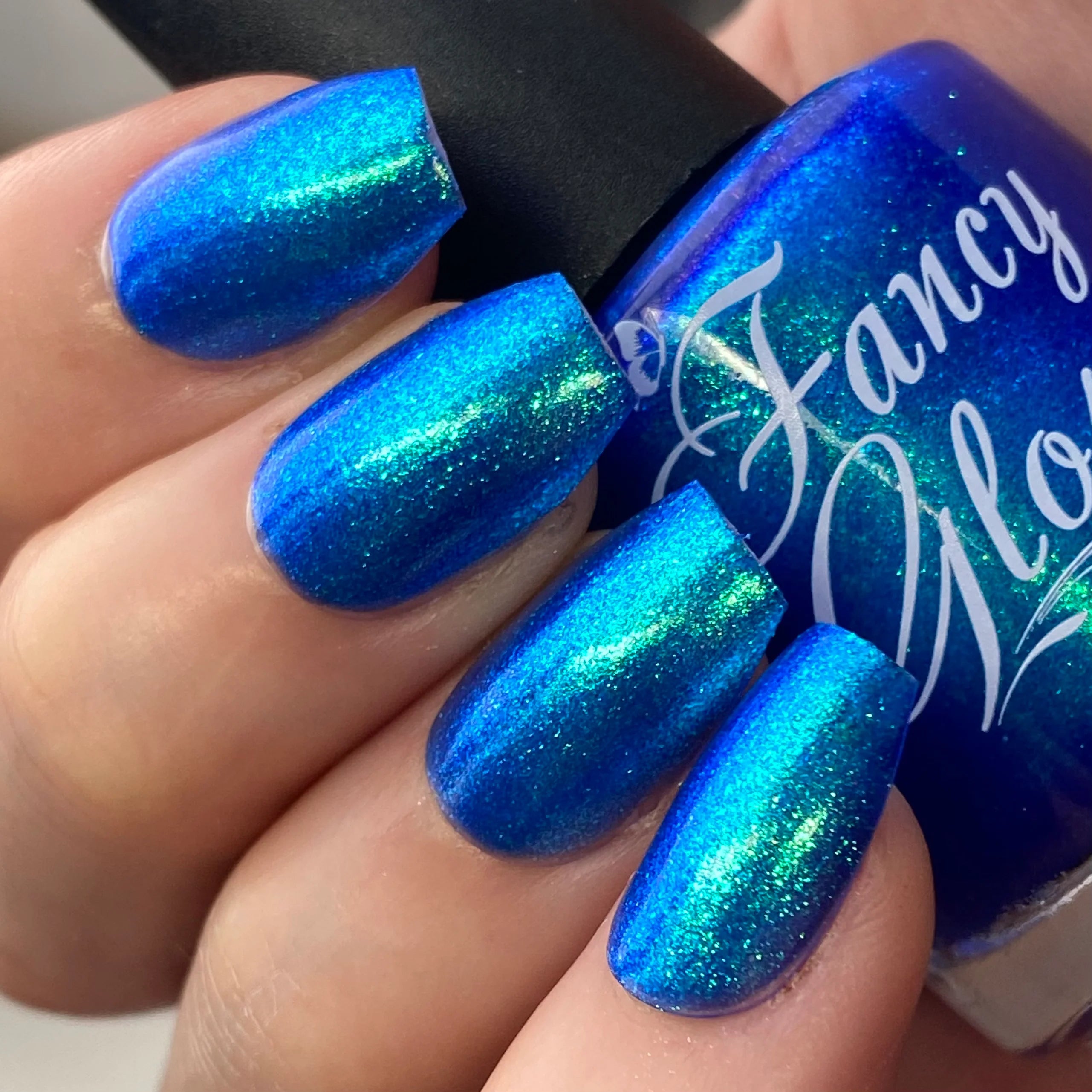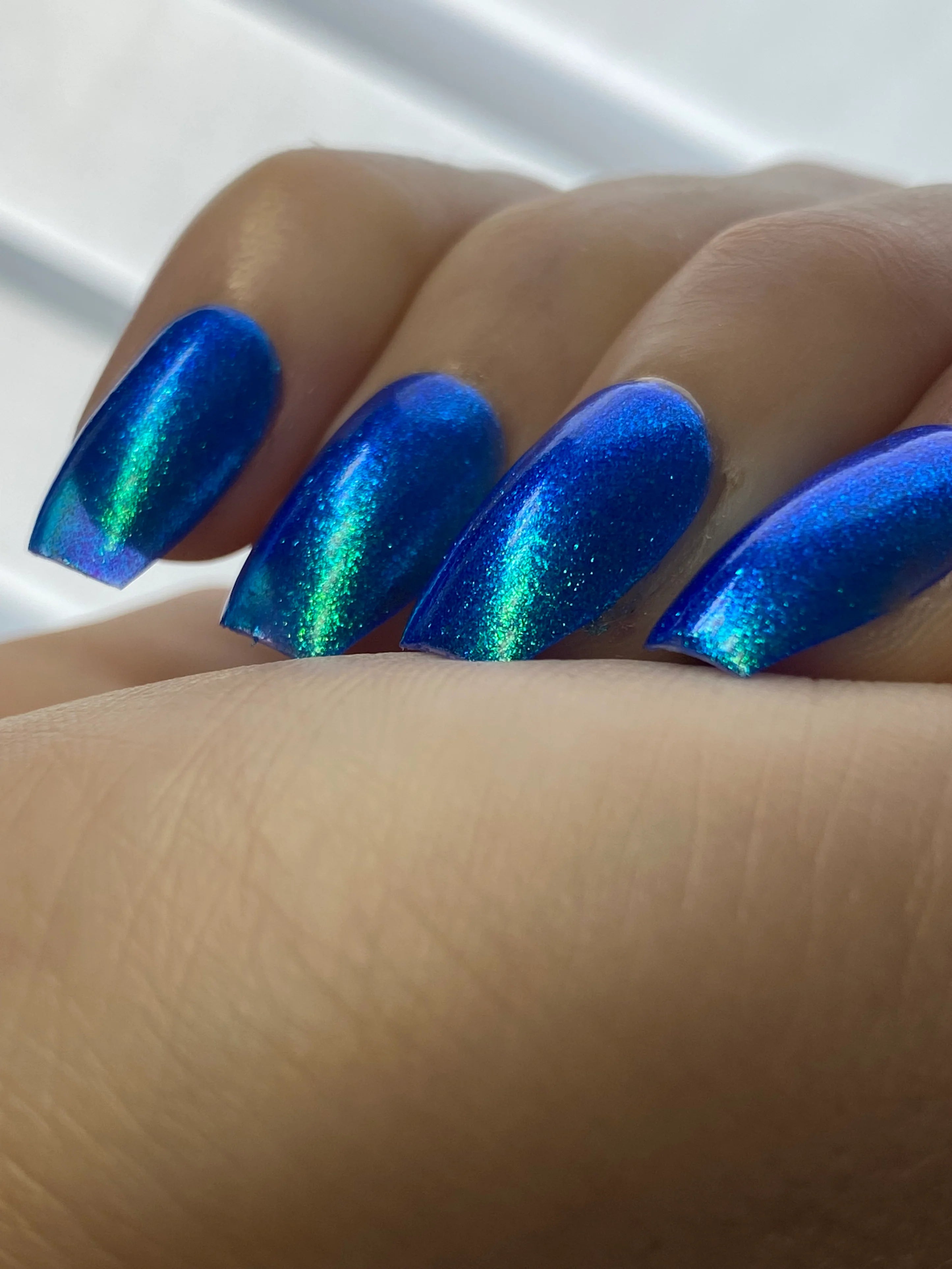 Cobalt blue base with strong blue/green/aqua shimmer.