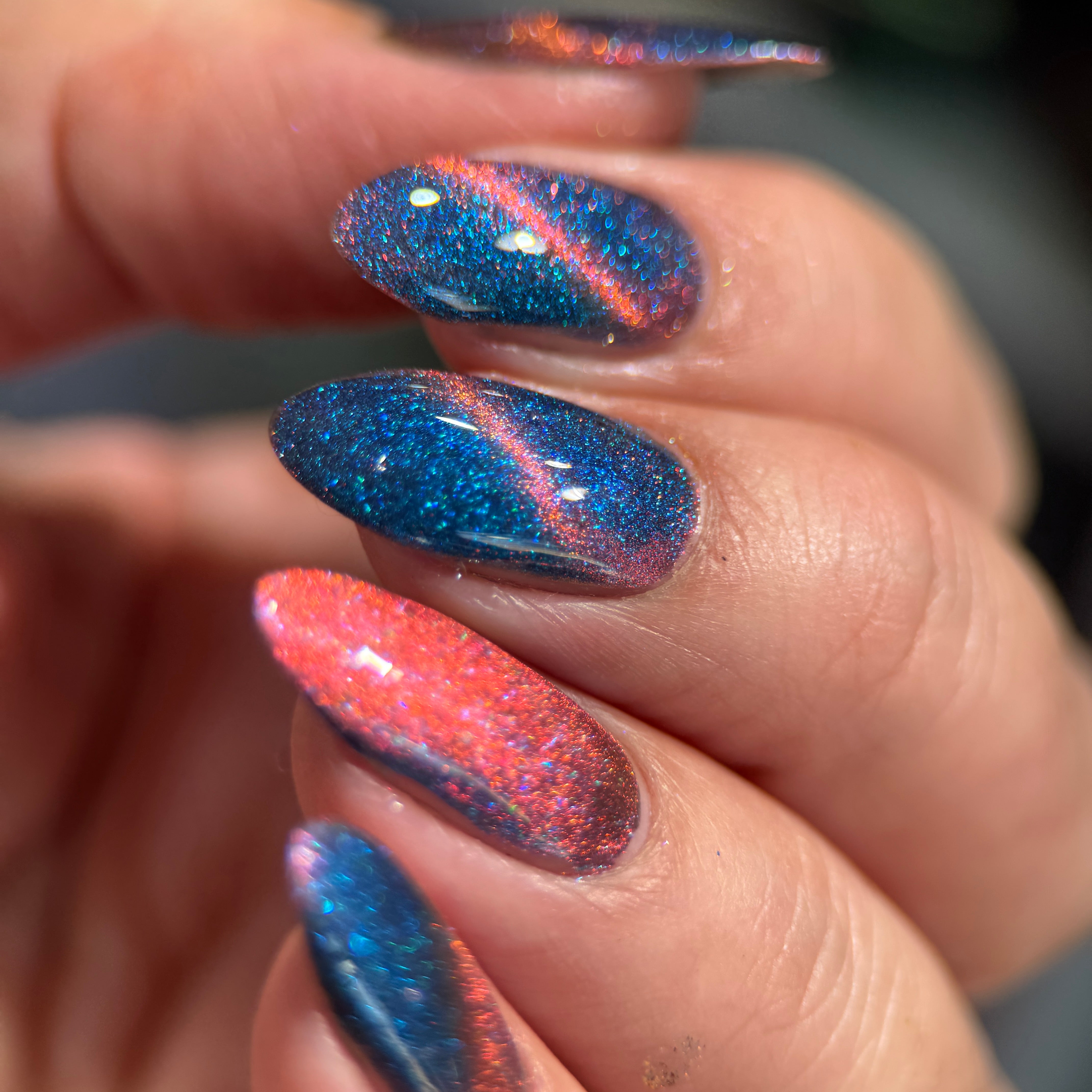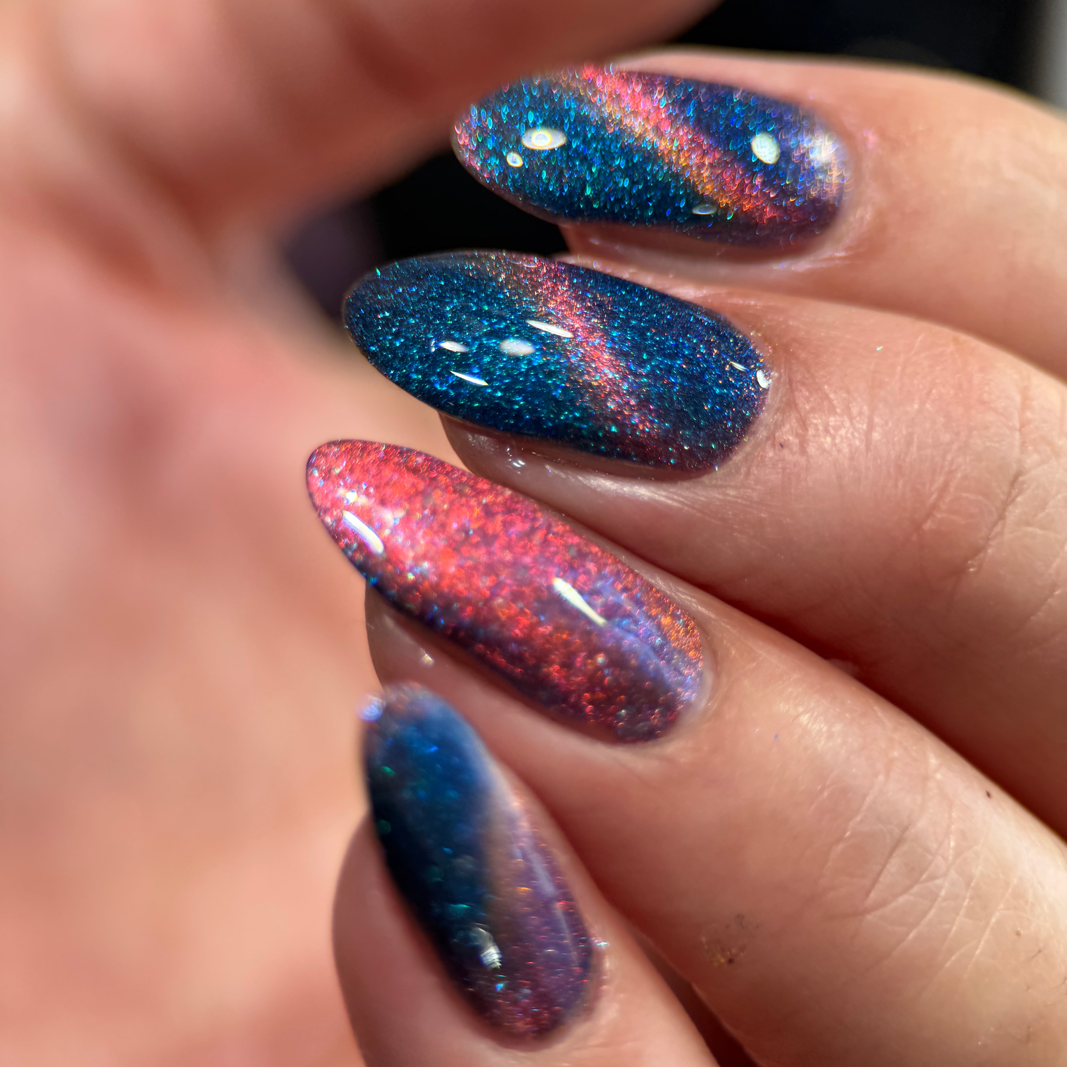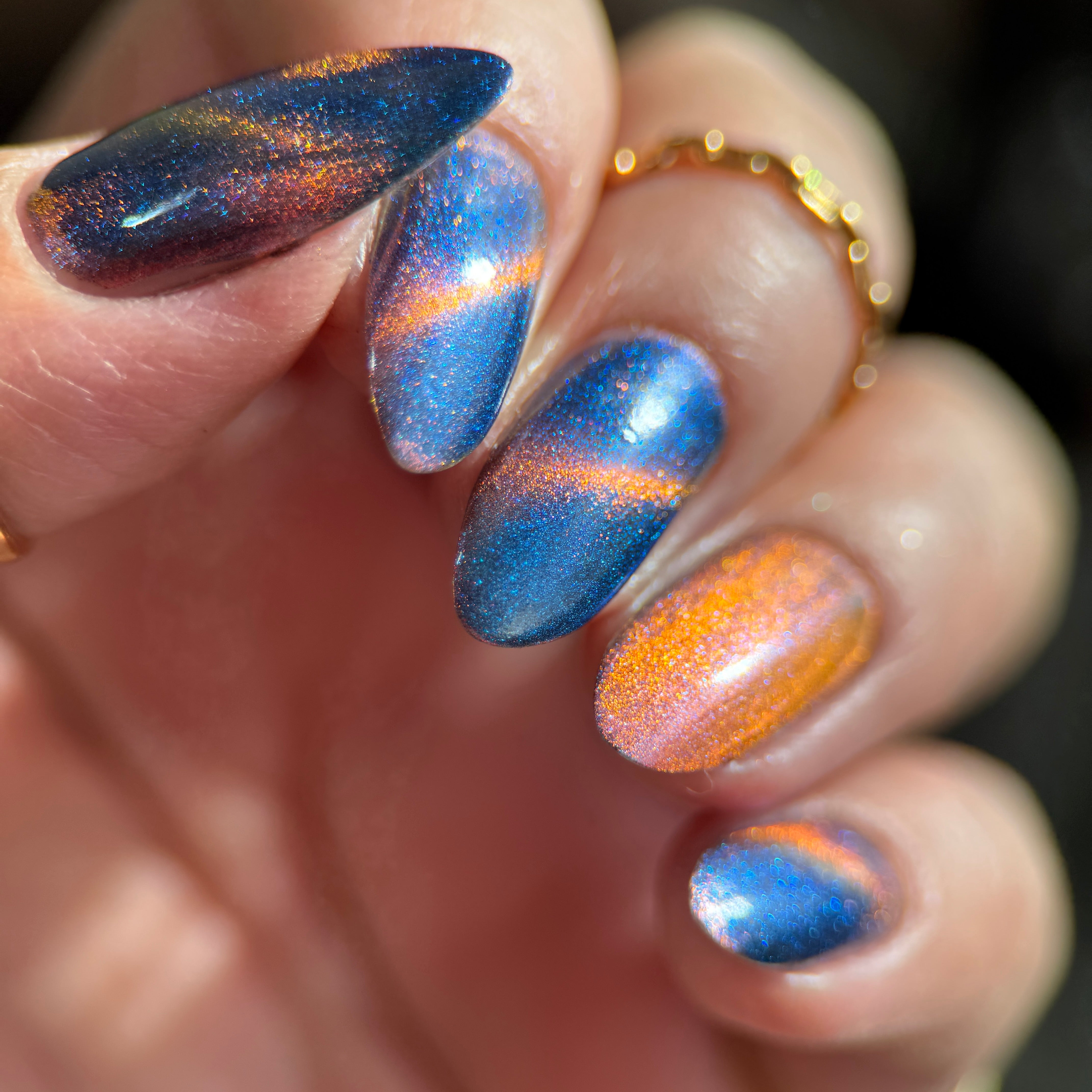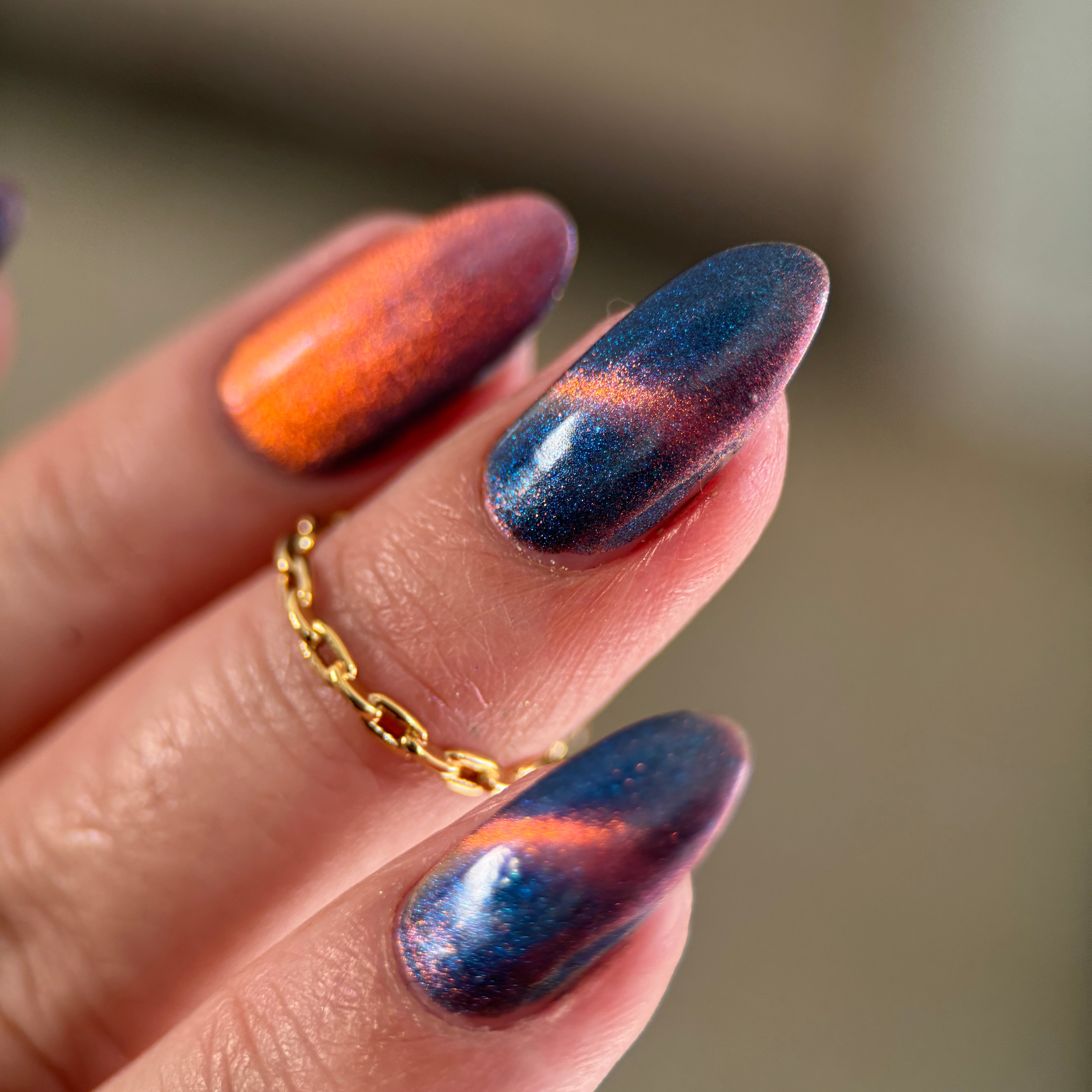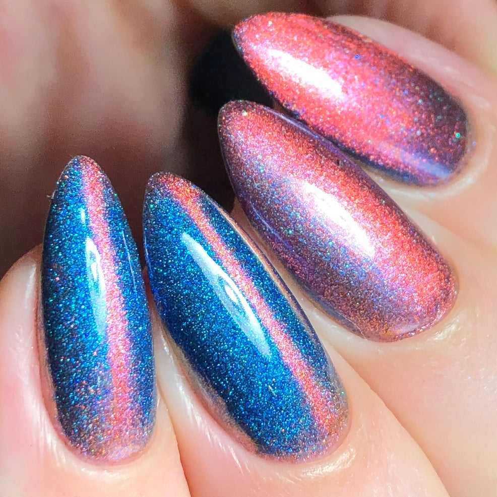 Primal Instinct (Beast Man inspired) has red/orange magnetic base with blue aurora shimmer