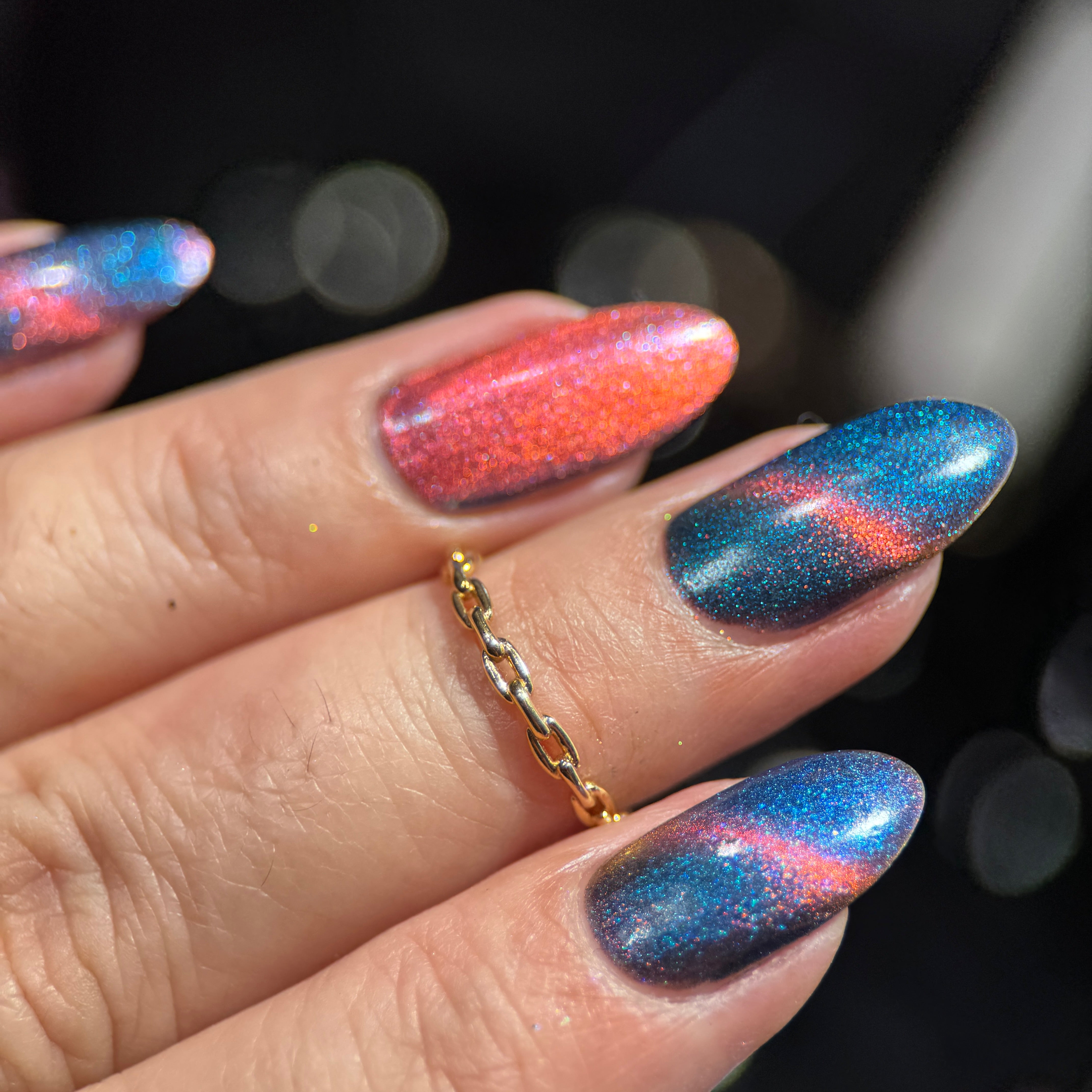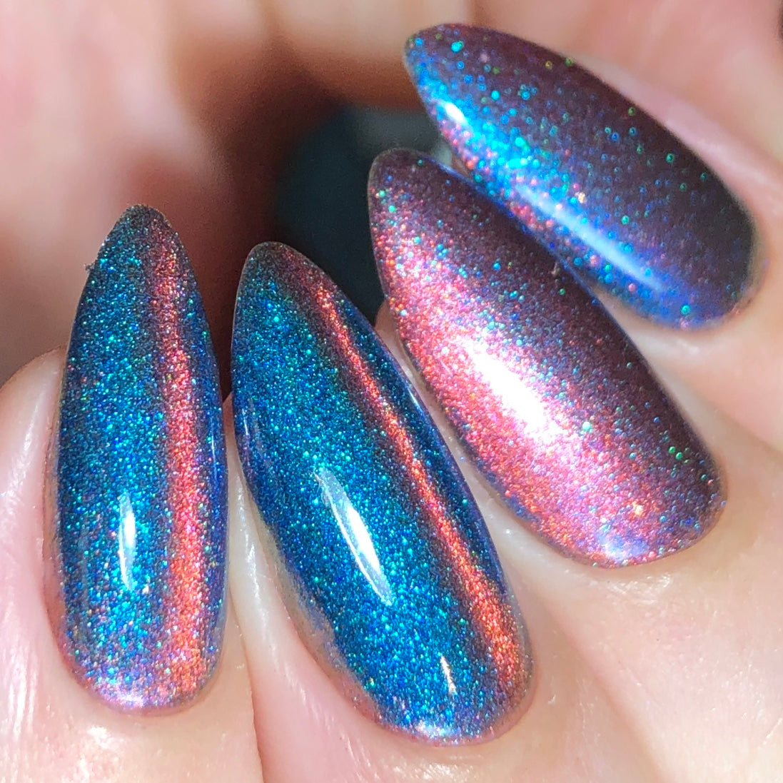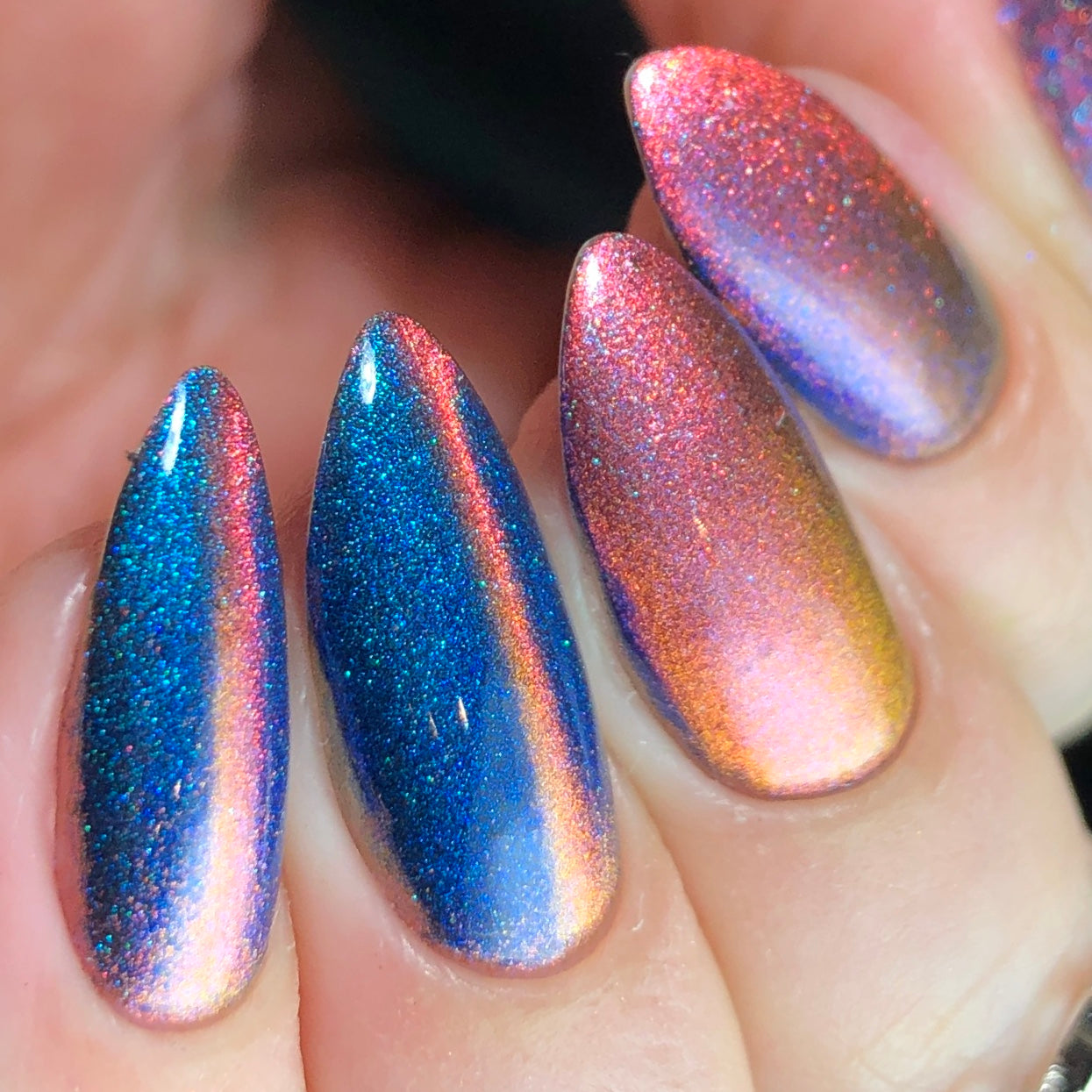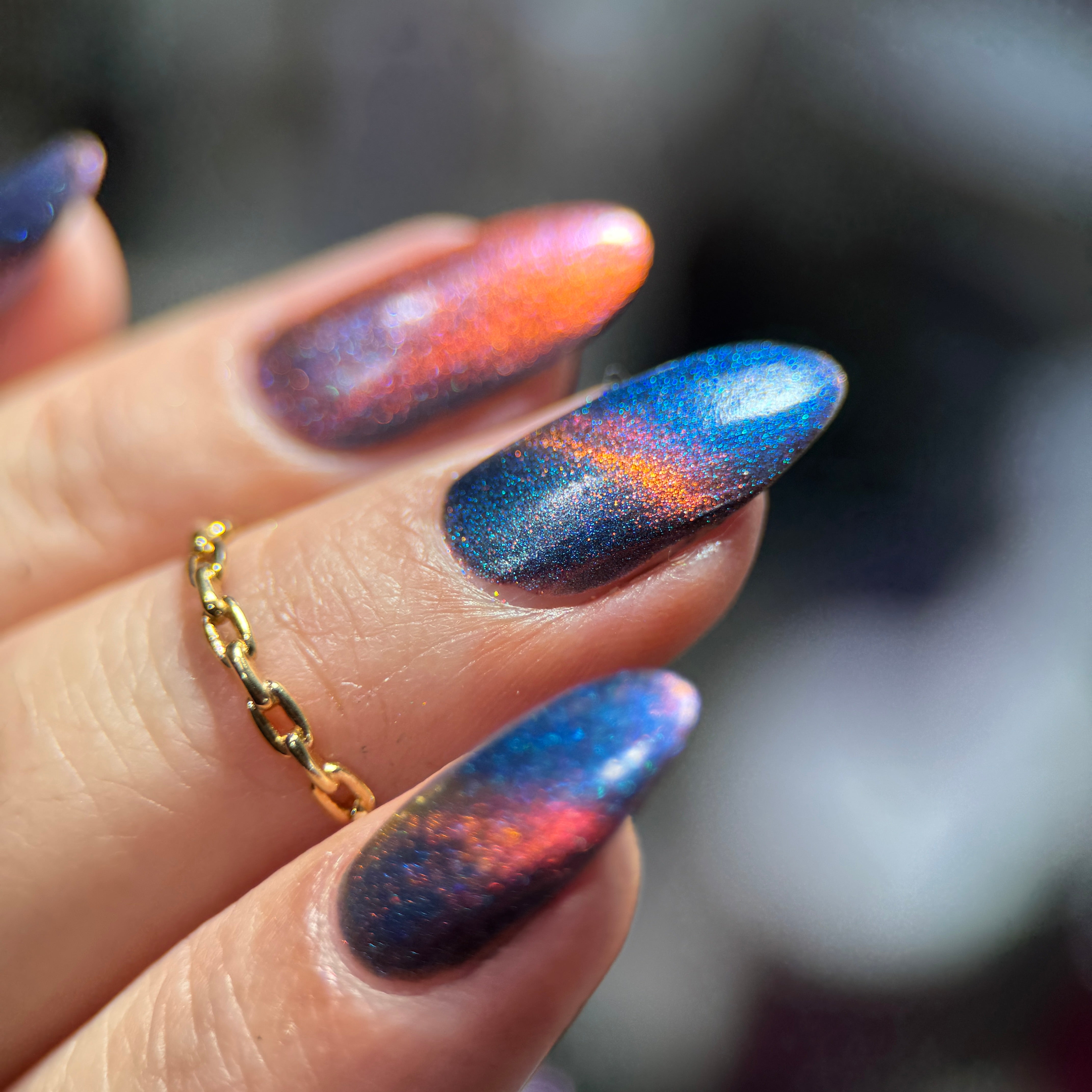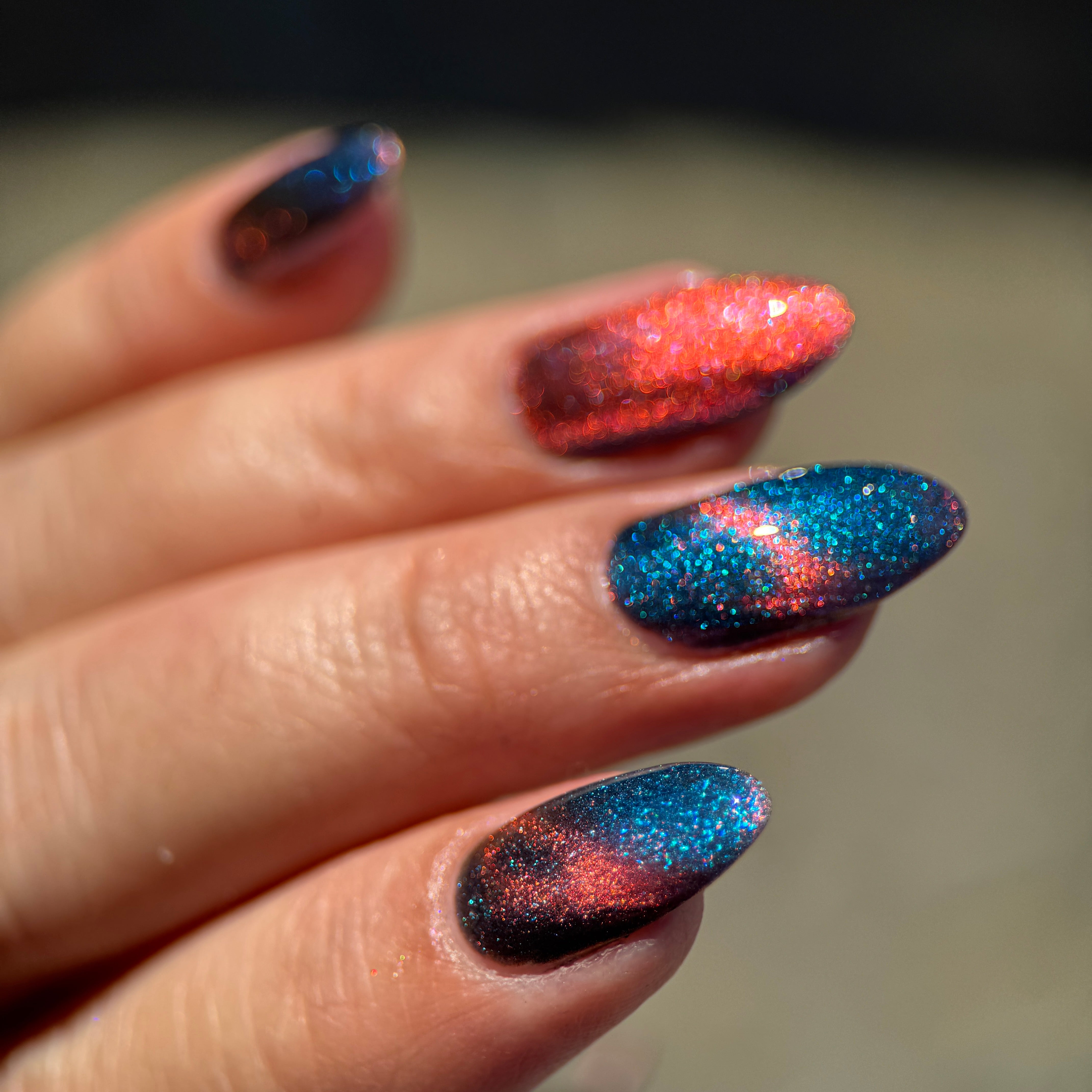 Primal Instinct (Beast Man inspired) has red/orange magnetic base with blue aurora shimmer
