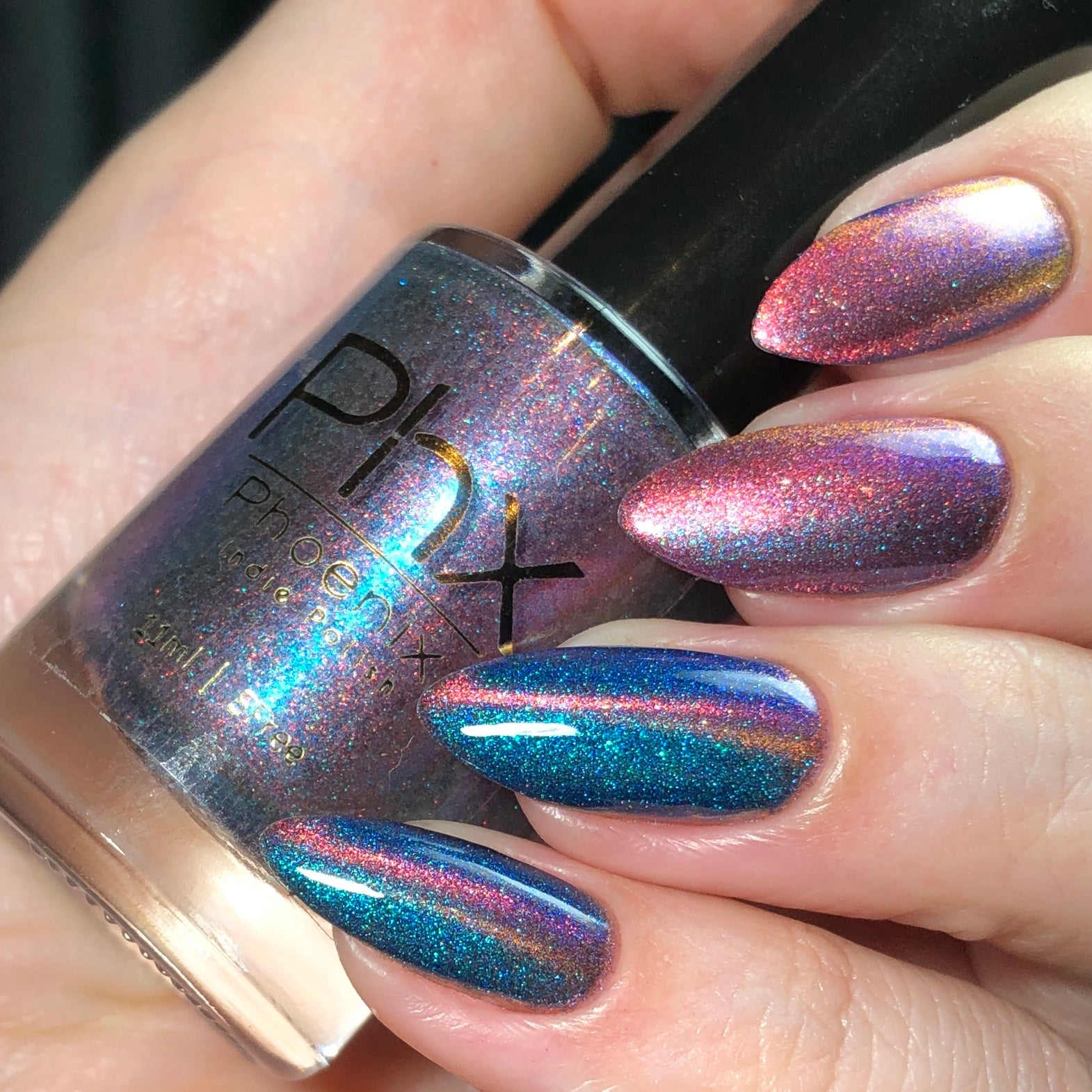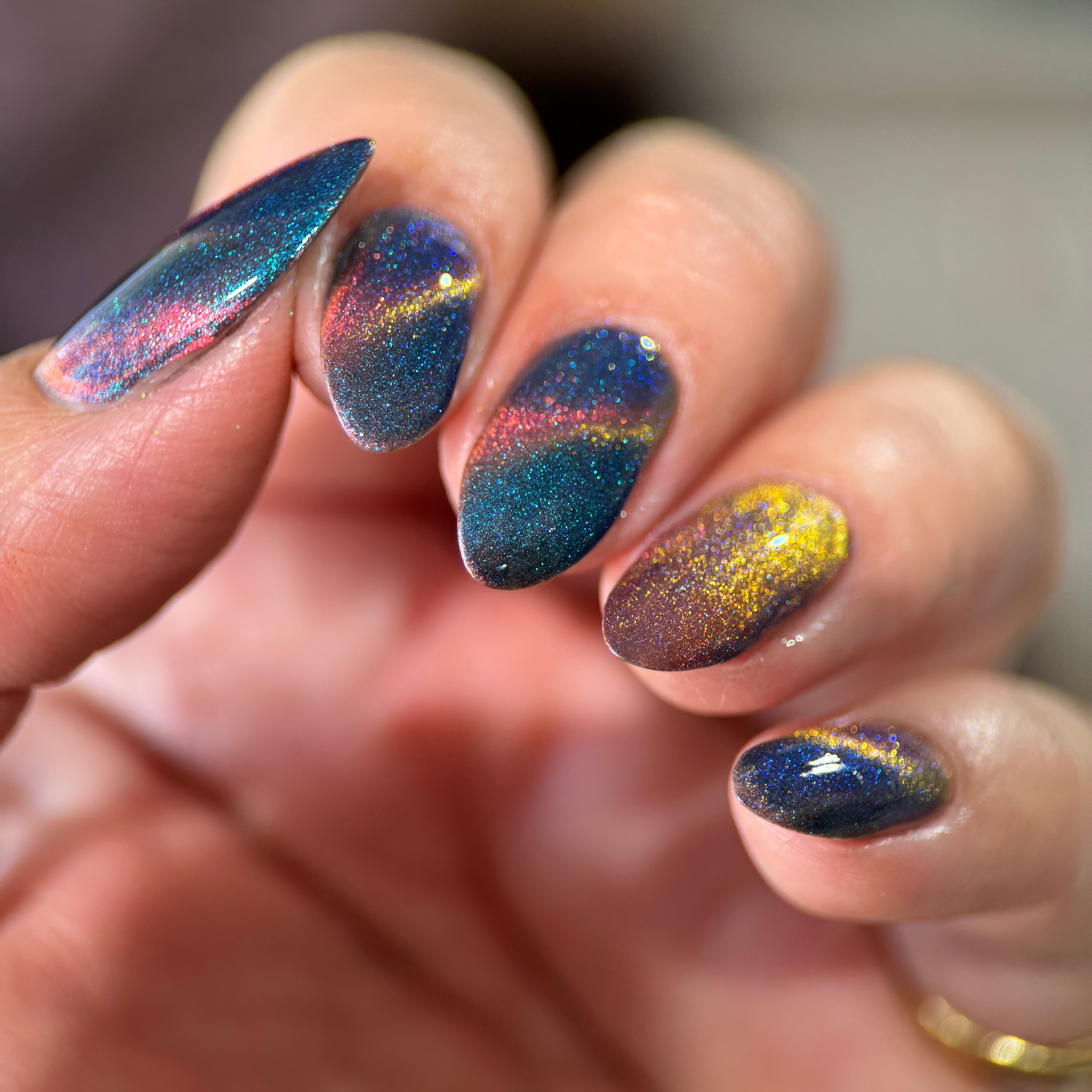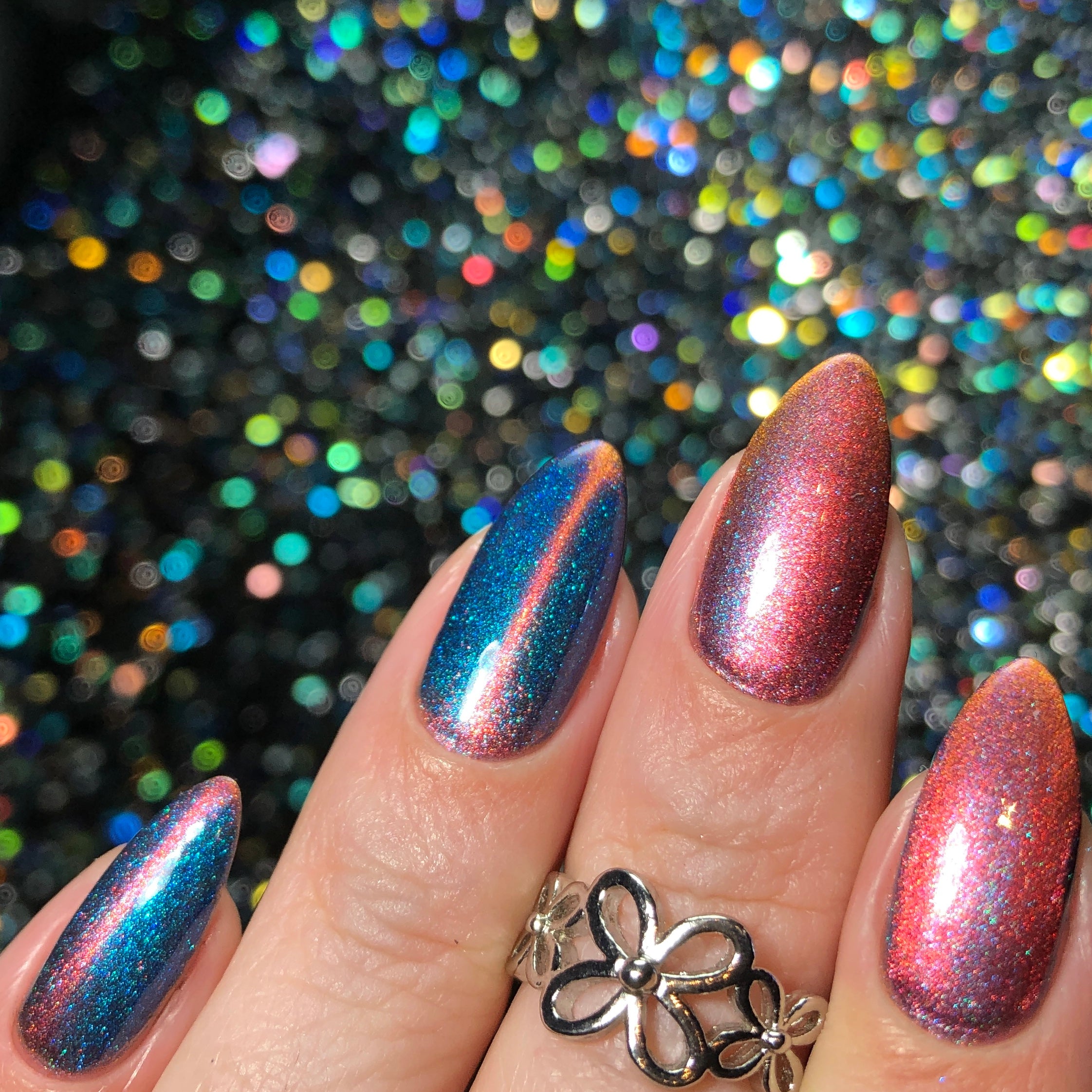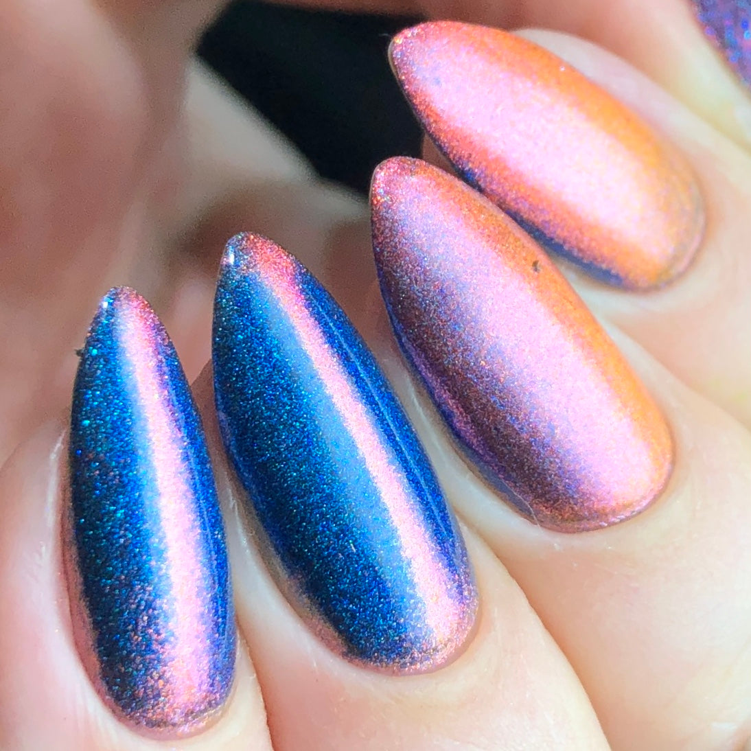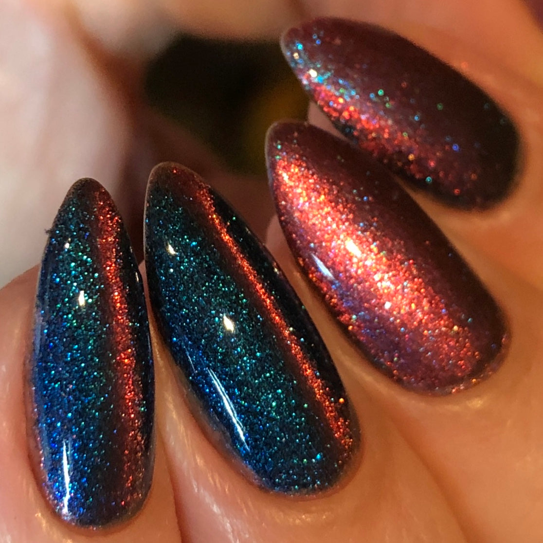Primal Instinct (Beast Man inspired) has red/orange magnetic base with blue aurora shimmer