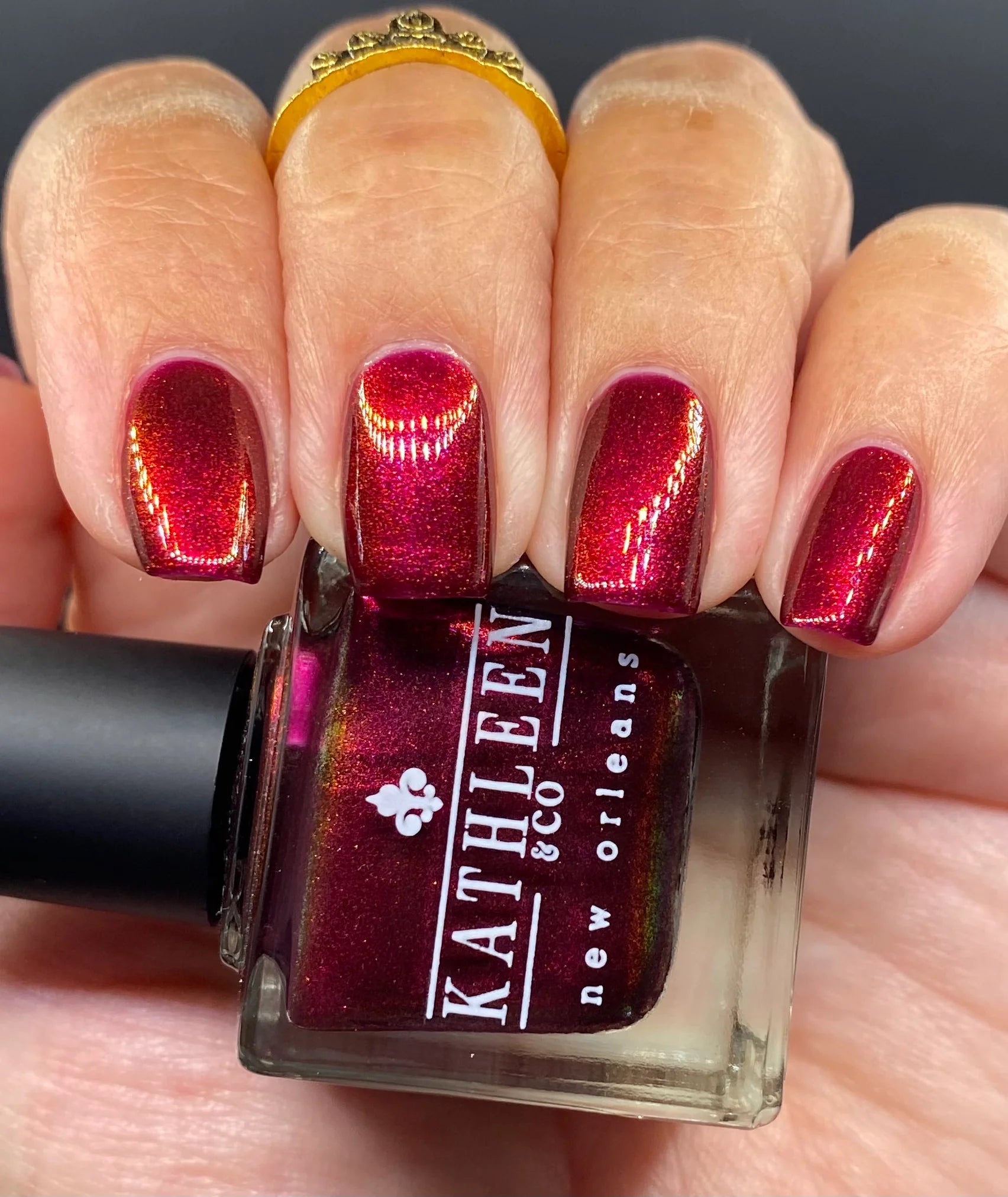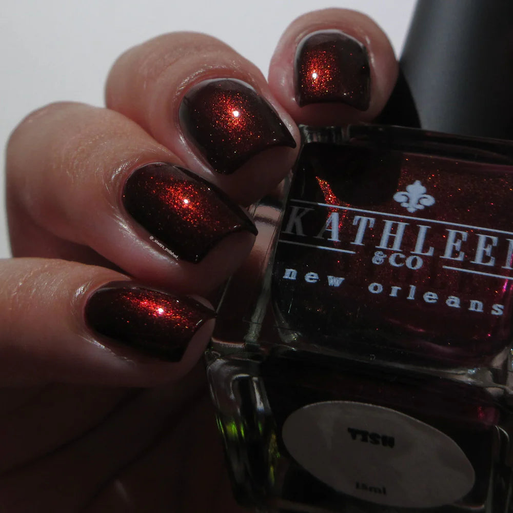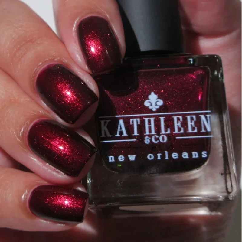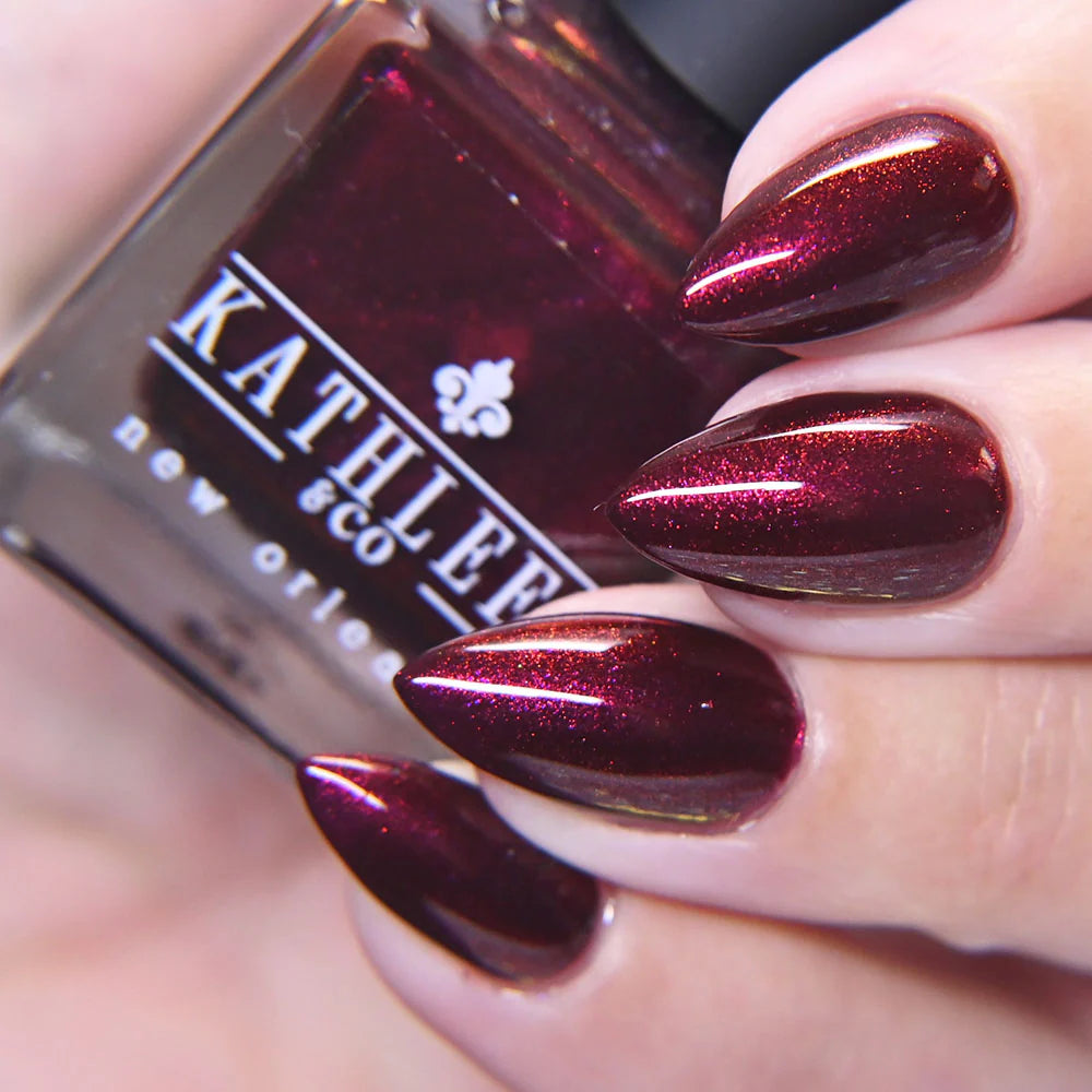 Blackened red base with glowy pinky red shimmer.