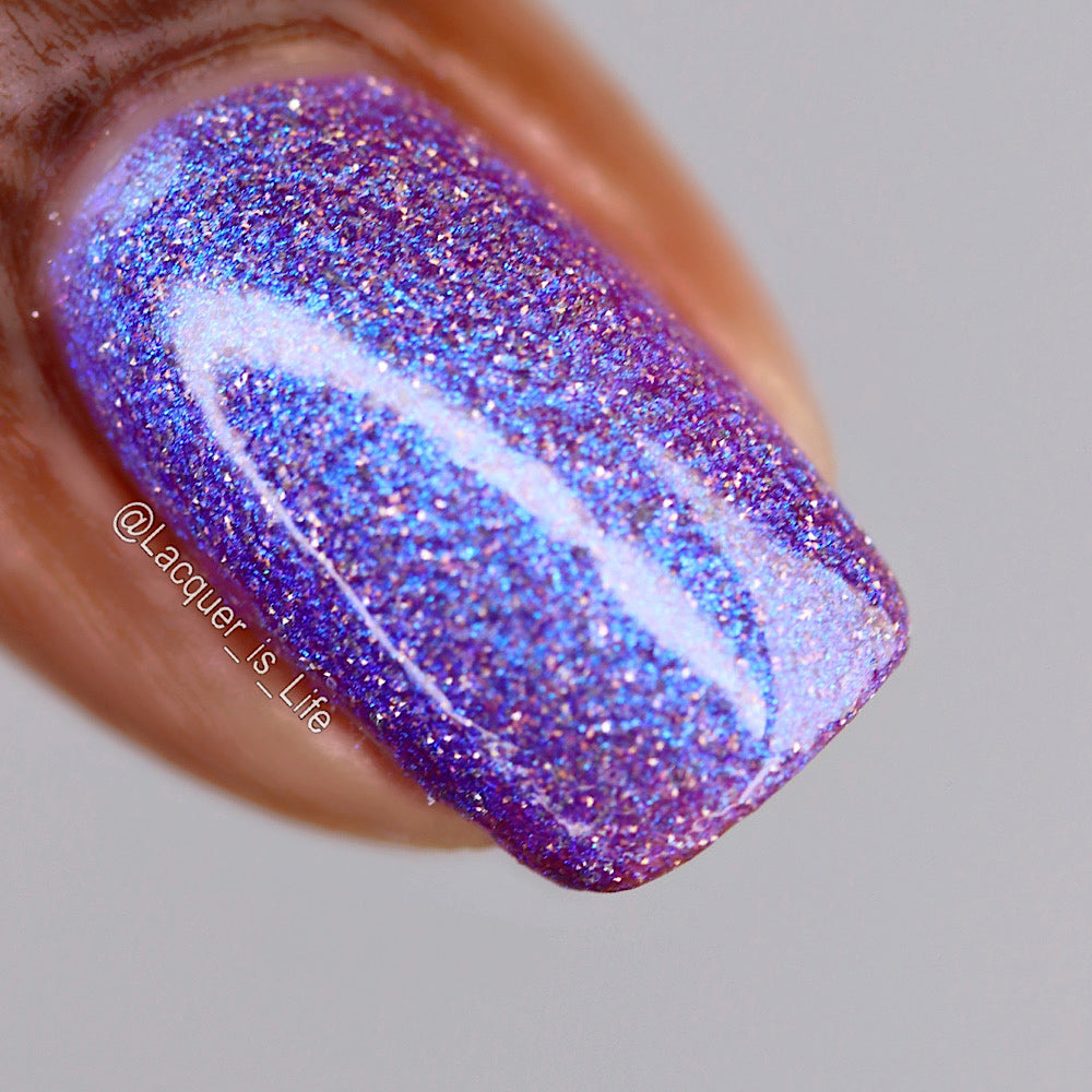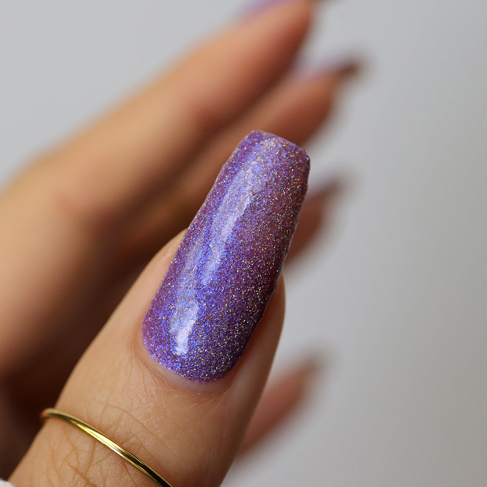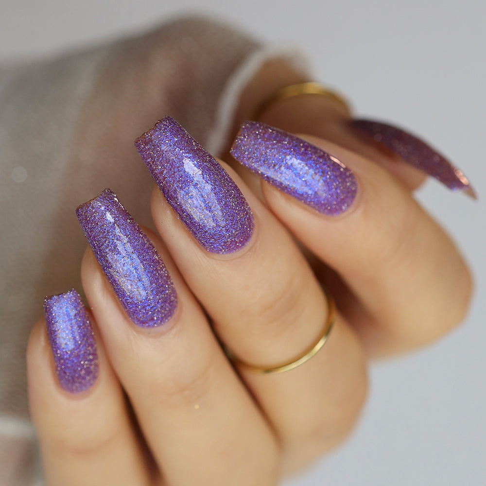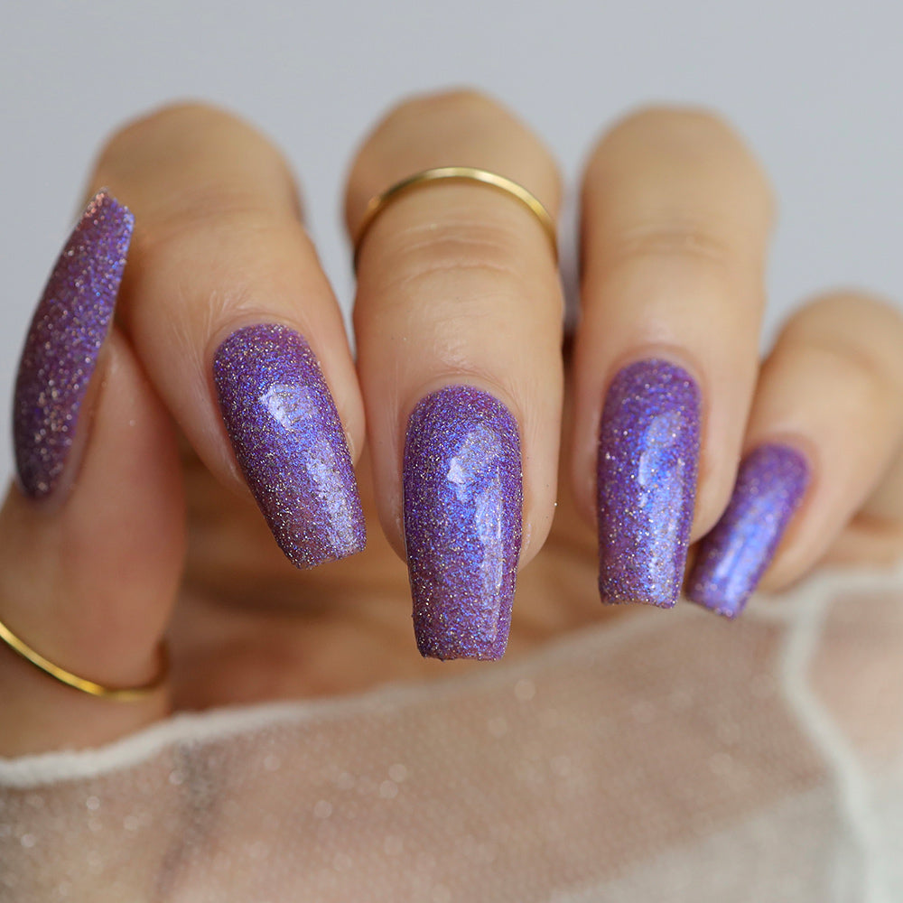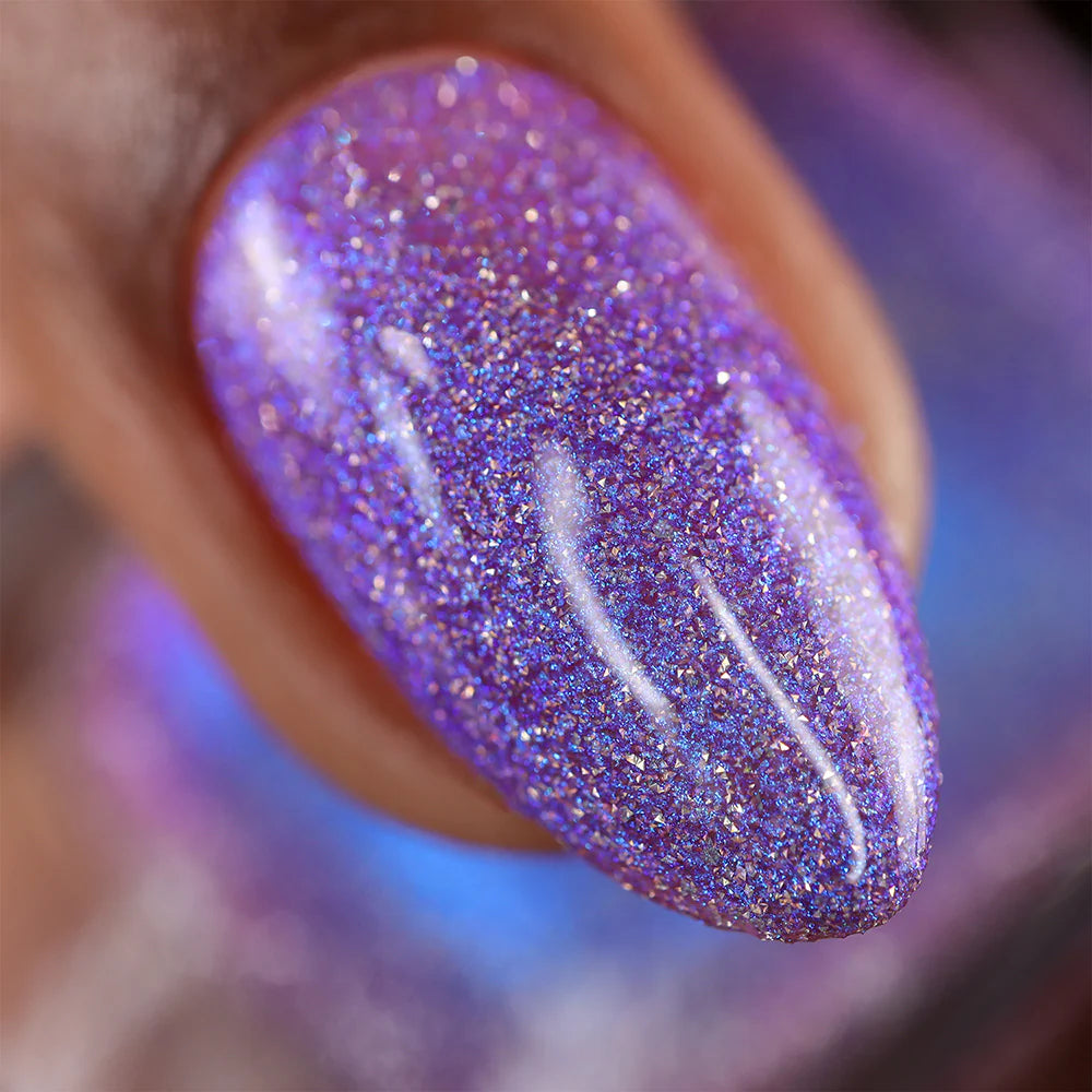 A purple nail polish with a pink to gold shifting aurora shimmer and silver reflective glitter. Reflective glitter is unique to other glitters in the way it refracts light.In low...
