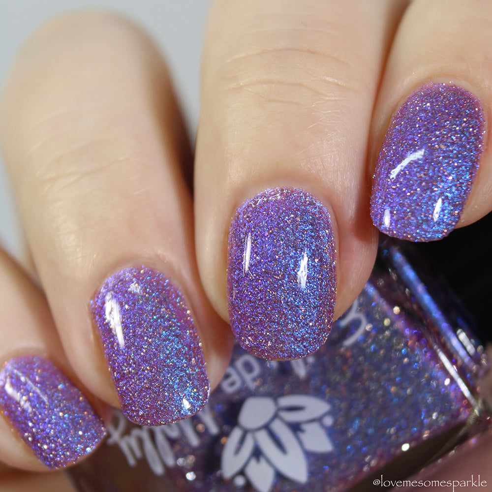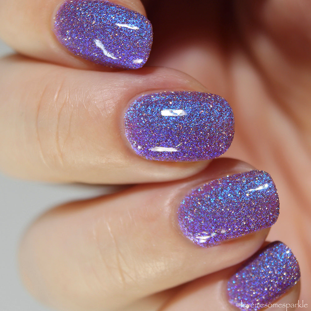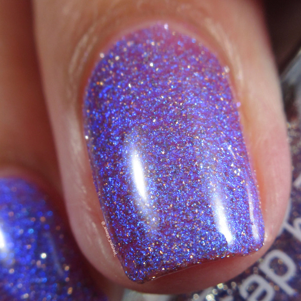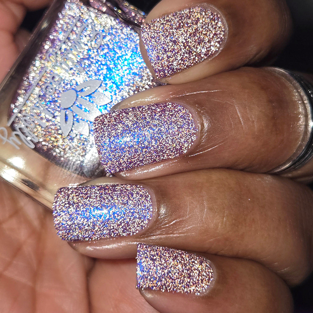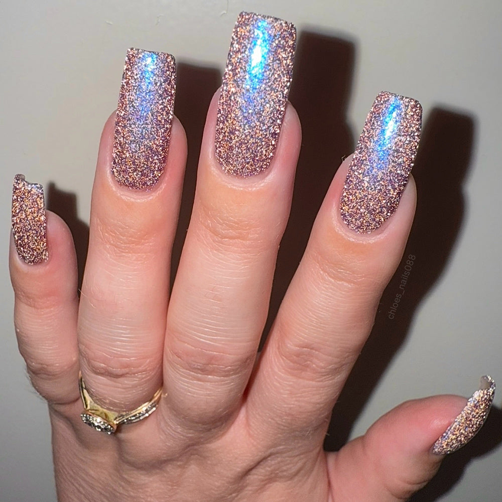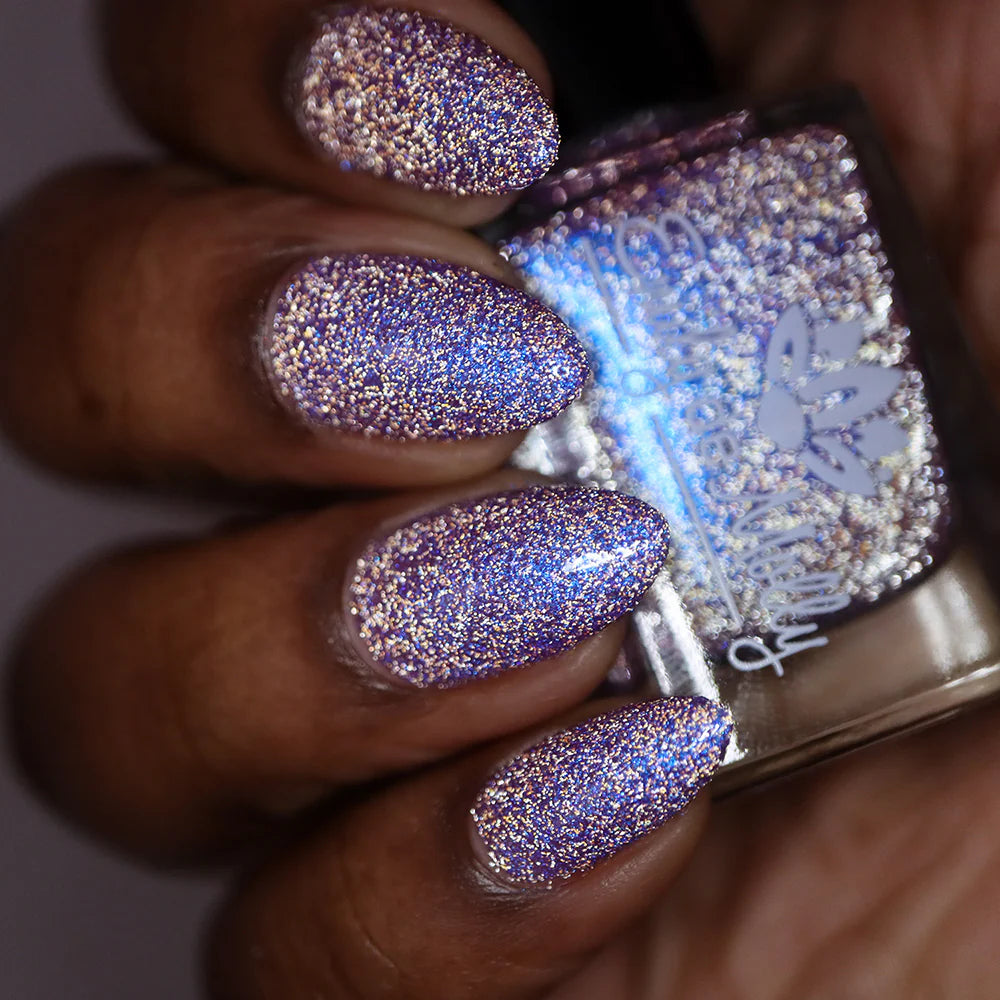 A purple nail polish with a pink to gold shifting aurora shimmer and silver reflective glitter. Reflective glitter is unique to other glitters in the way it refracts light.In low...