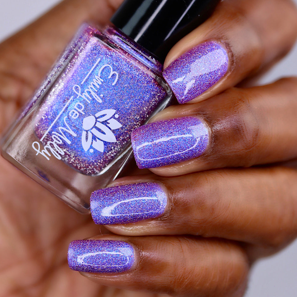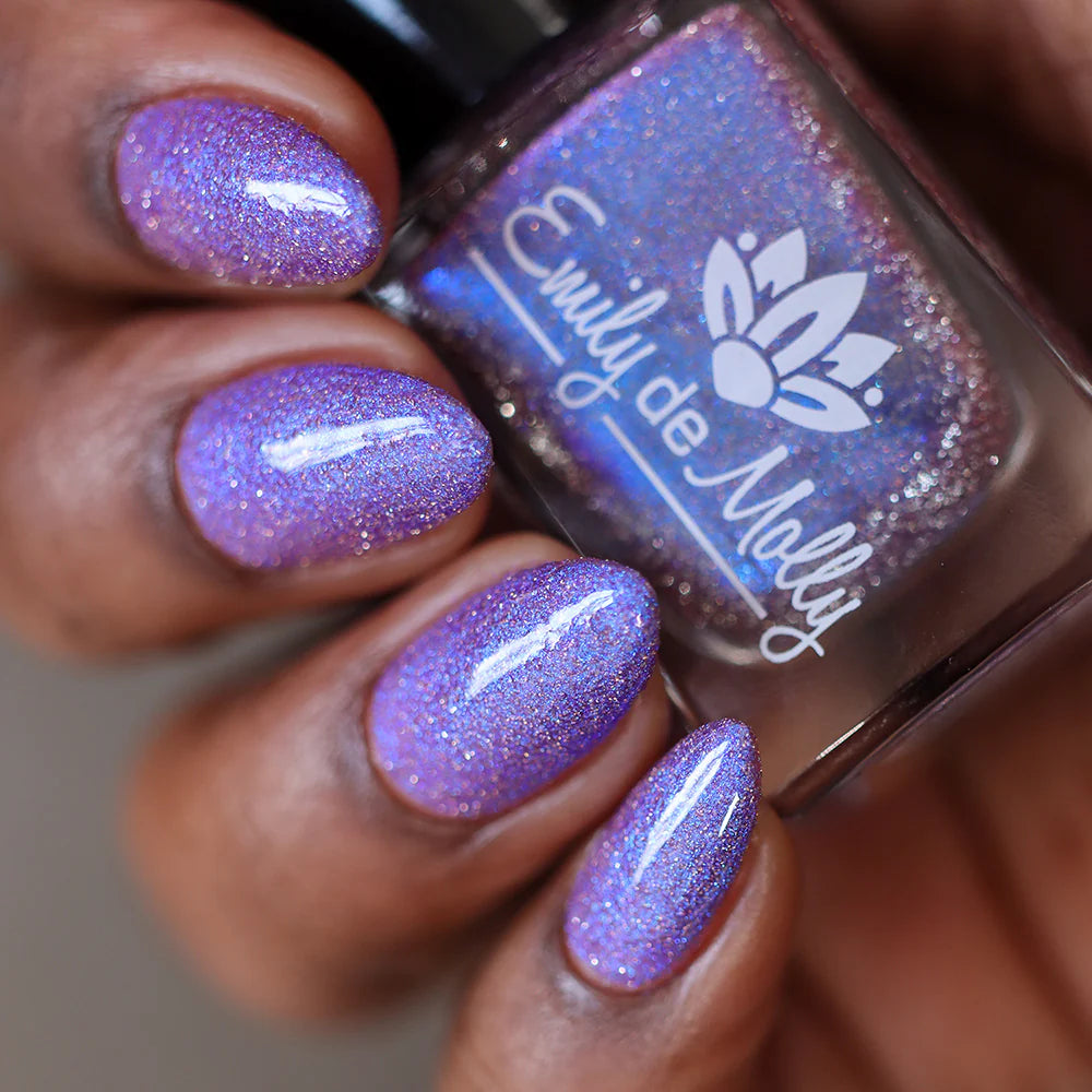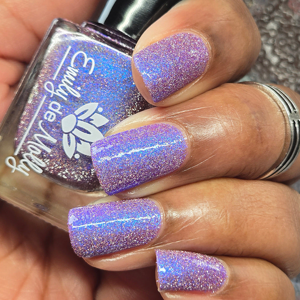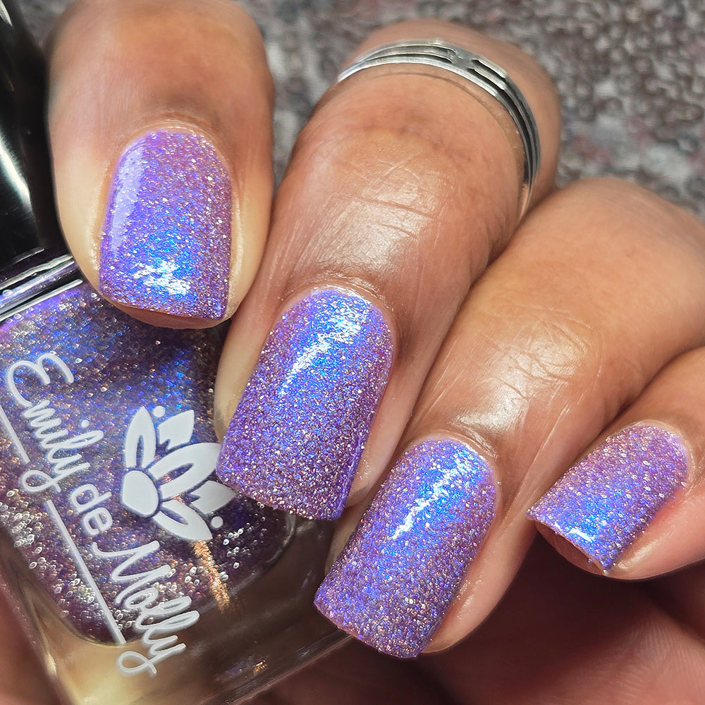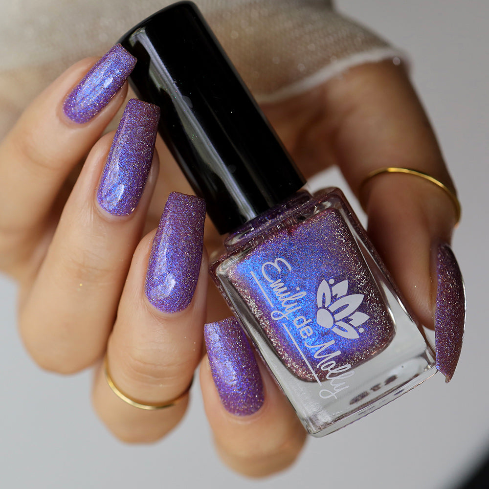 A purple nail polish with a pink to gold shifting aurora shimmer and silver reflective glitter. Reflective glitter is unique to other glitters in the way it refracts light.In low...