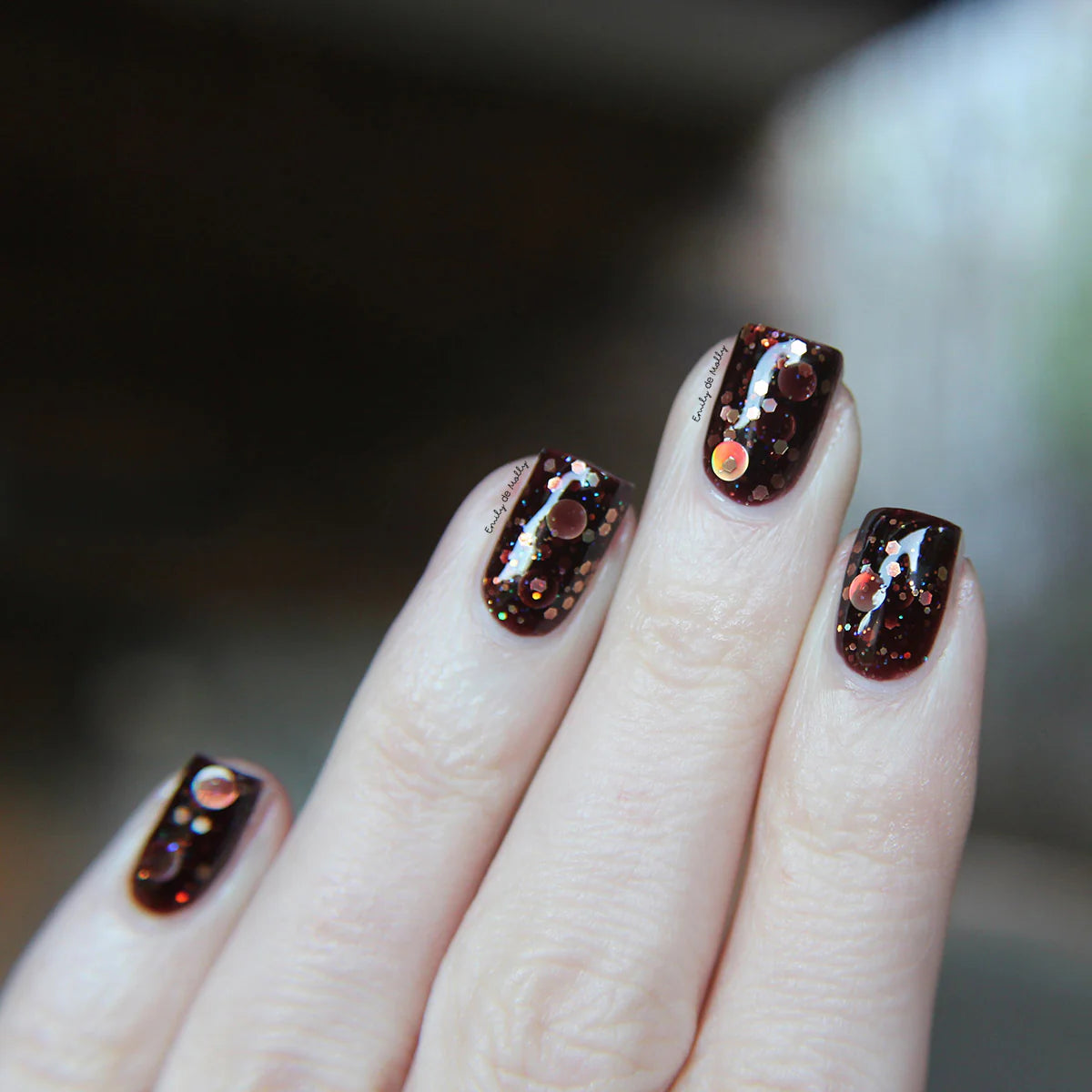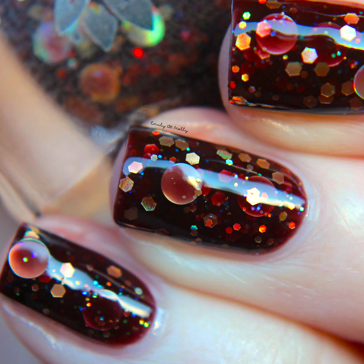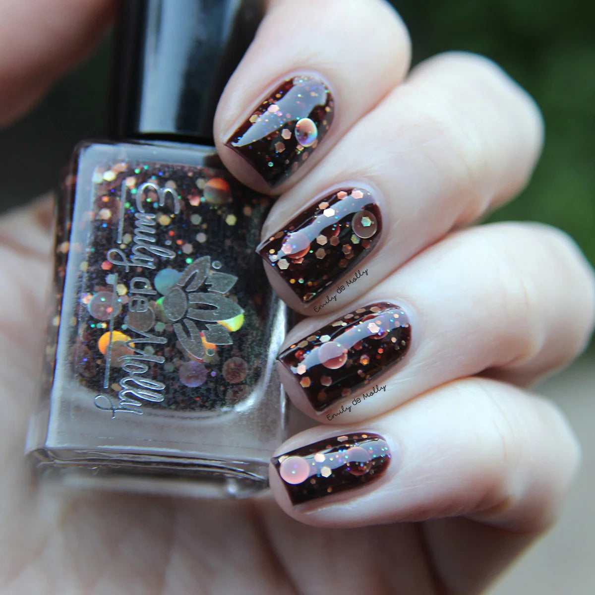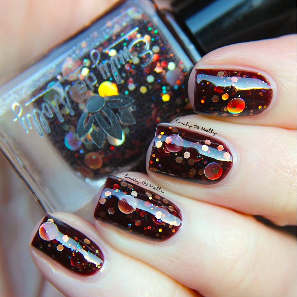 A dark brown jelly nail polish with holographic gold glitters and micro iridescent glitters.