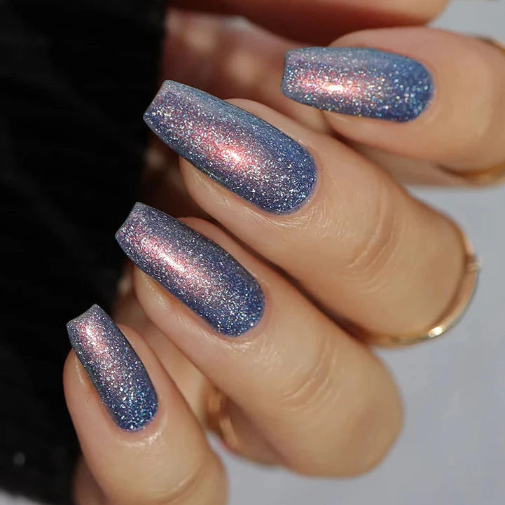 A dusty blue nail polish with a copper / gold / green shifting aurora shimmer and silver holographic micro flakes.