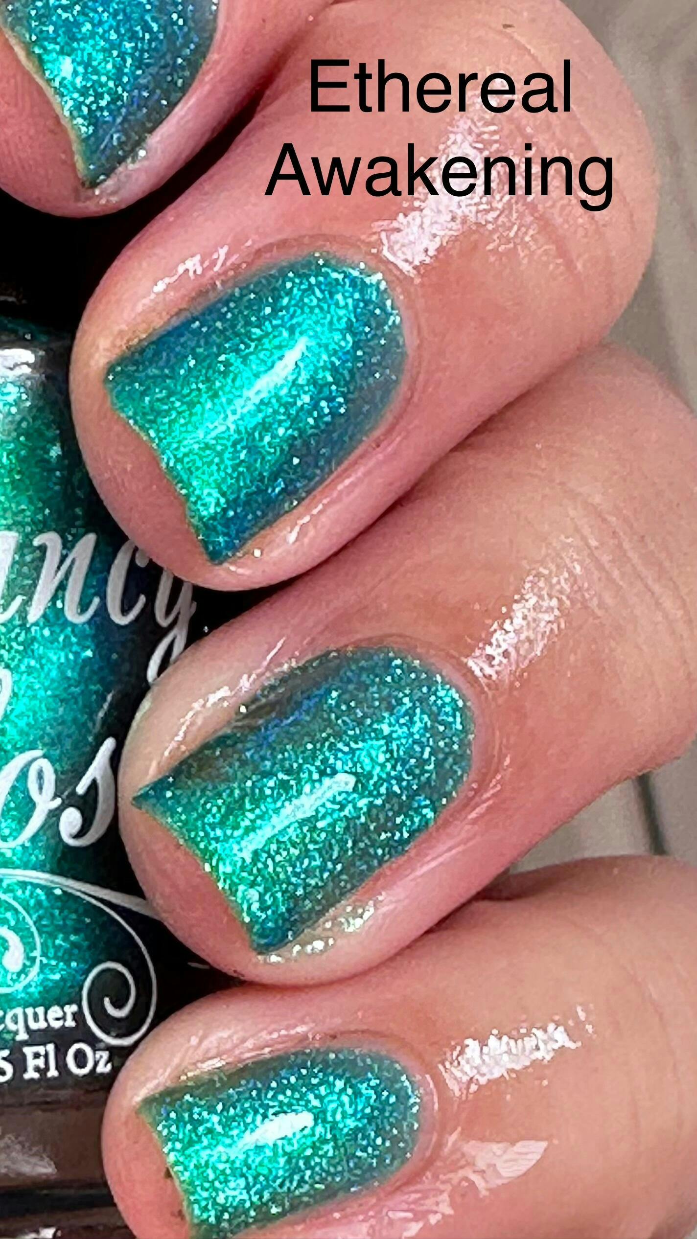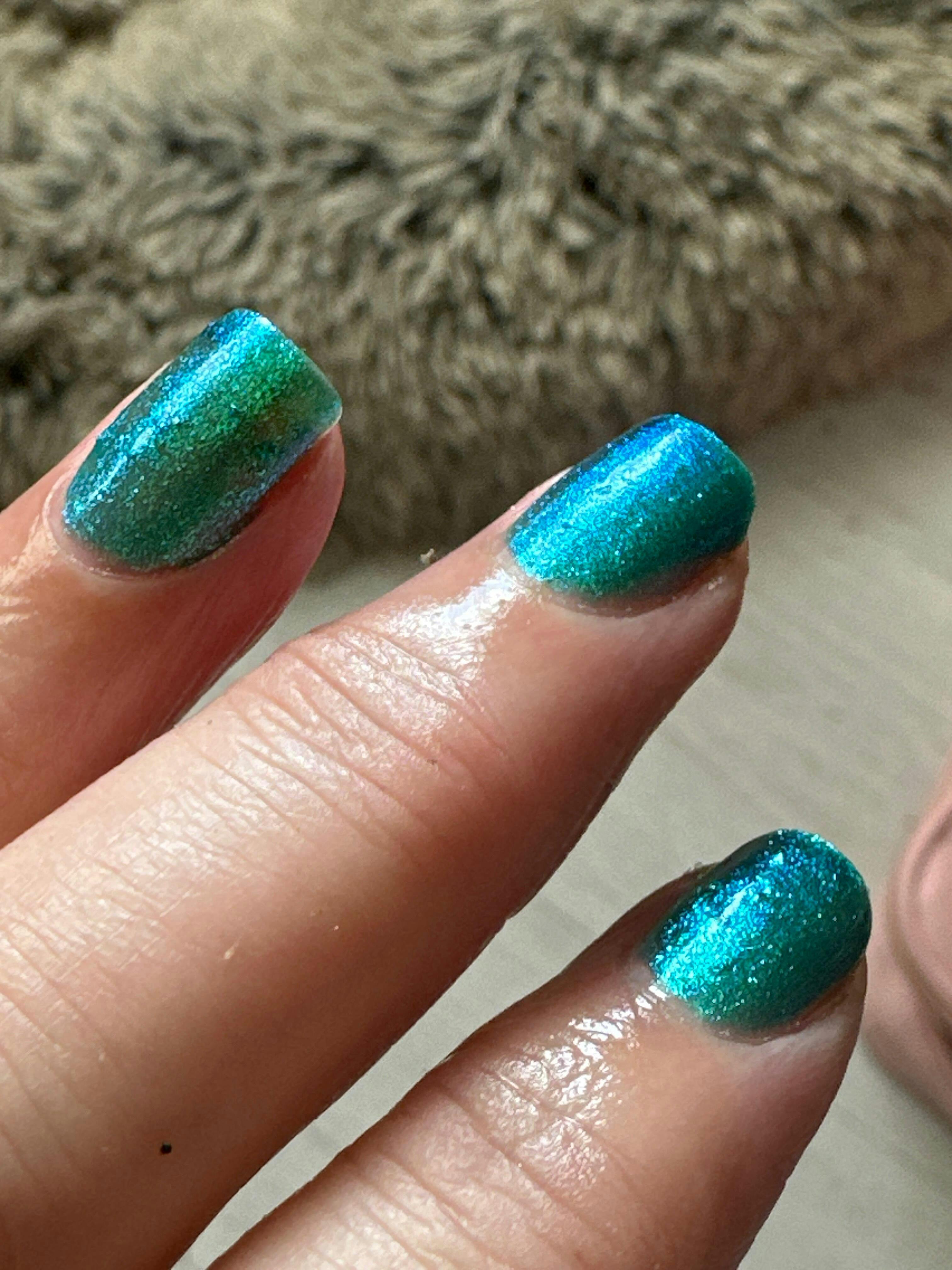 A Turquoise,Blue and Green bright shimmer.Its a fabulous Fancy Gloss - Jackie(the creator) mixes a mean polish and this one is no exception.Great quality of pigment and saturation of colour. It paints like a dream - this picture is two coats and a coat of Glisten and Glow topcoat. It’s a don’t drive if wearing it kind of polish 💅