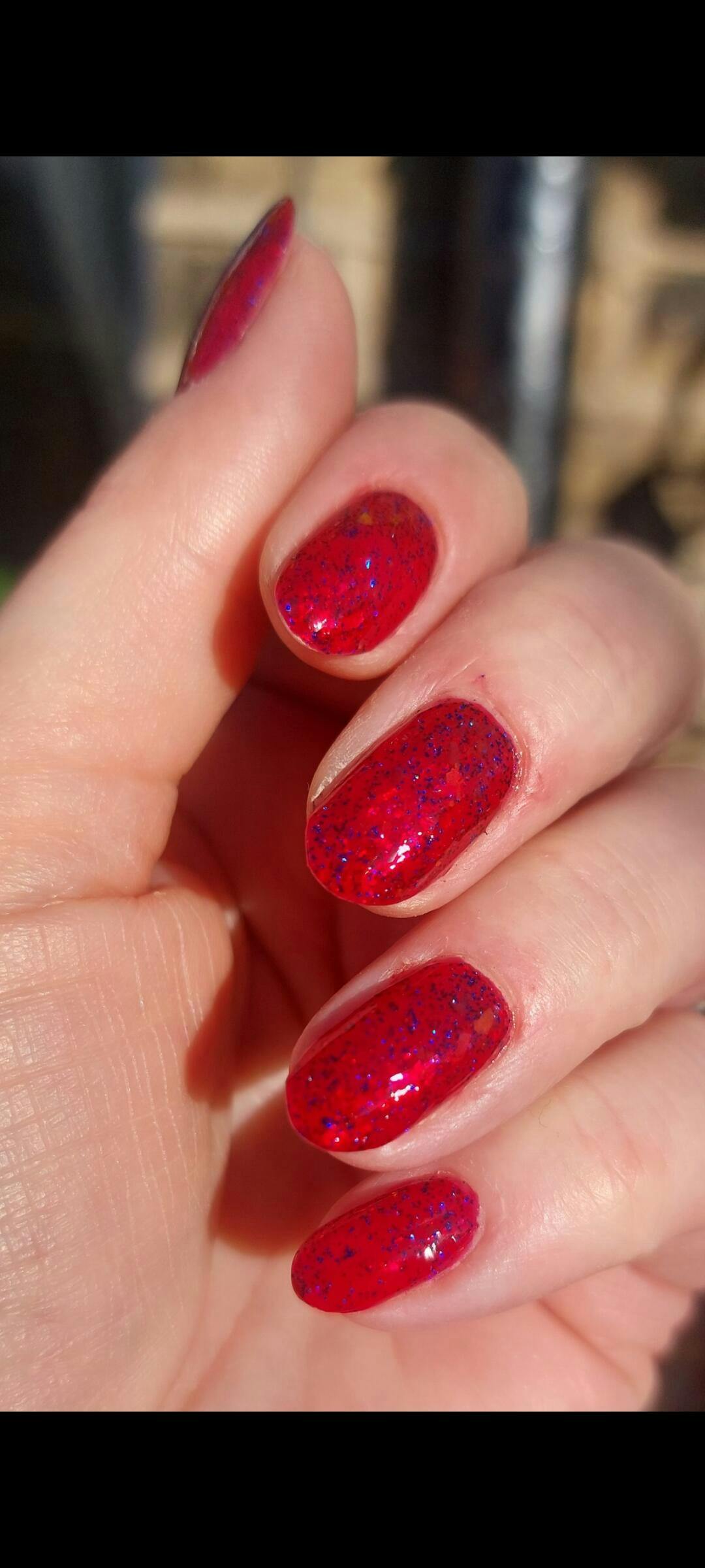 Get Over The Zarg Nuts: red cherry jelly base with red to golden iridescent chunky flakes and blue galaxy glitter