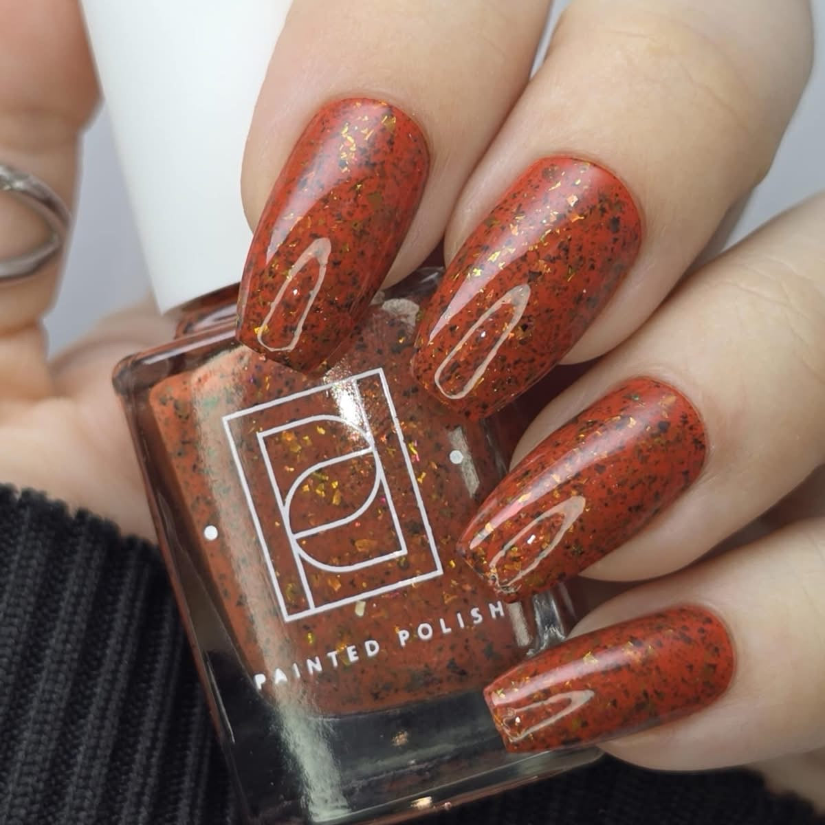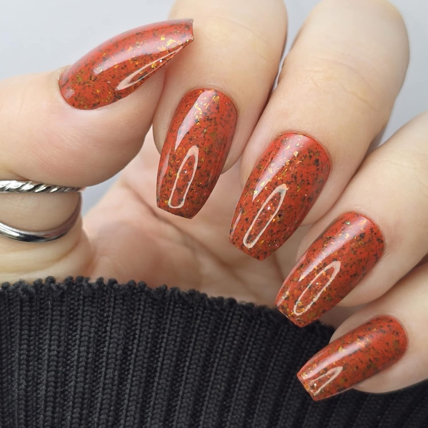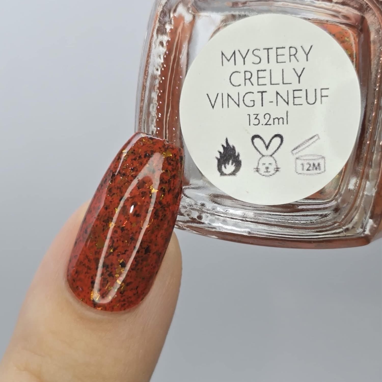 ‘Mystery Crelly Vingt-Neuf’ features green-gold color-shifting metallic flakies and black flakies in a Sinopia orange crelly base!