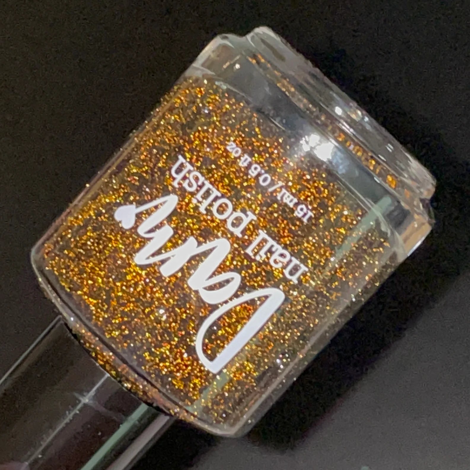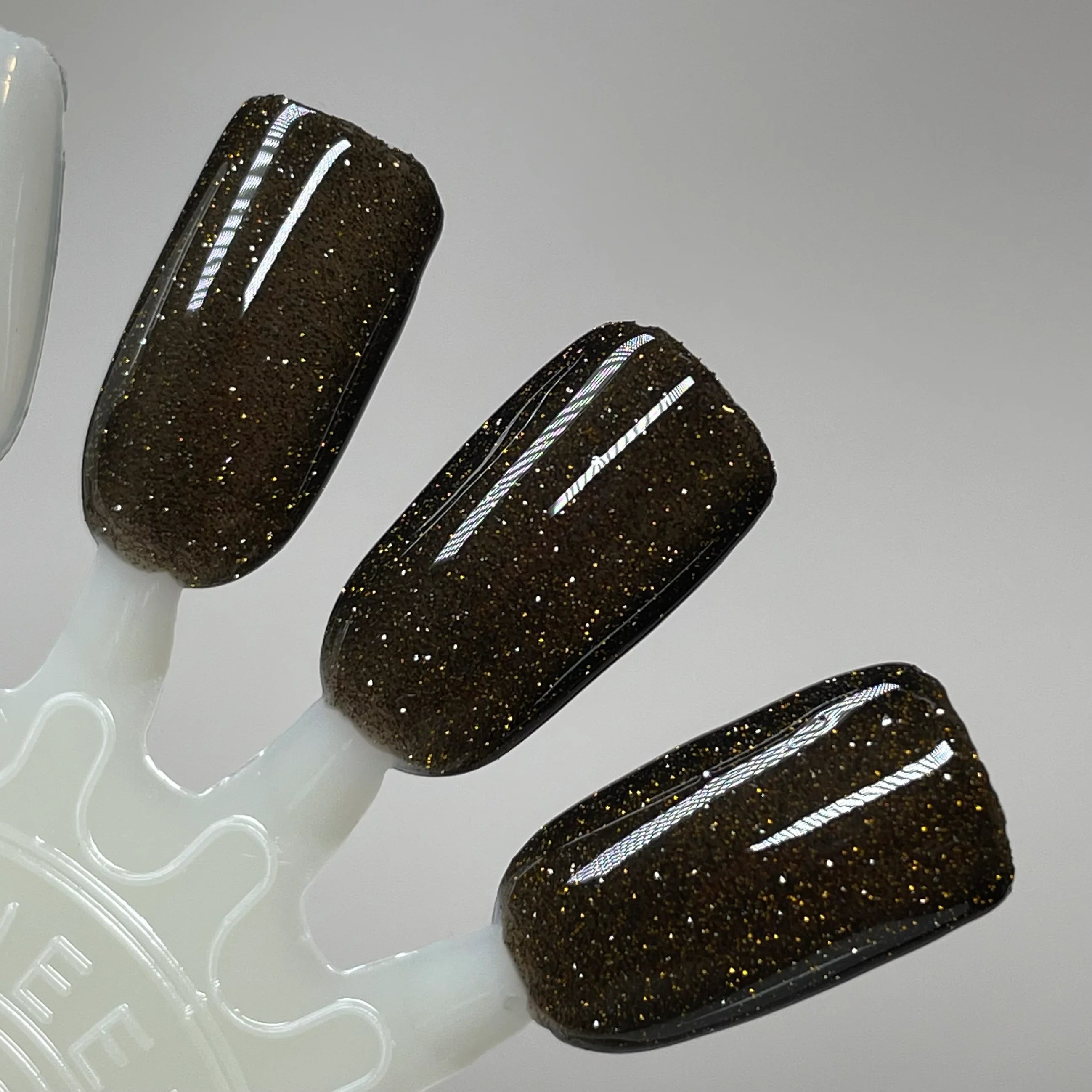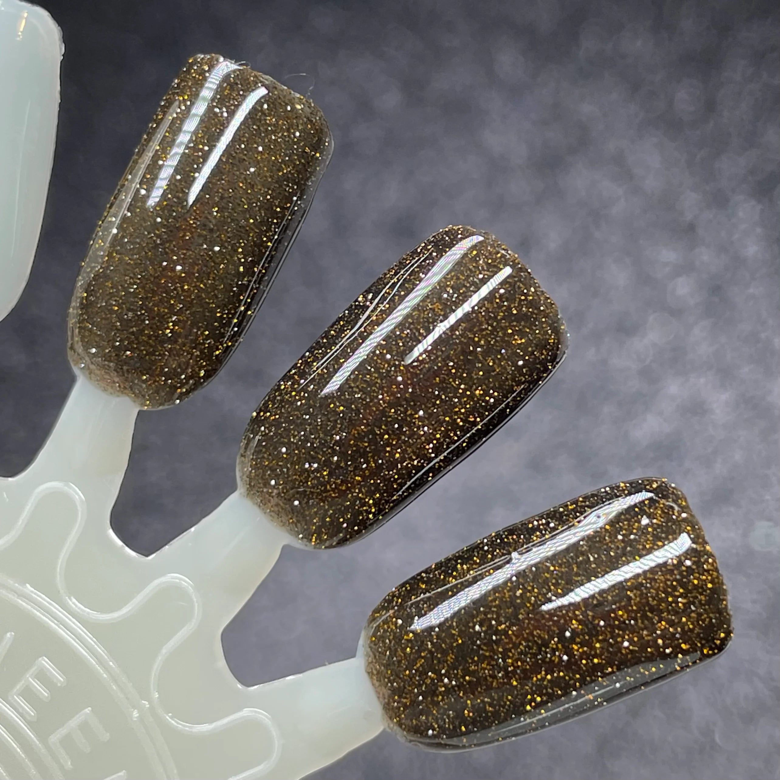 Sheer brown jelly with assorted gold and brown glitters with gold reflective glitters that come alive under bright lights.