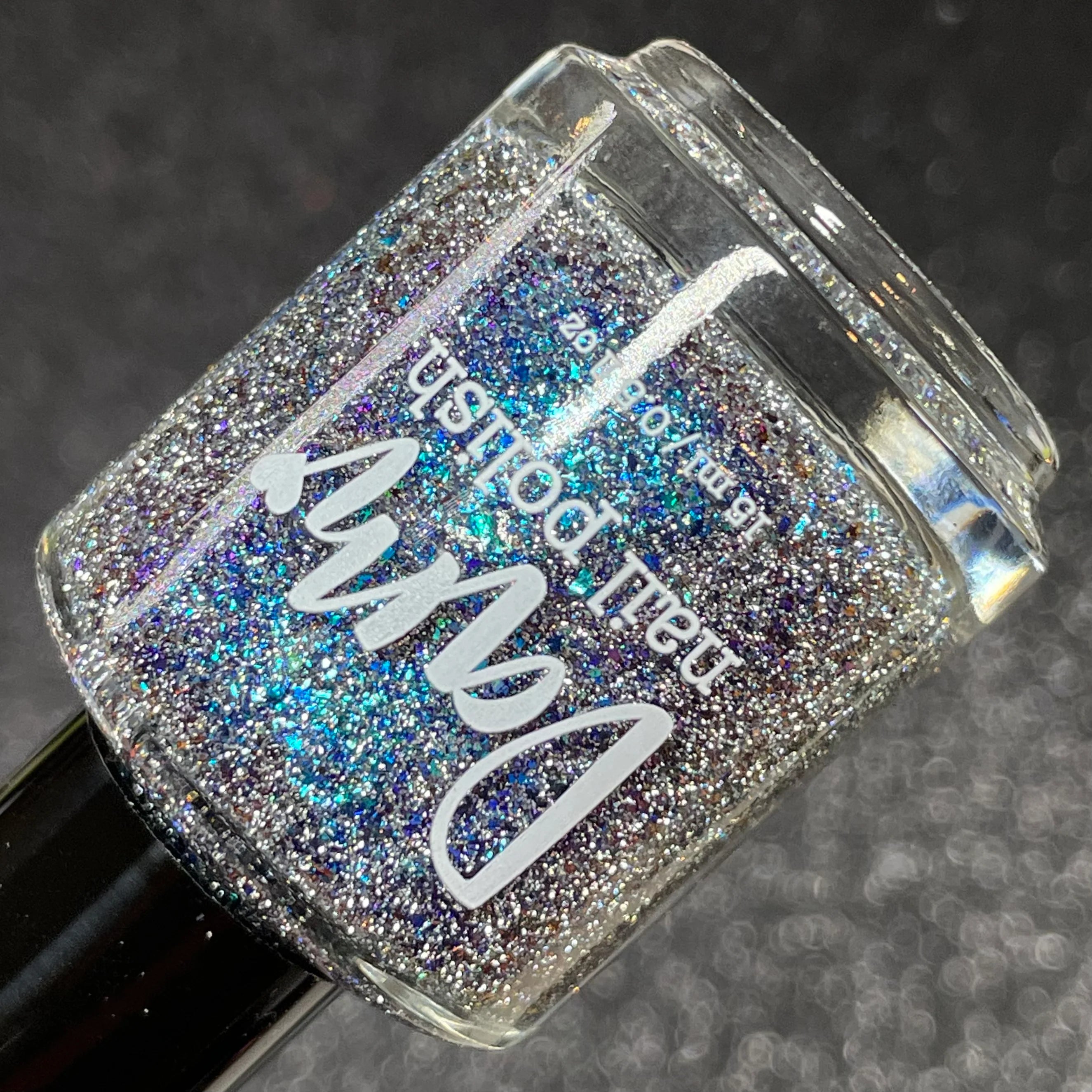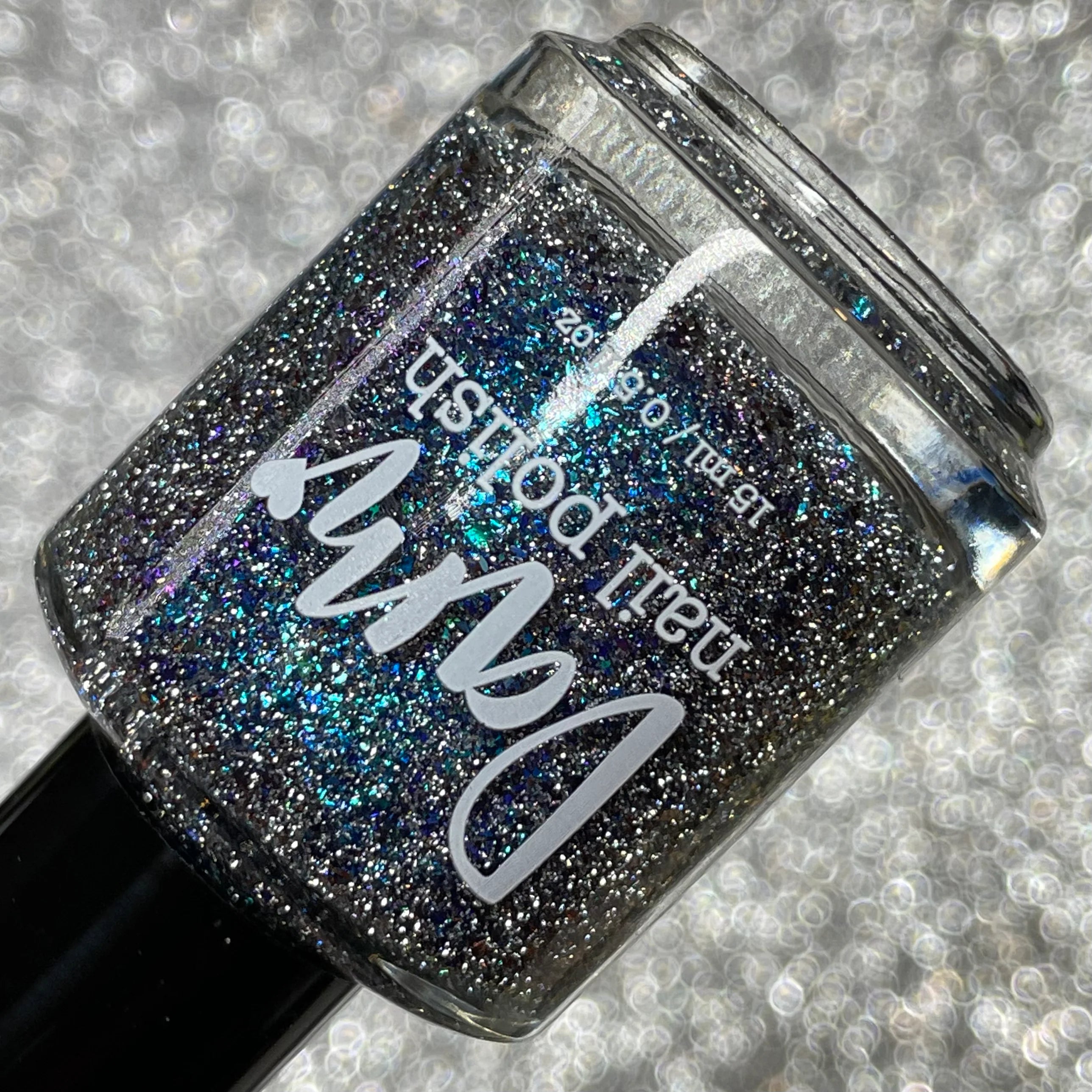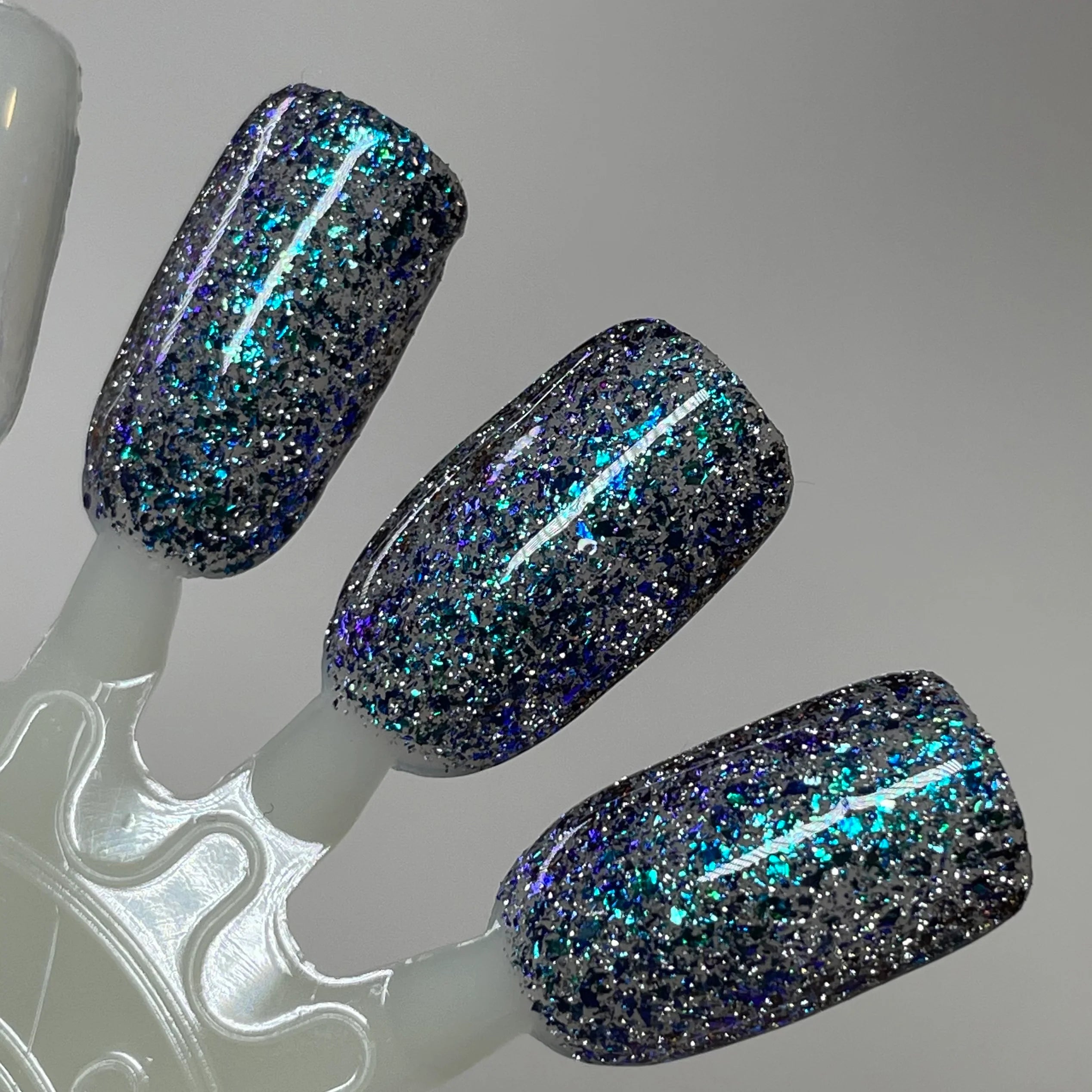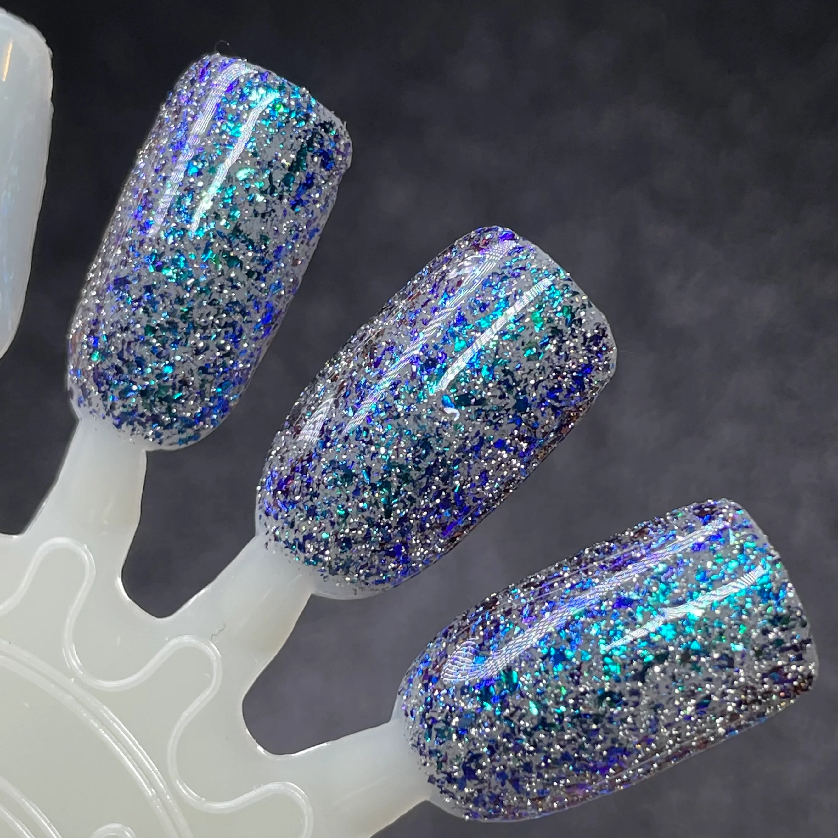 Teal, blue, and purple shifting flakes with silver reflective glitters.