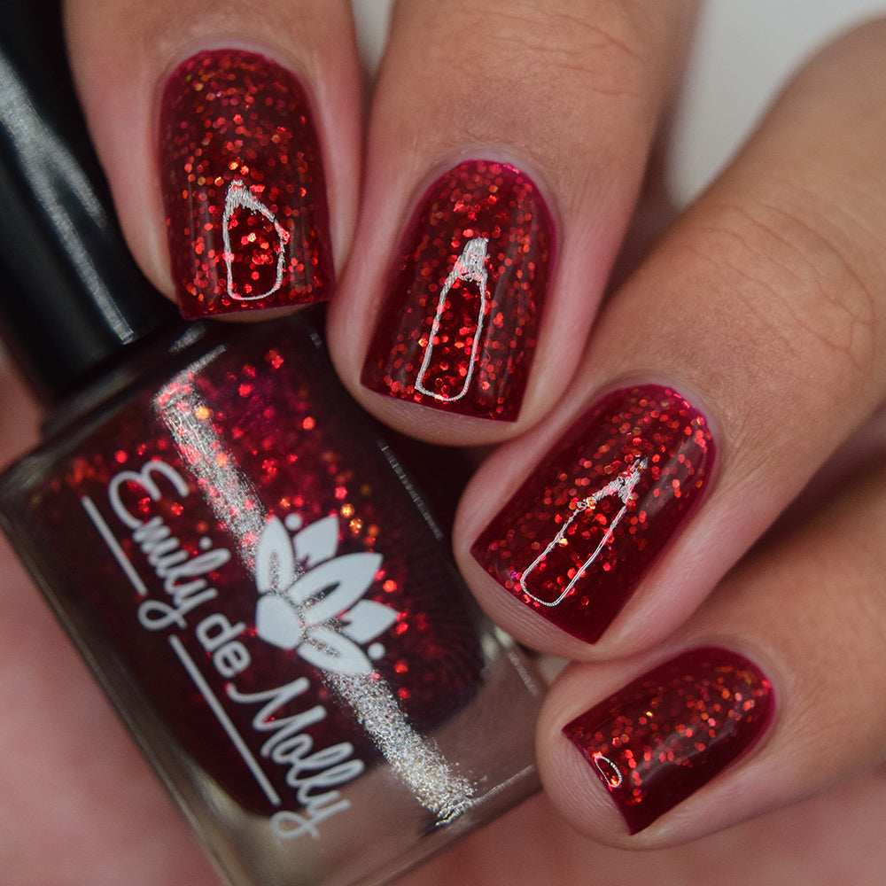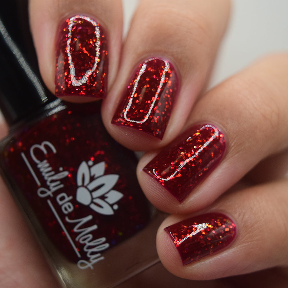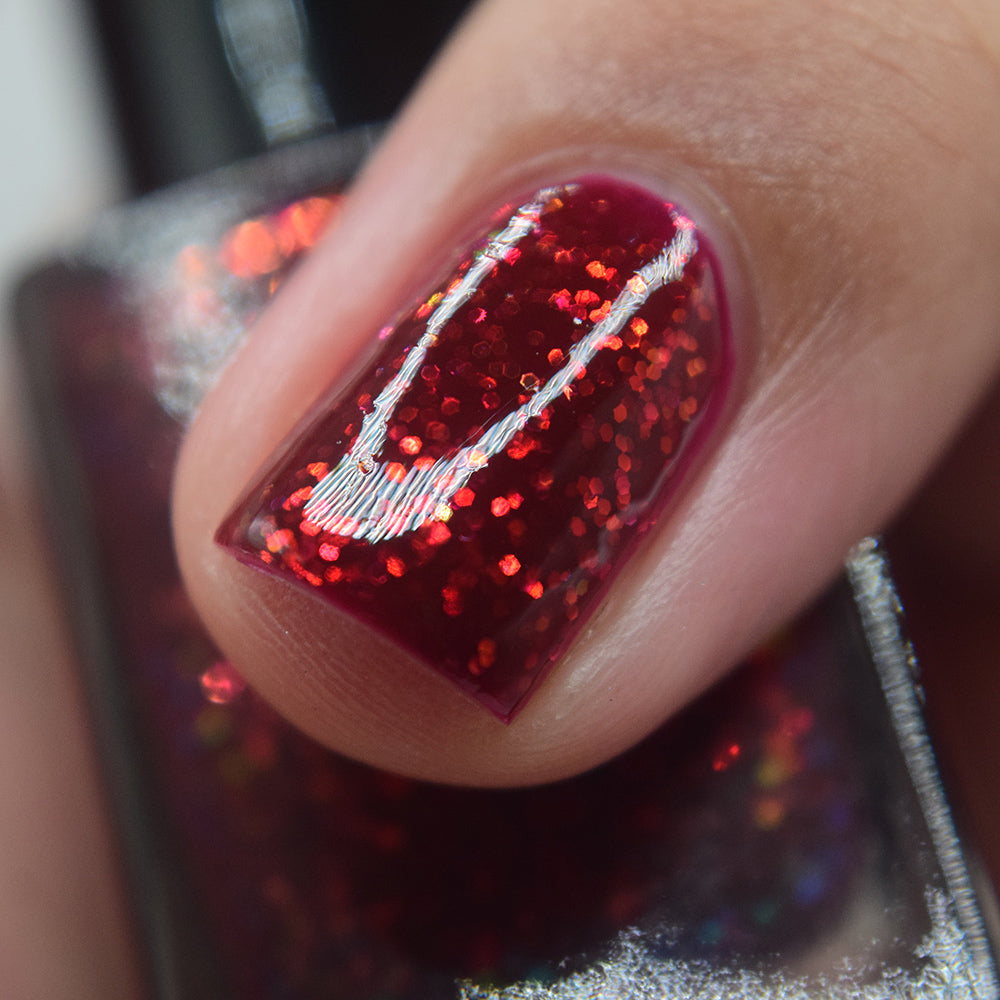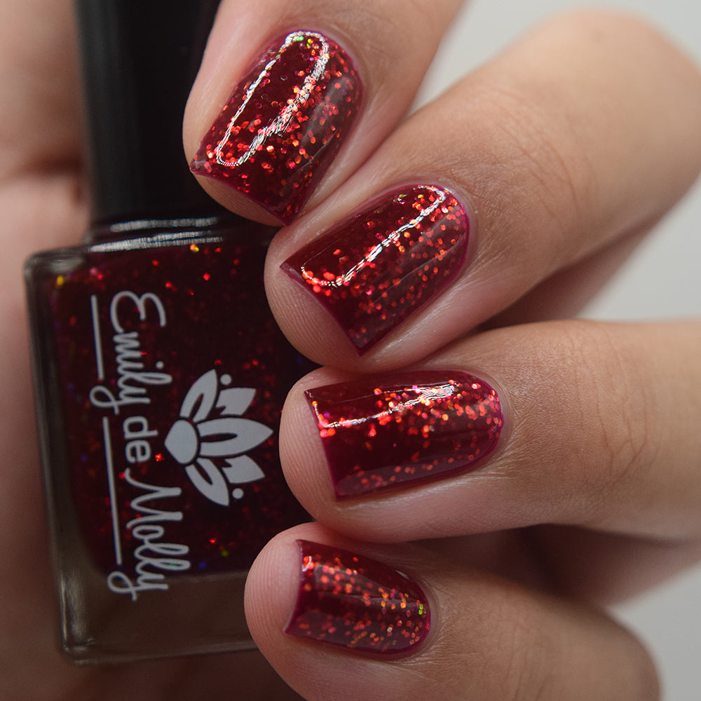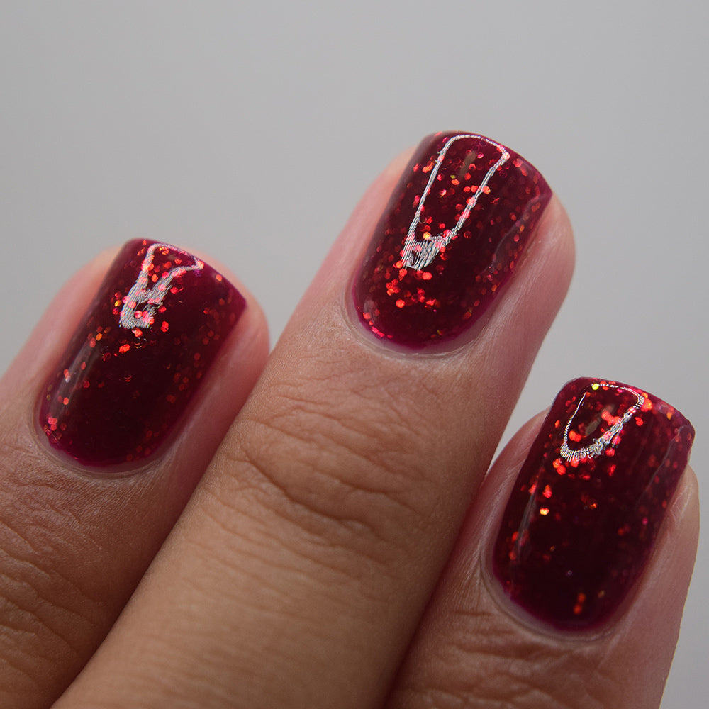 A deep red nail polish filled with orange to gold iridescent glitters.
