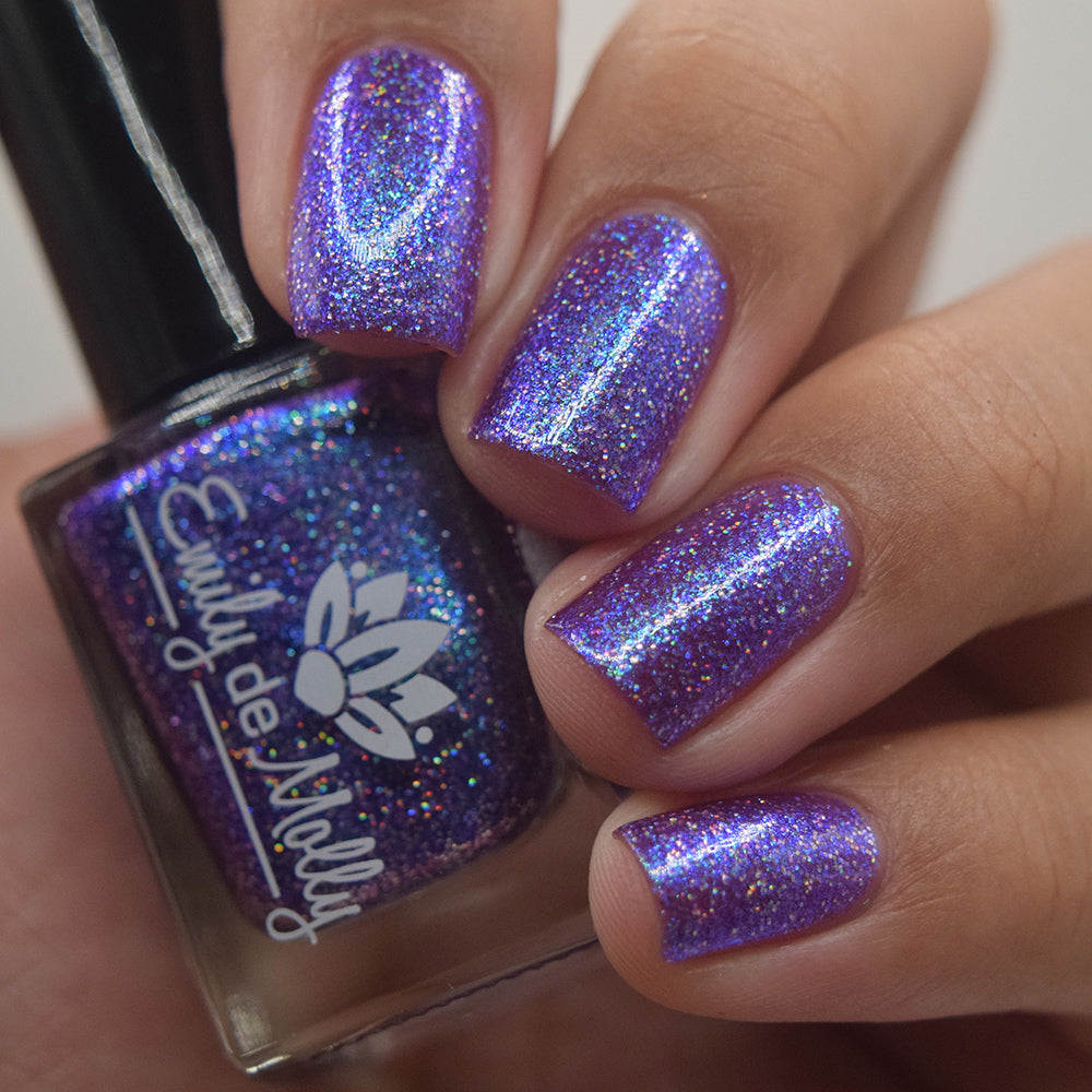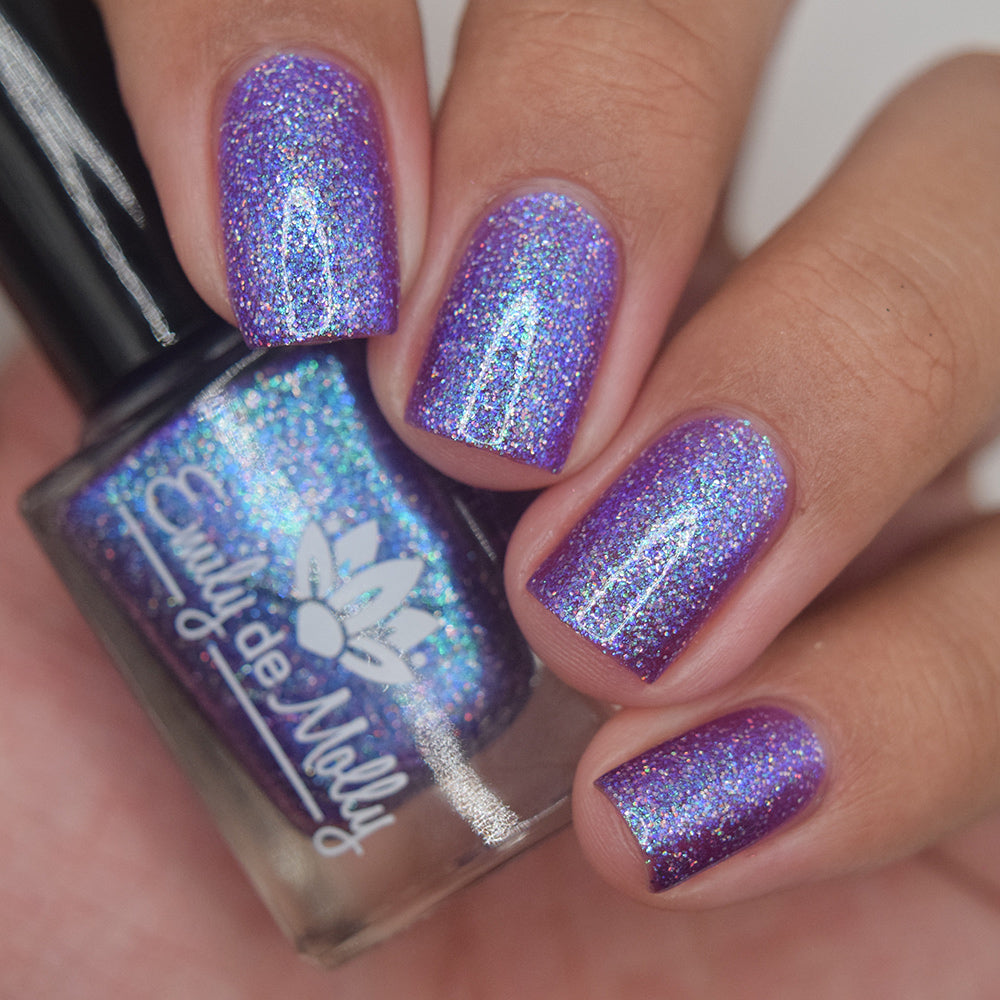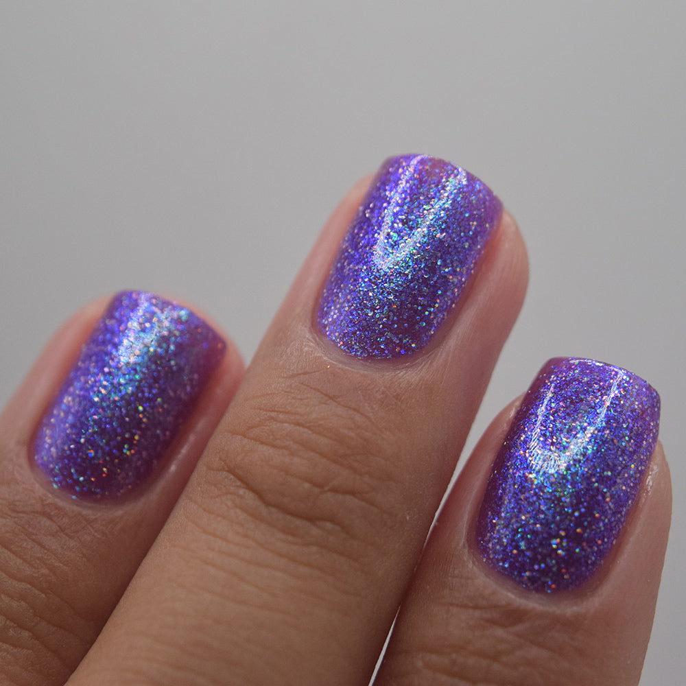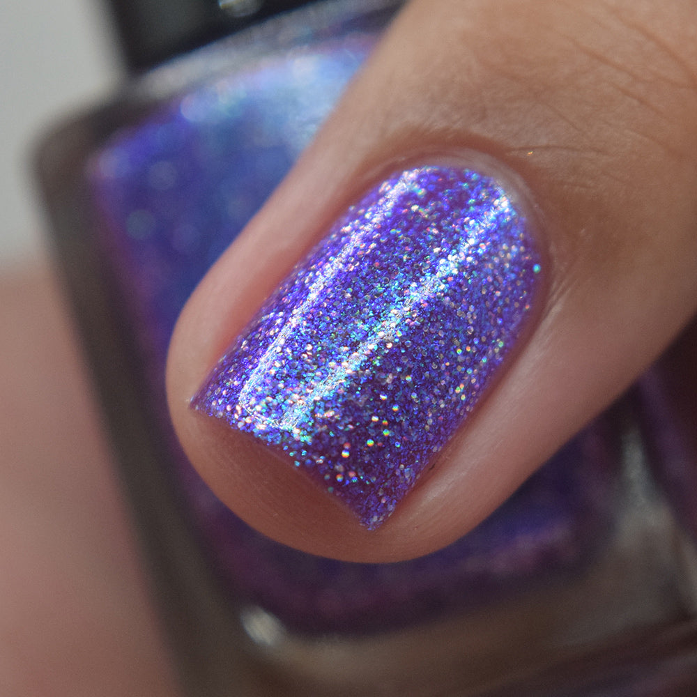 A purple nail polish with a blue to purple shifting aurora shimmer and silver holographic micro glitters.