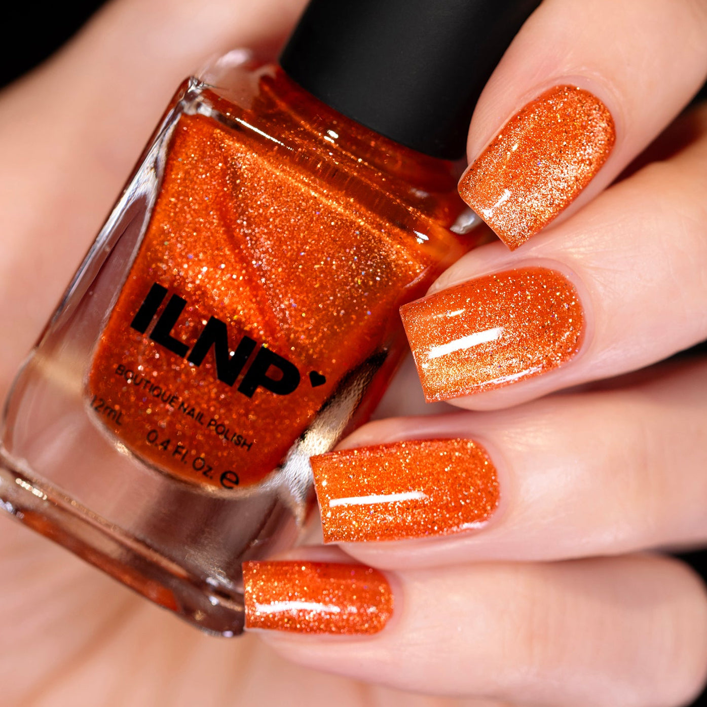 Juicy orange glows with warmth as holographic sparkle dances like sunlit bubbles, accented by a light scattering of reflective silver flakes. Magnetic shimmer threads through the base, lighting up bright citrus-orange tones that feel lighter and more radiant with every shift. Playful and radiant, Orange Pop delivers a citrusy burst of color that will keep you coming back for more.