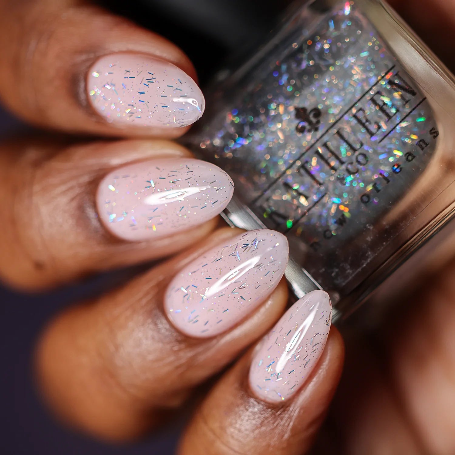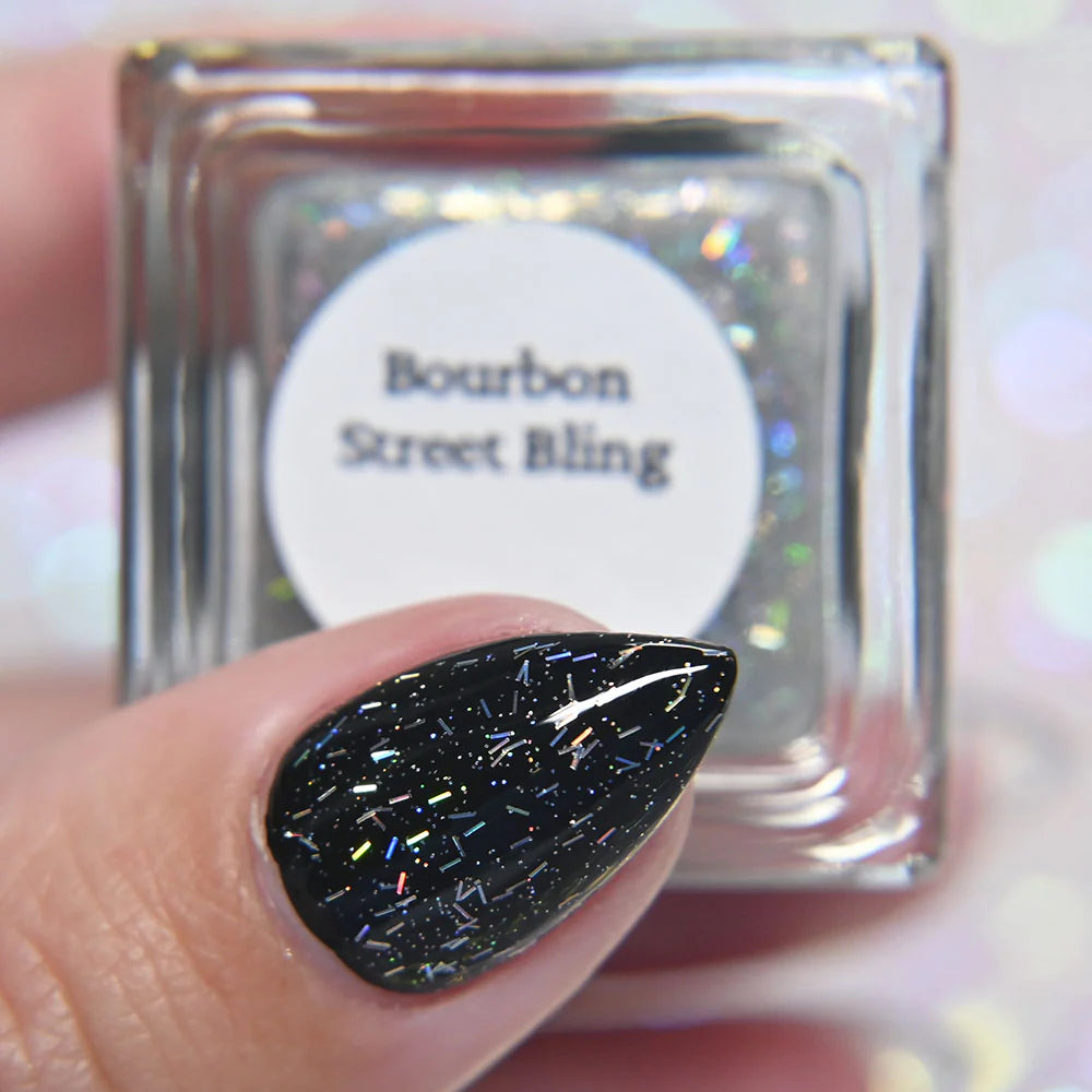 Bourbon Street Bling is a fun holo topper with tiny holographic bar glitters and holo microglitters. This is meant to be worn over other polishes.