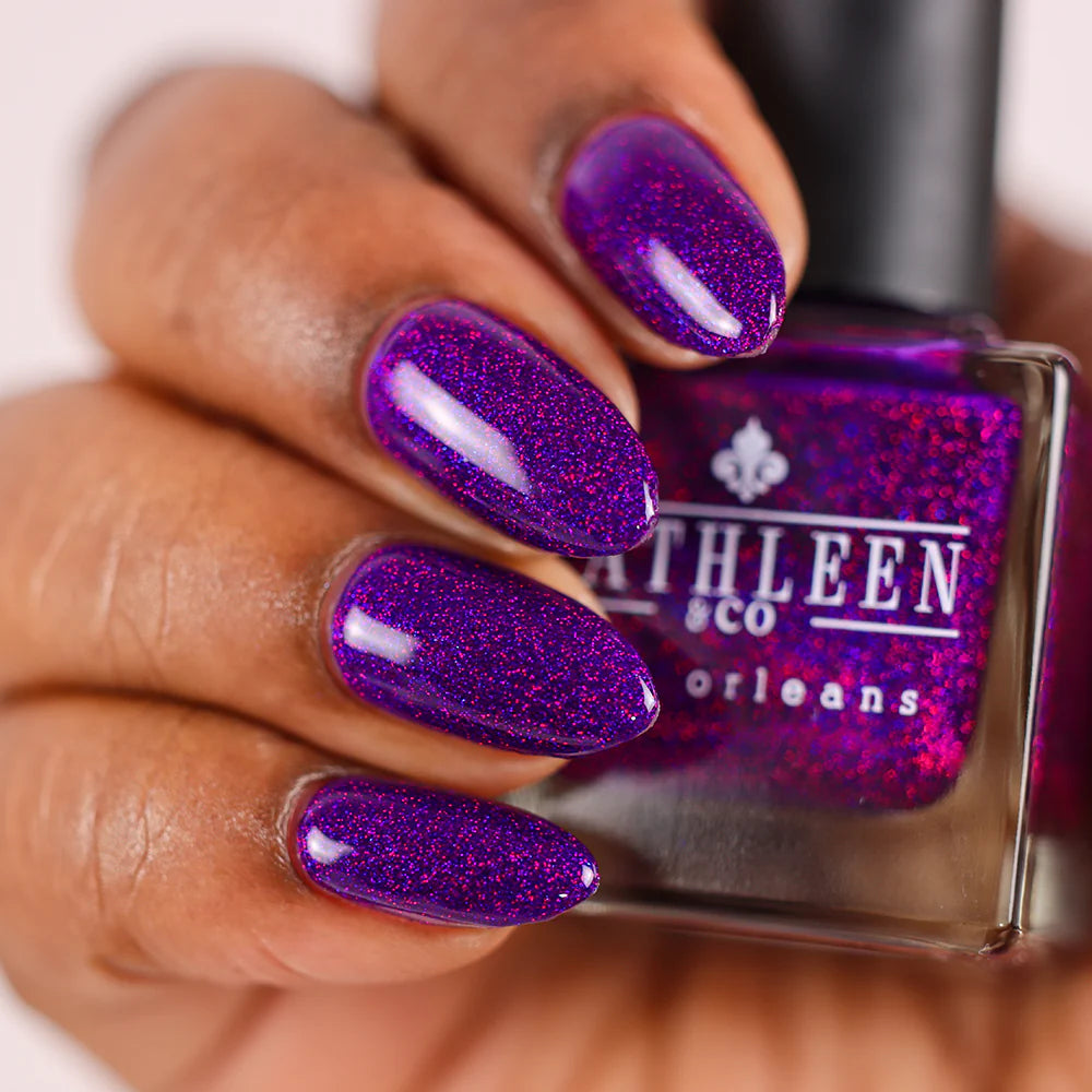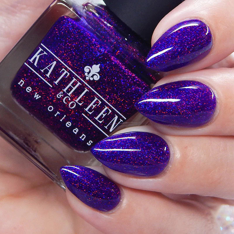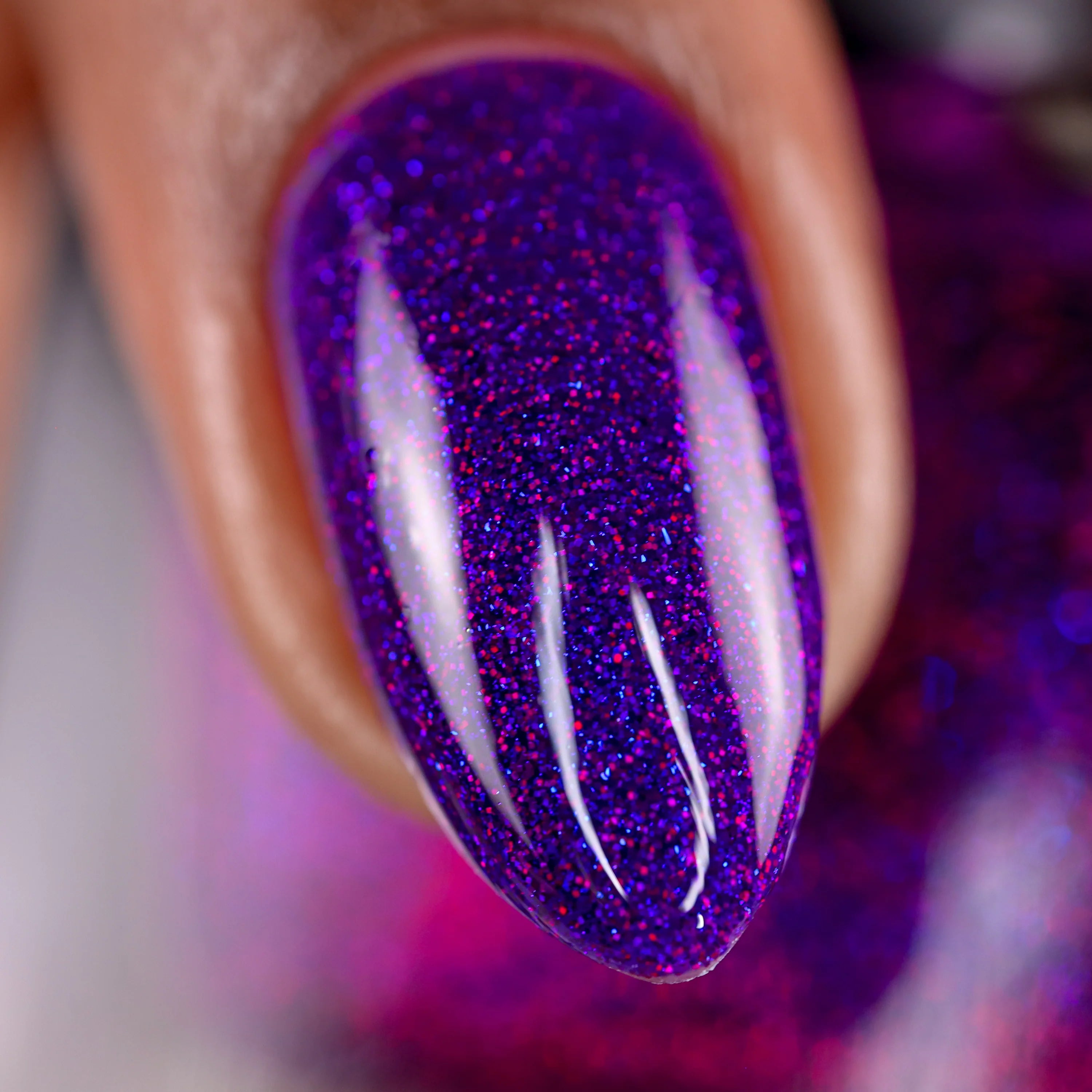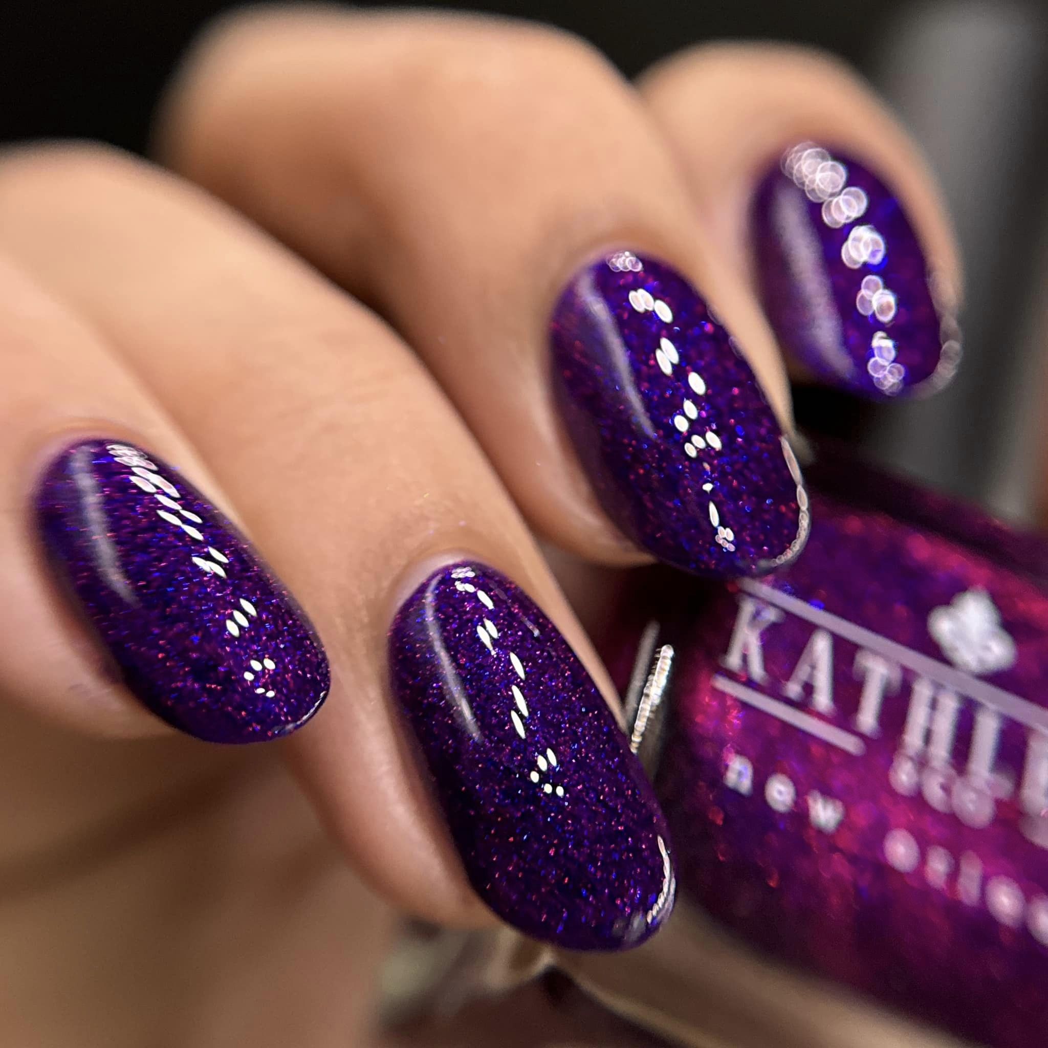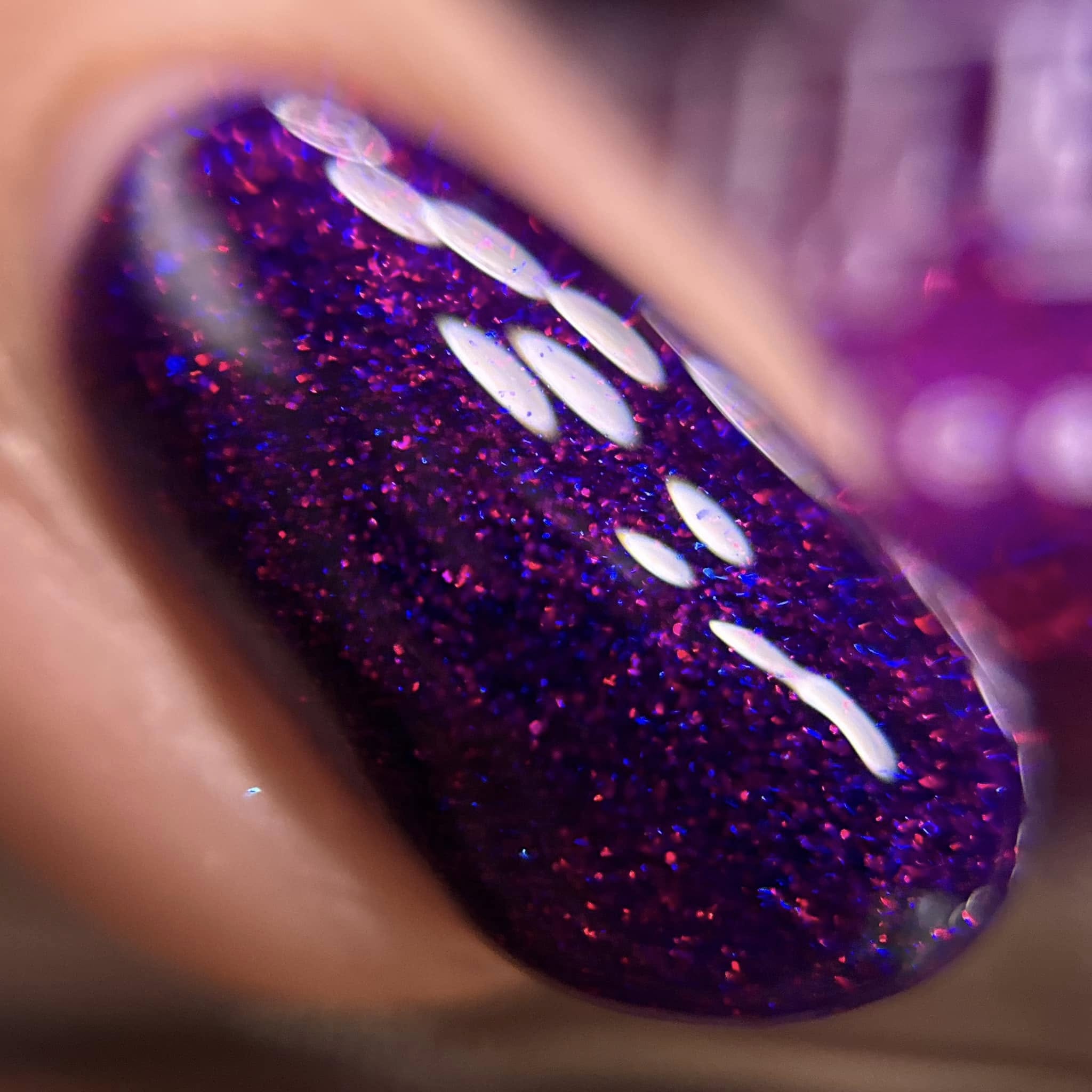 Electric Lights On Strings - a deep violet base with blue/purple shimmer and fucsia holographic microglitters. This will need a good top coat as it does dry down somewhat satin finish.