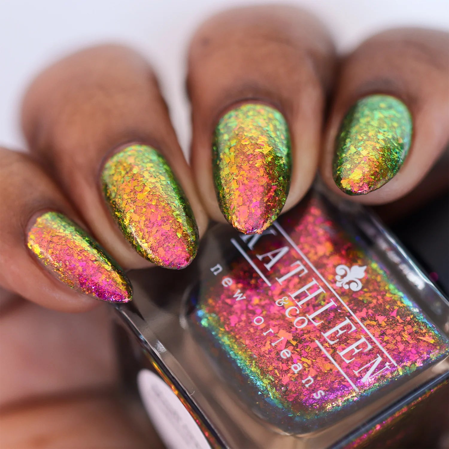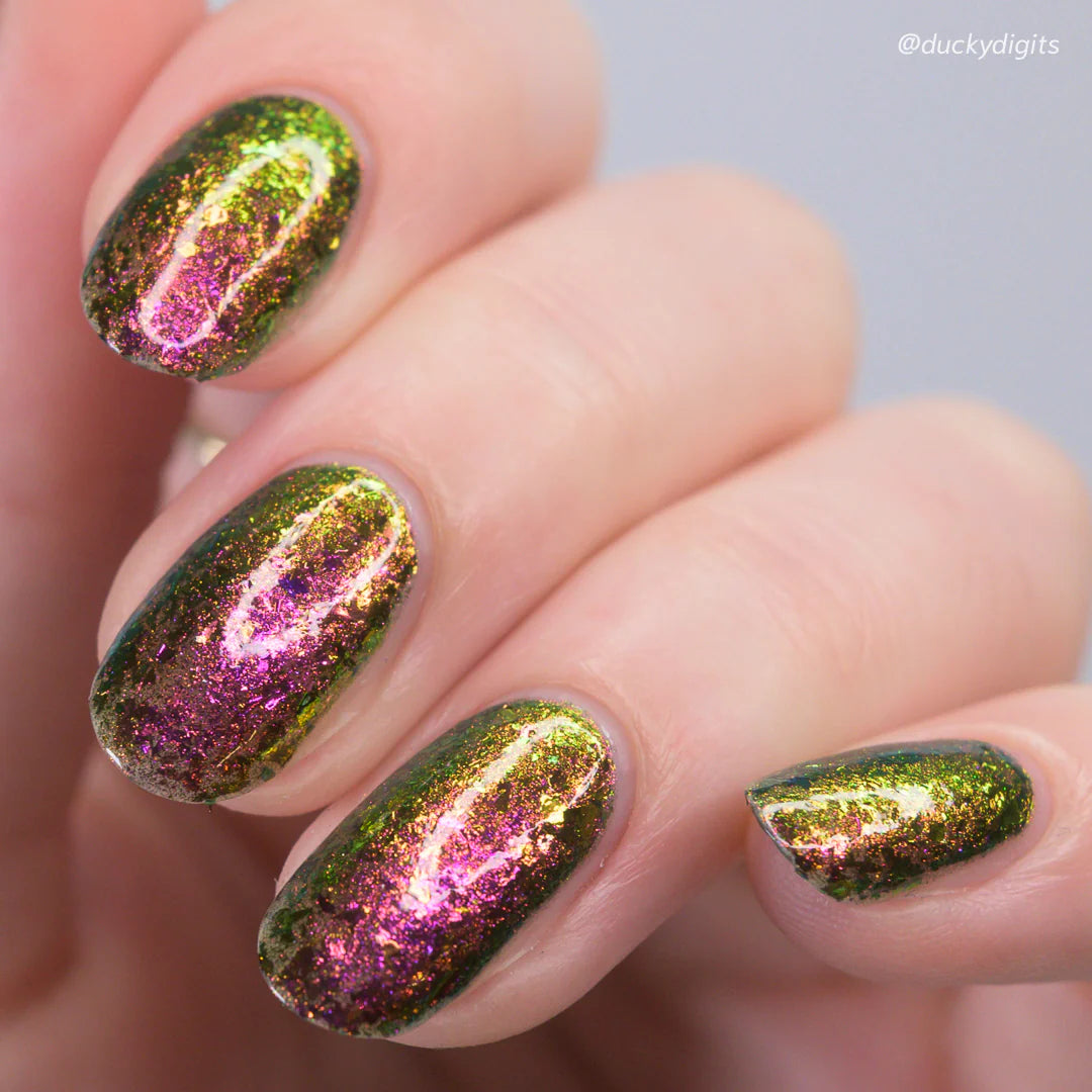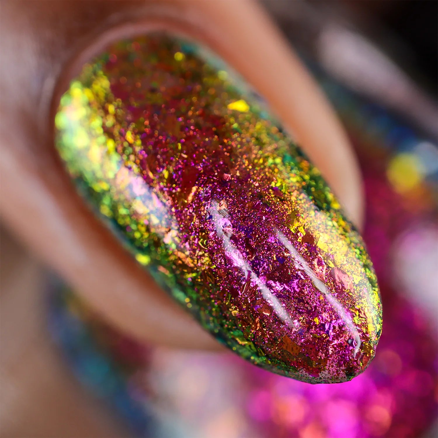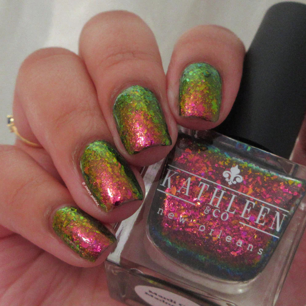 Mardi Gras Madness is a fuchsia/gold/green multichrome flake in a clear base with an added dash of multichrome shimmer that shifts the same as the flakes.