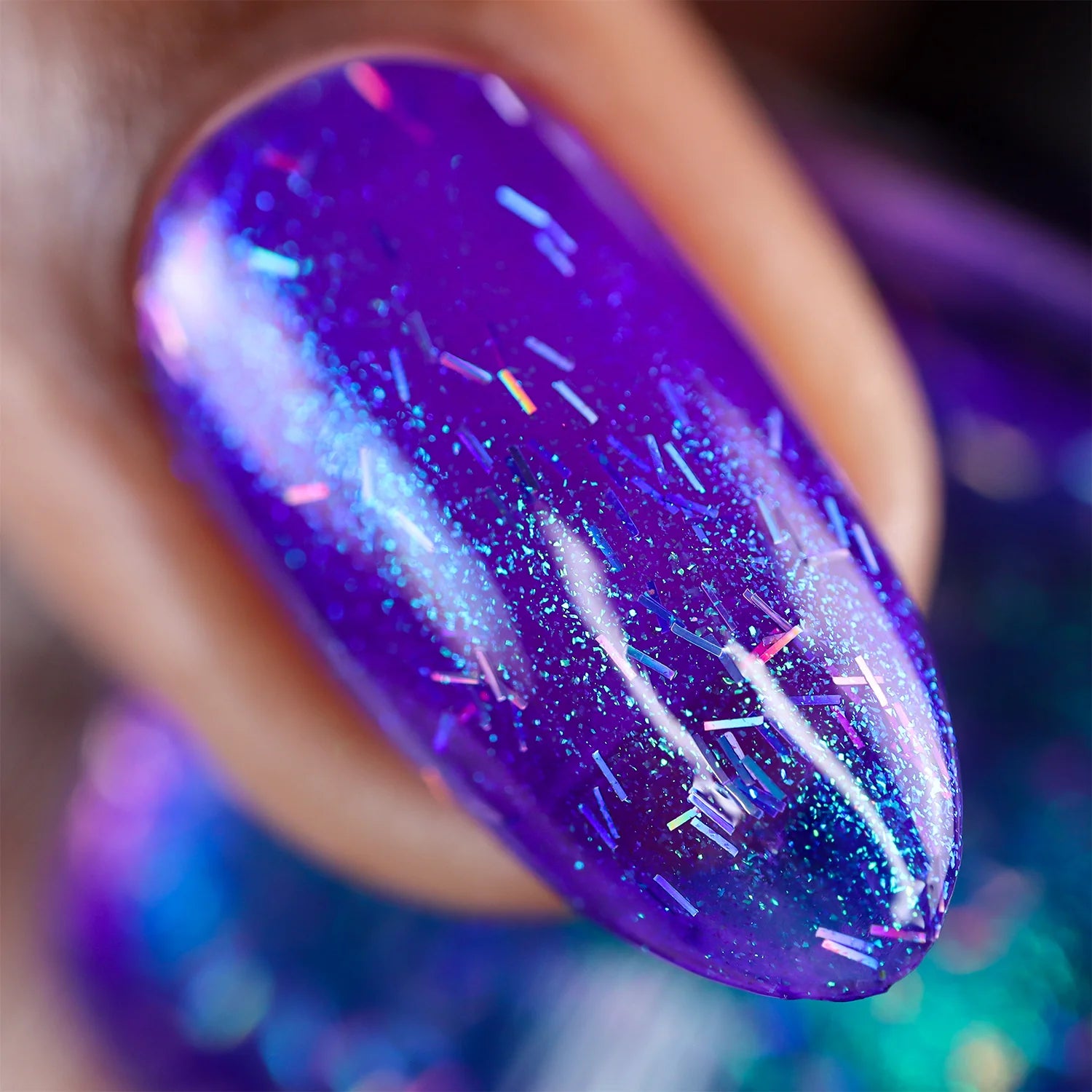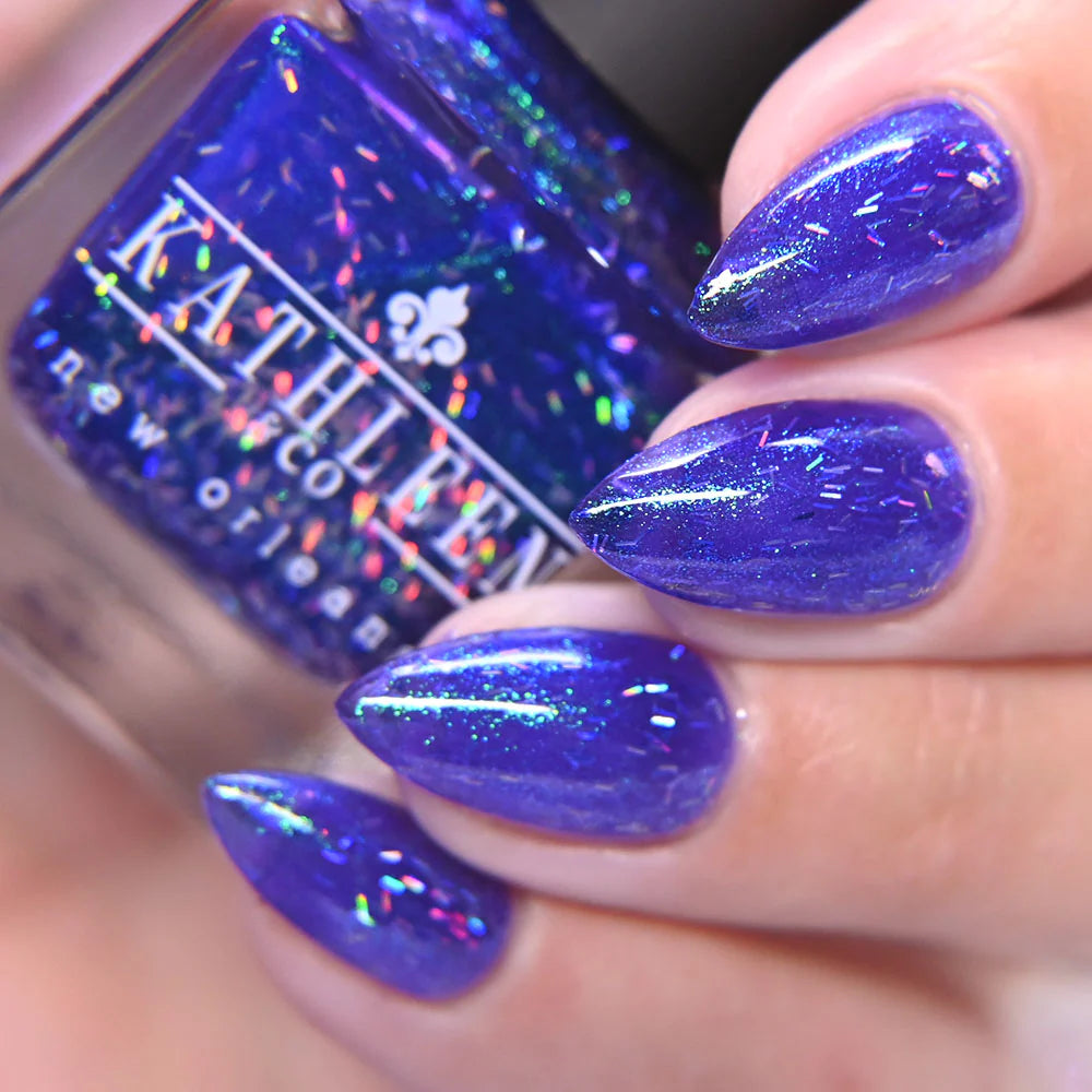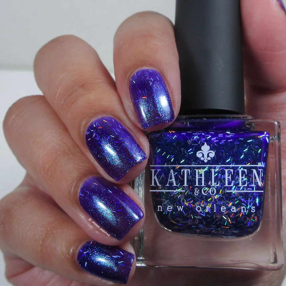 This super fun Mardi Gras polish starts with a violet base and has green shimmer and tiny holographic bar glitters.