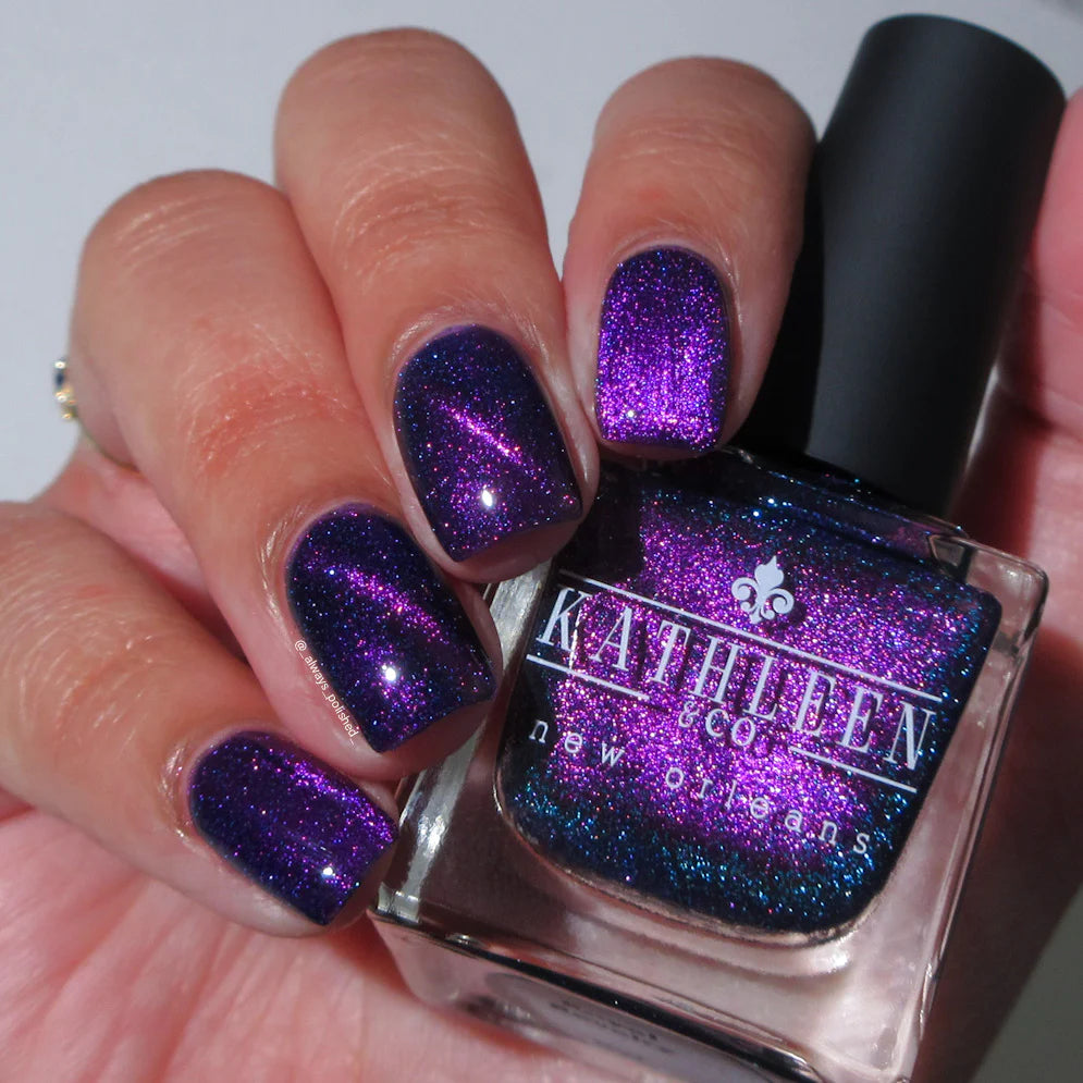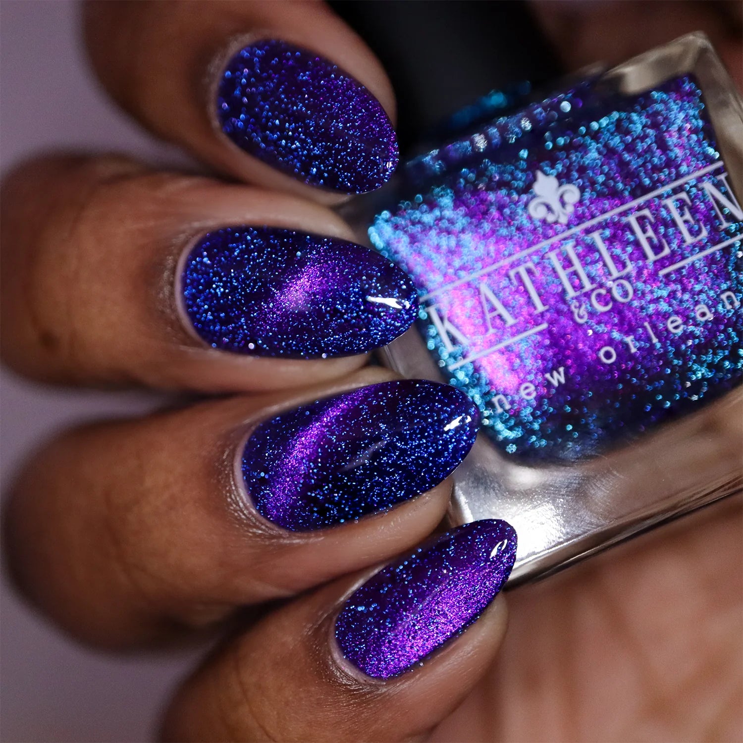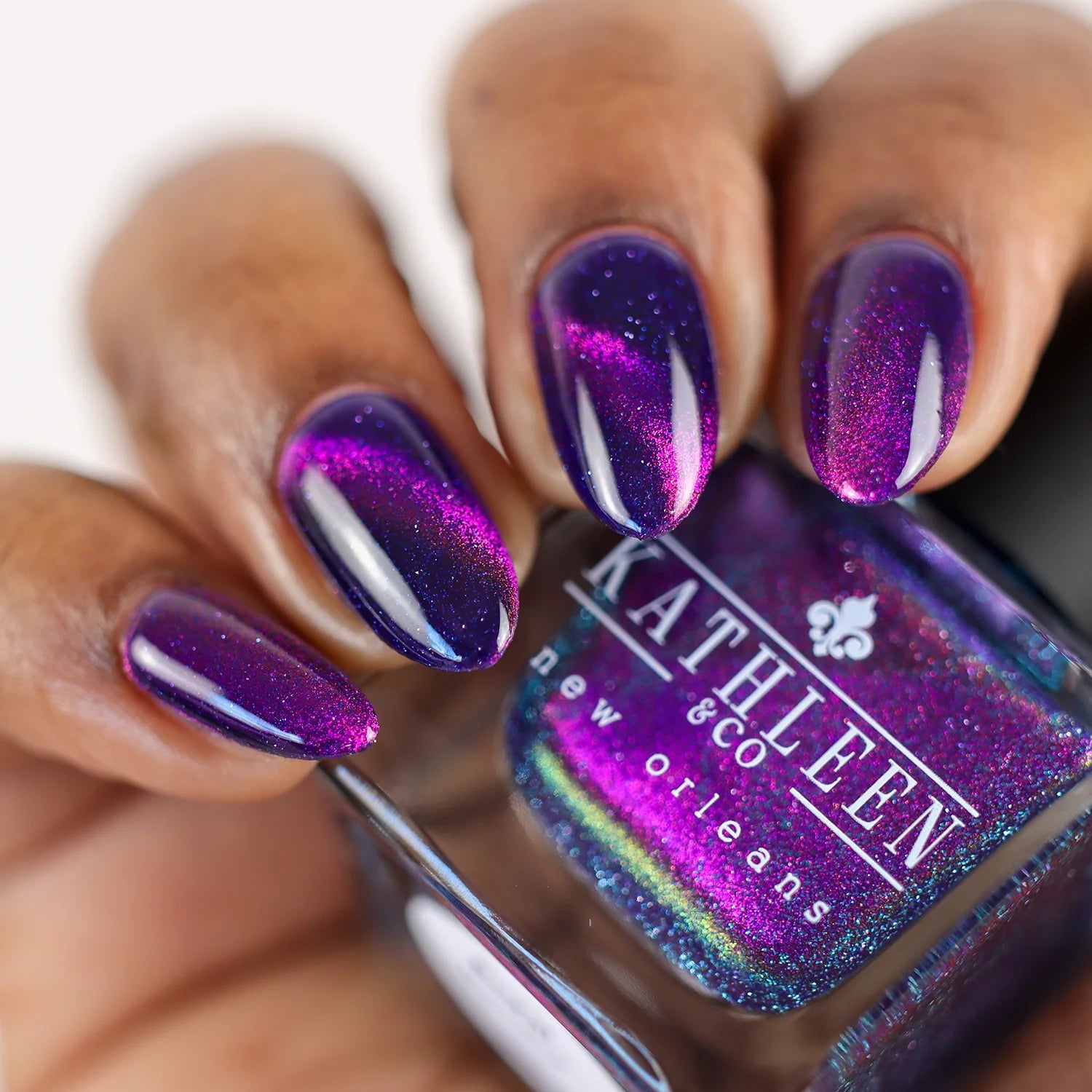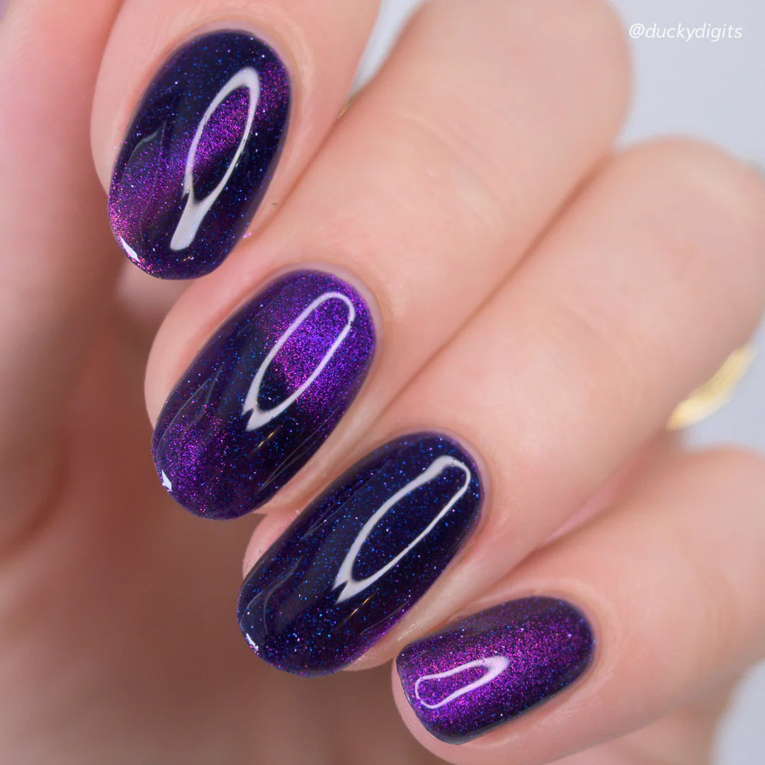 Royal Revelry - this magnetic has a blackened base with purple/pink magnetic pigment with aqua reflective microglitters