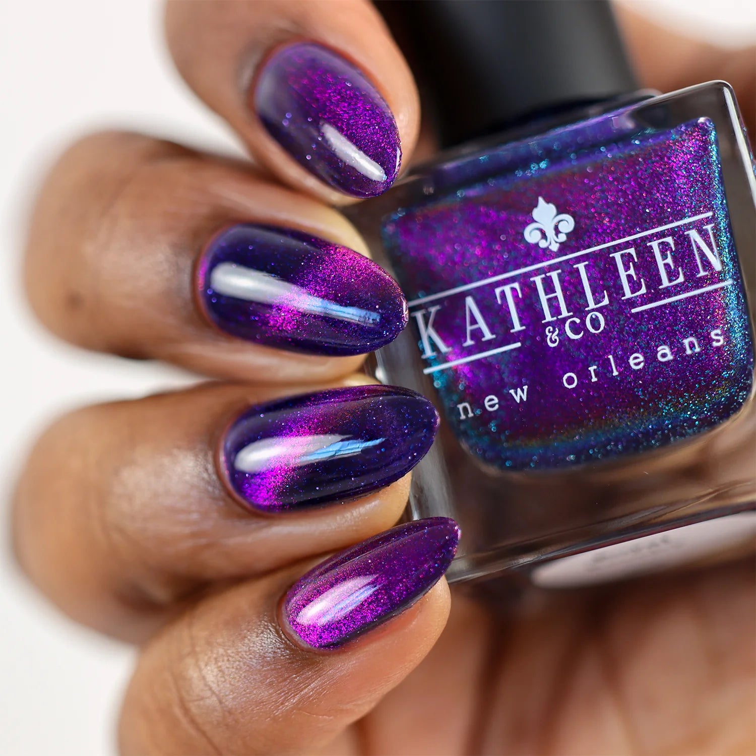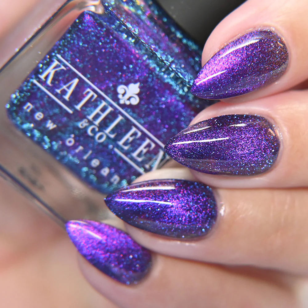 Queen Of The Ball is a beautiful grape purple with large particle violet/pink shifting shimmer and bright green reflective glitters.