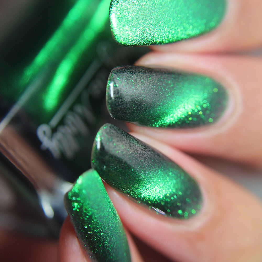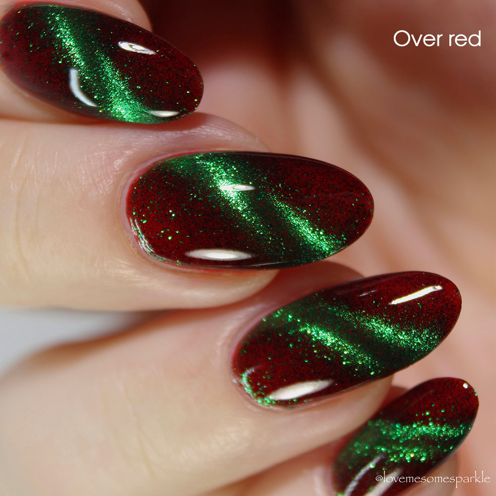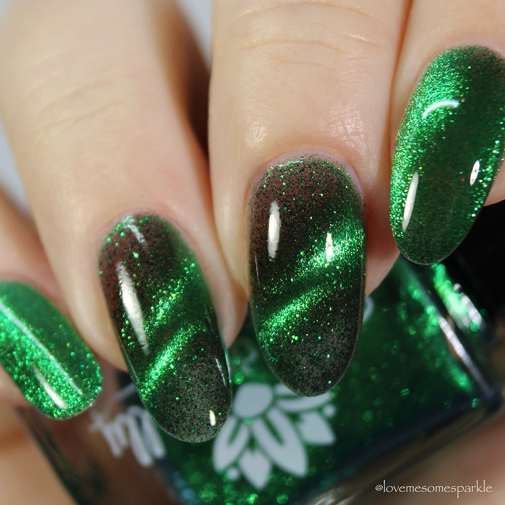a black polish with red to green UP and a mosaic magnetic that upon first glance looks like an ordinary pink multichrome. When magnetized you will see both a bright pink...