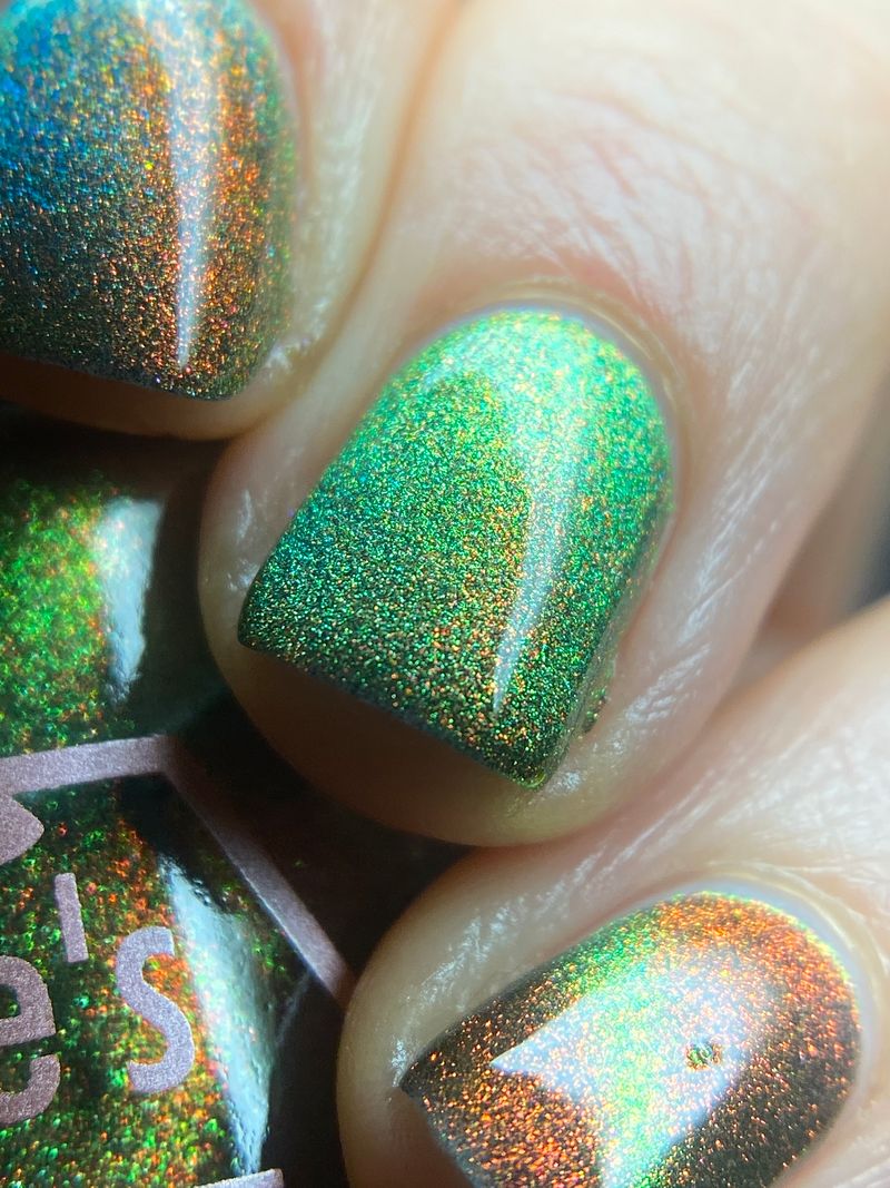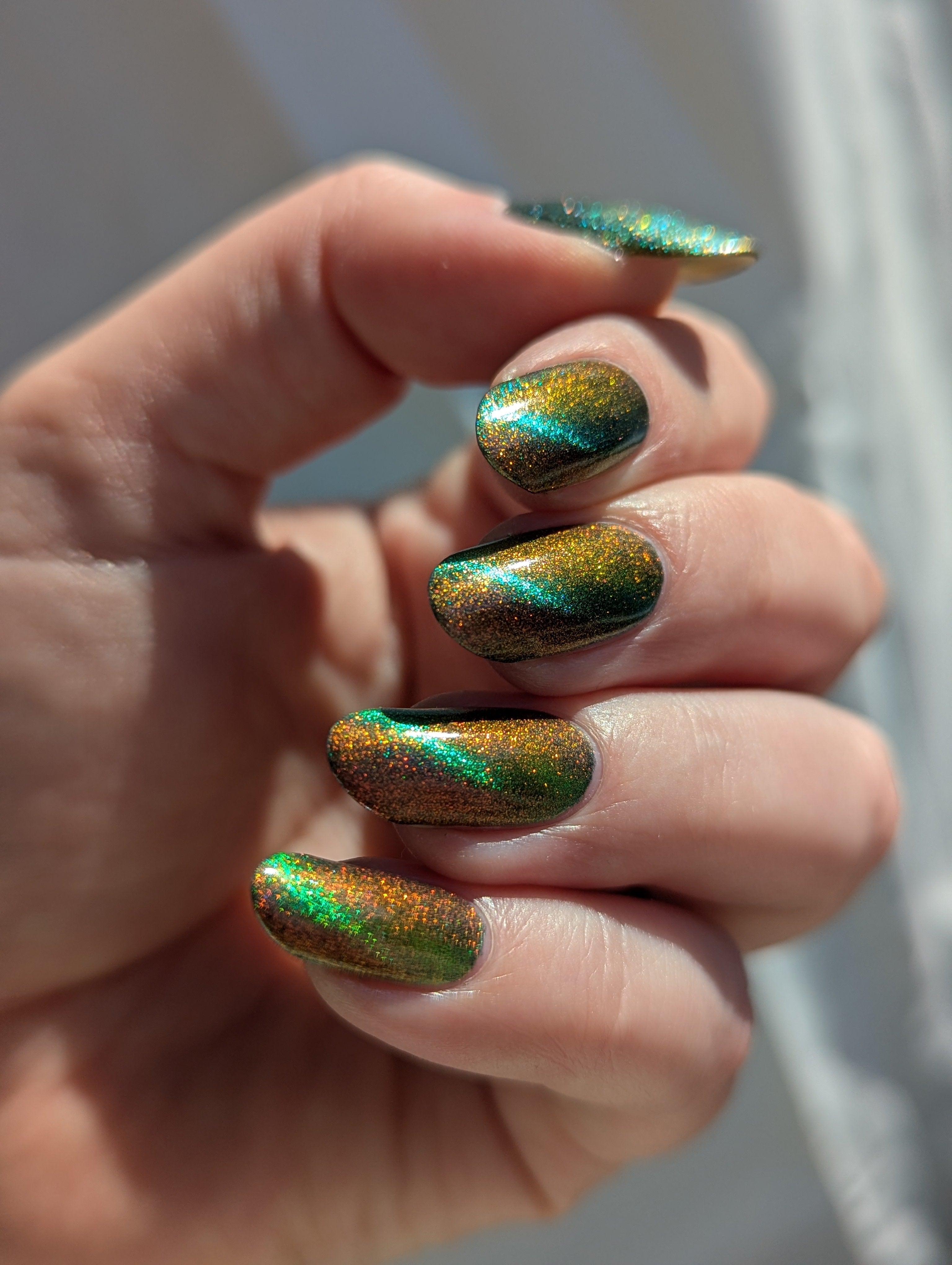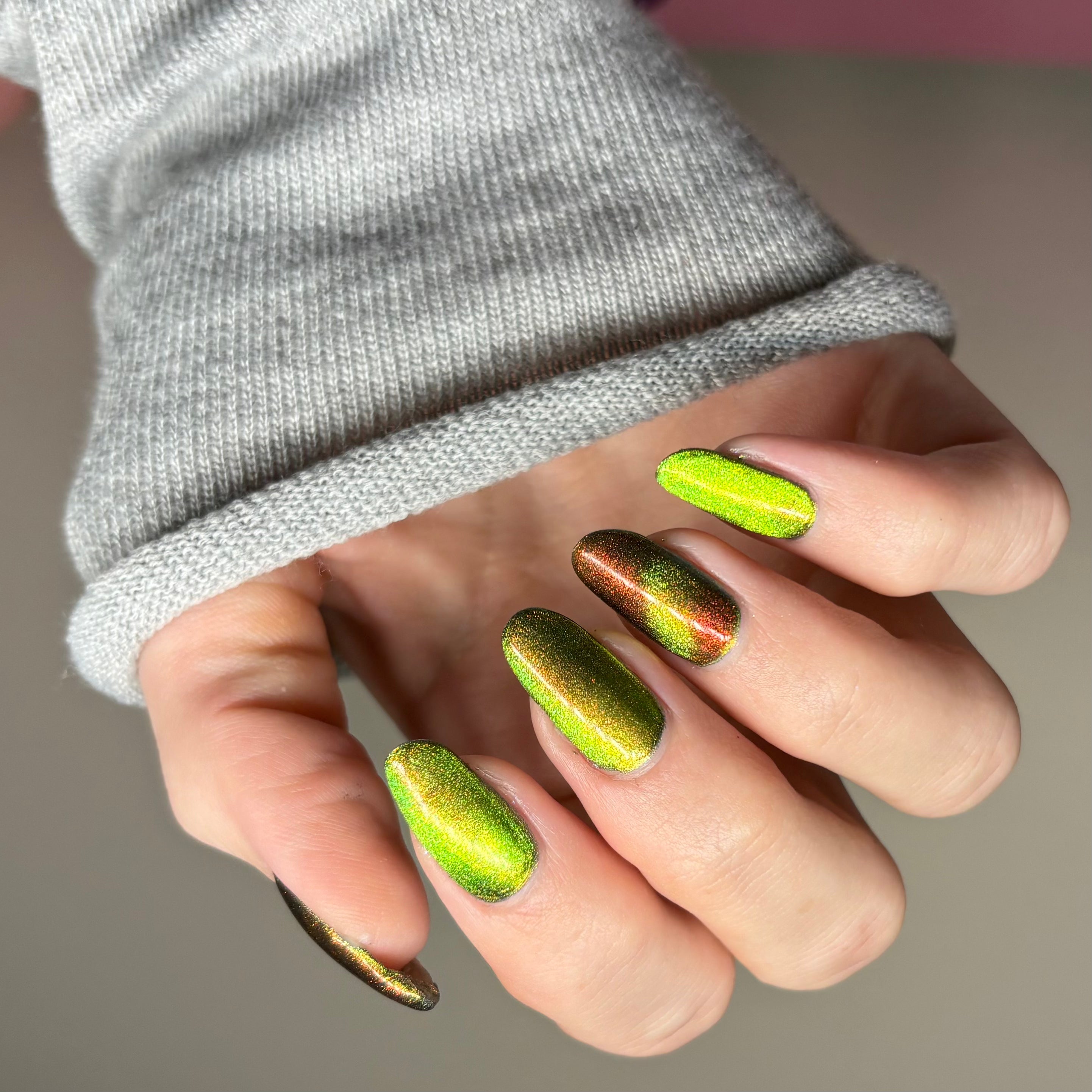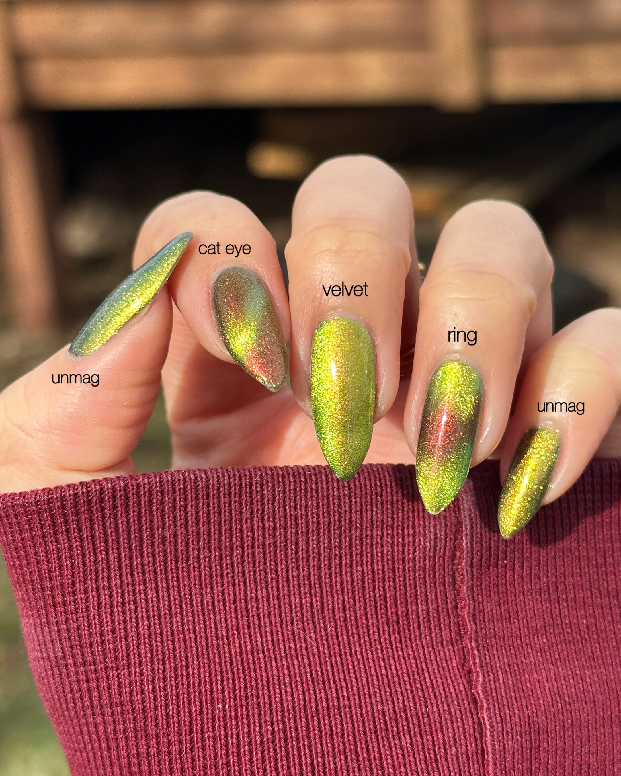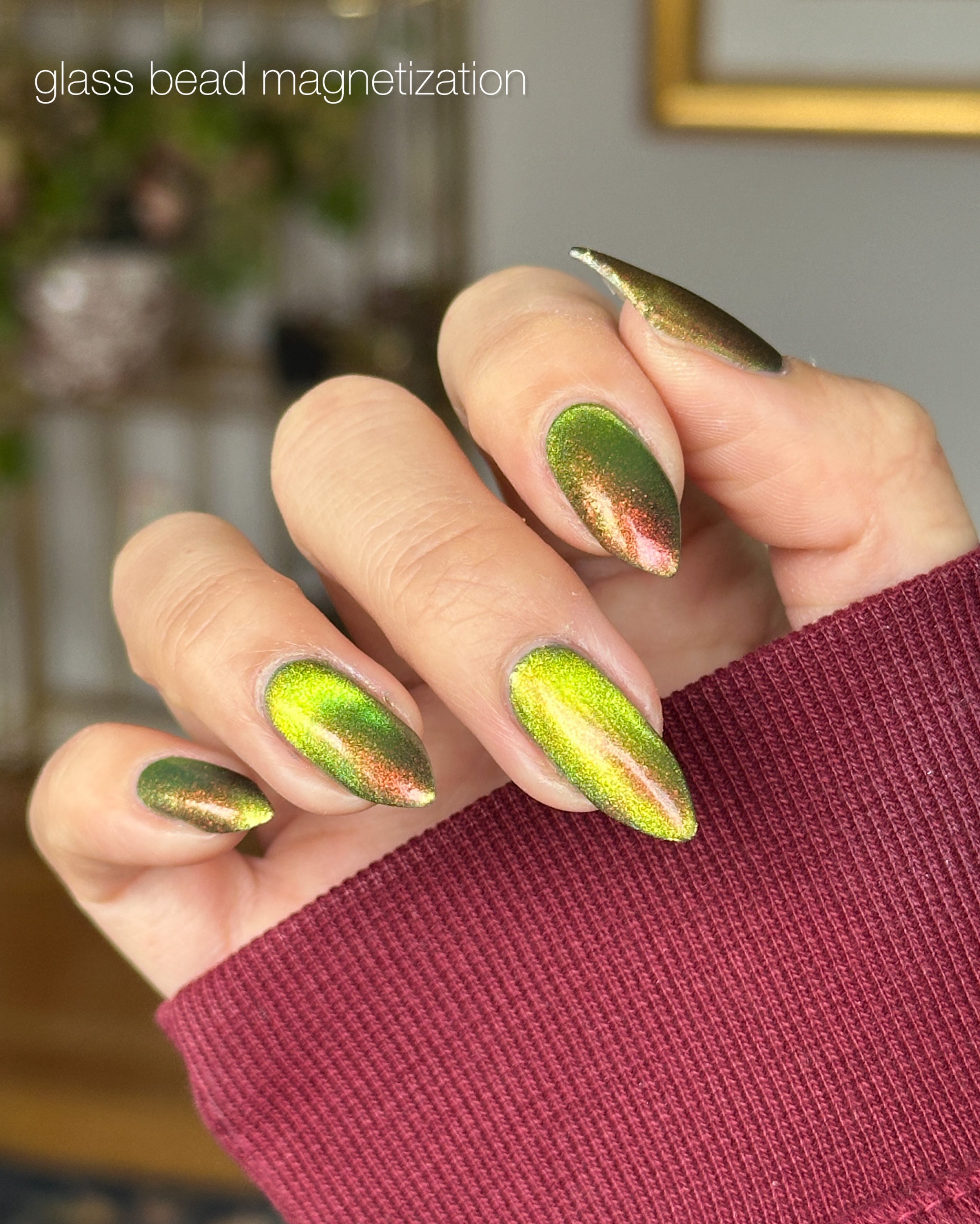 a black polish with red to green UP and a mosaic magnetic that upon first glance looks like an ordinary pink multichrome. When magnetized you will see both a bright pink...