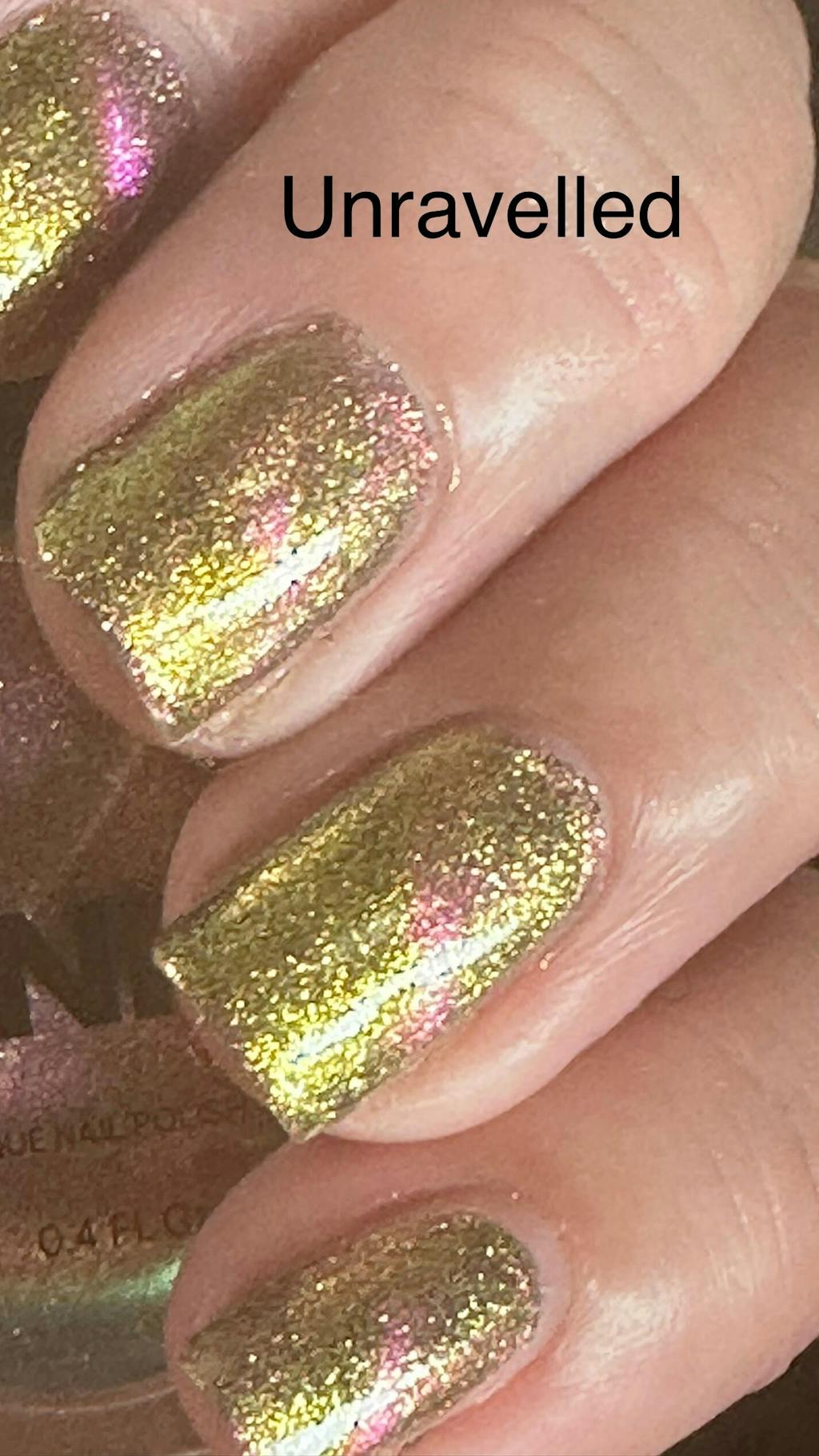 Unraveled spirals from molten gold to hints of green before bursting into vivid pink and purple. Magnetic pigment ripples across the surface like a thread pulling loose, shimmer catching every step of the unraveling. What starts seemingly put-together, Unraveled then shows you what it looks like to let go.