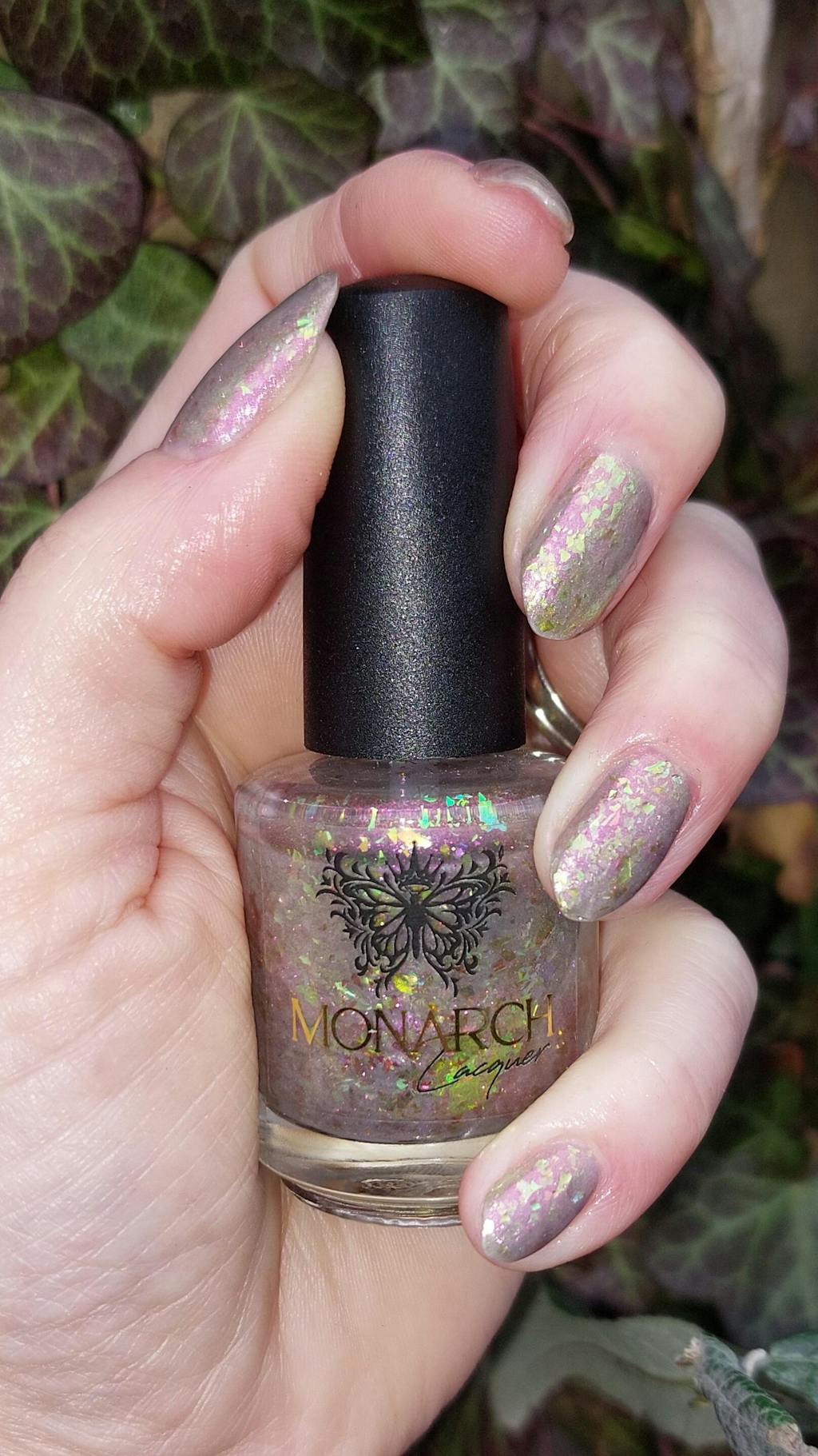 This is hard to photograph. Green/gold flakies with a pink shimmer. Saw it described elsewhere as a prugly and I get none of the ugly? My first Monarch lacquer and I couldn't be more pleased!